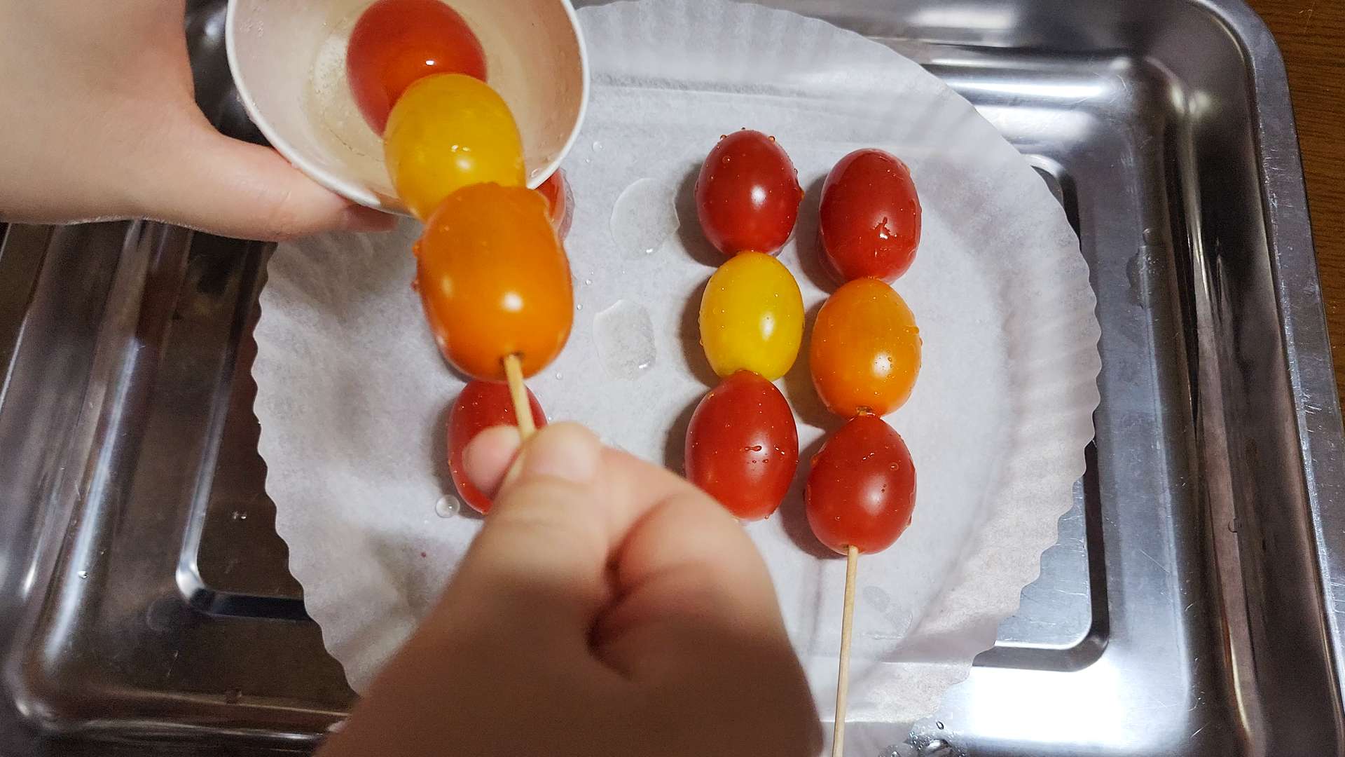 나무꼬지에 방울토마토를 끼워줍니다.