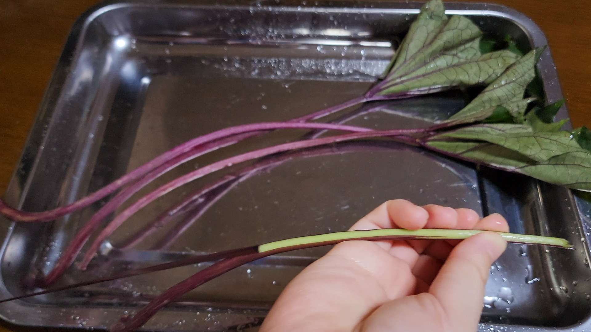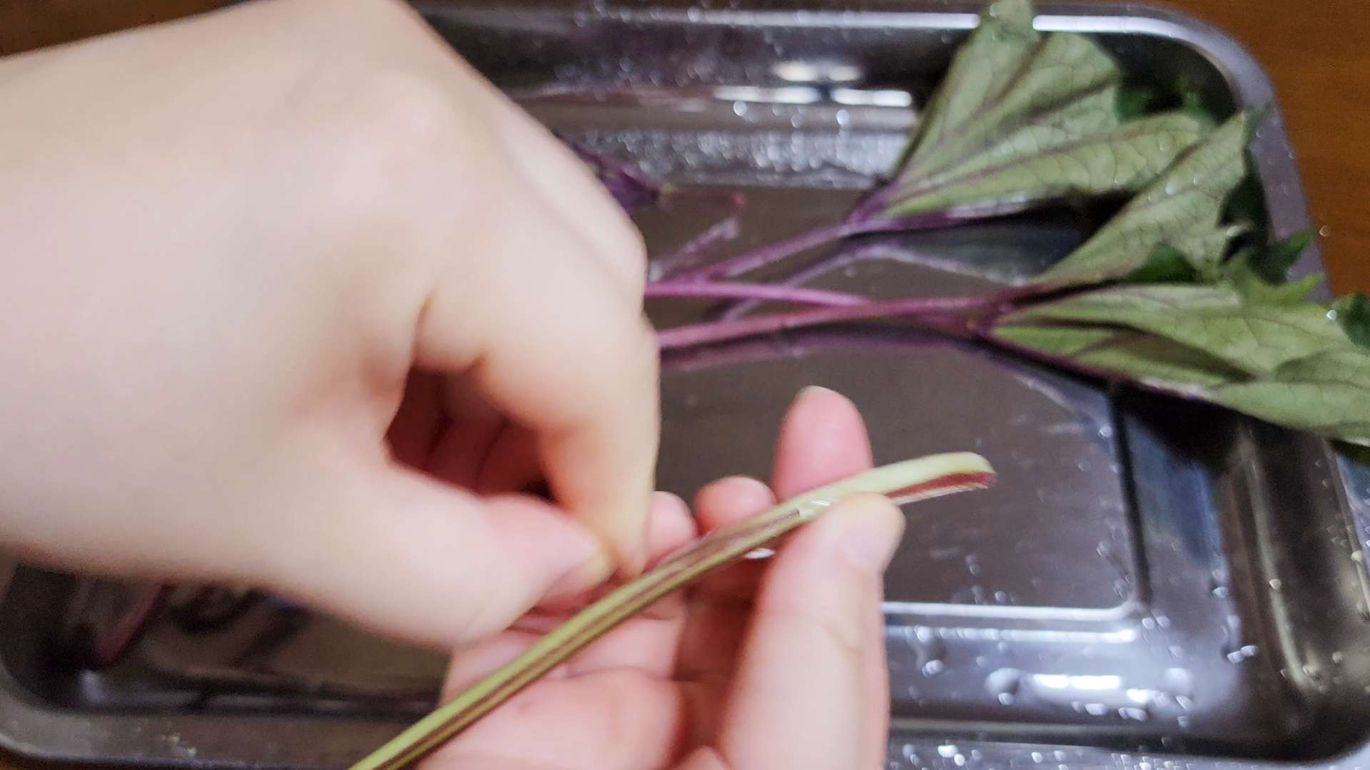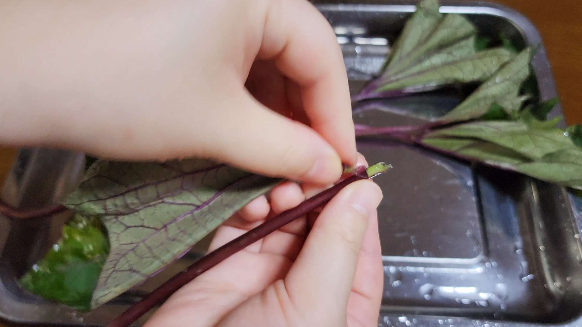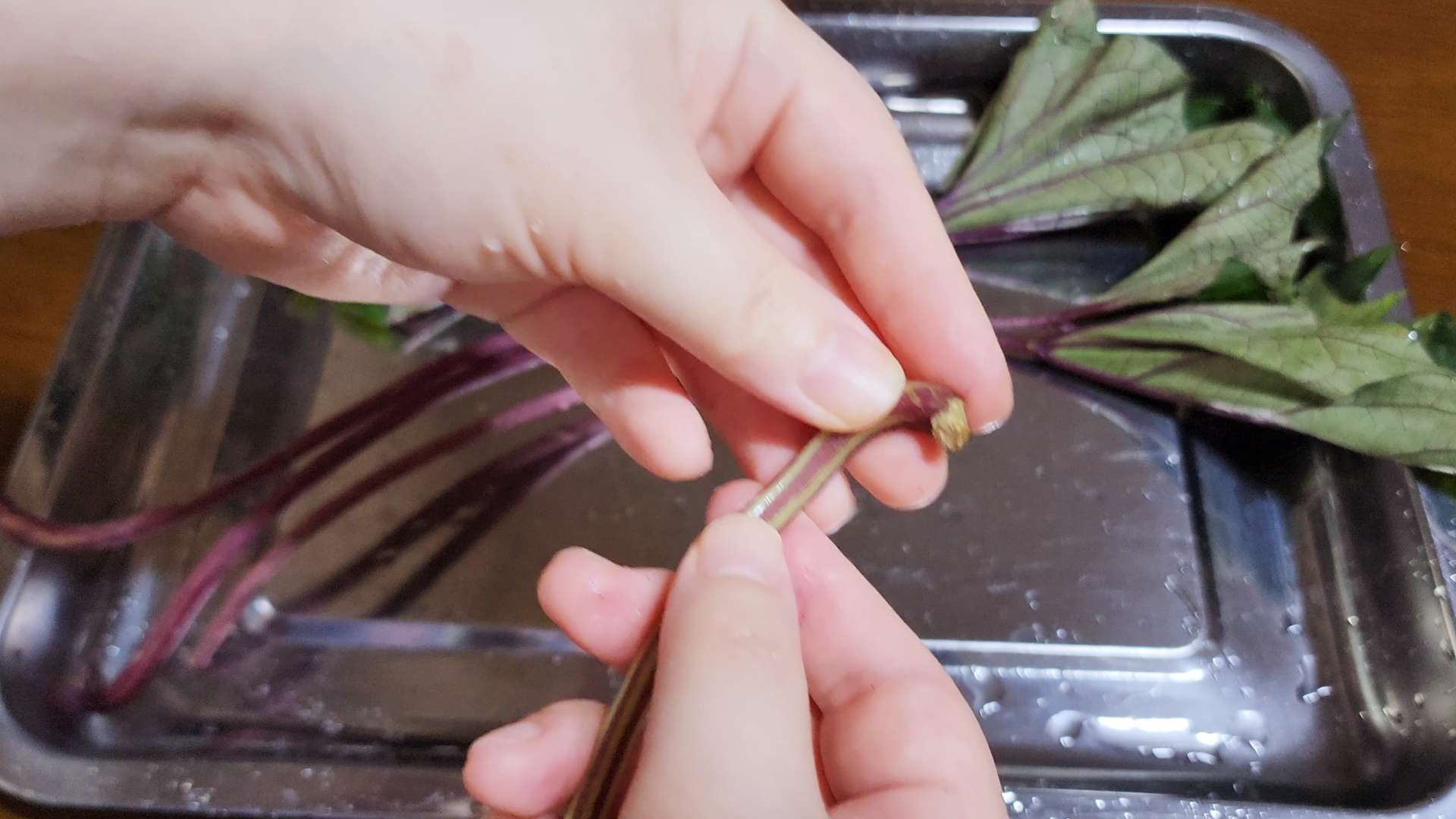 고구마줄기는 잎을 꺽어 잡아당기면서 껍질을 벗겨줍니다.