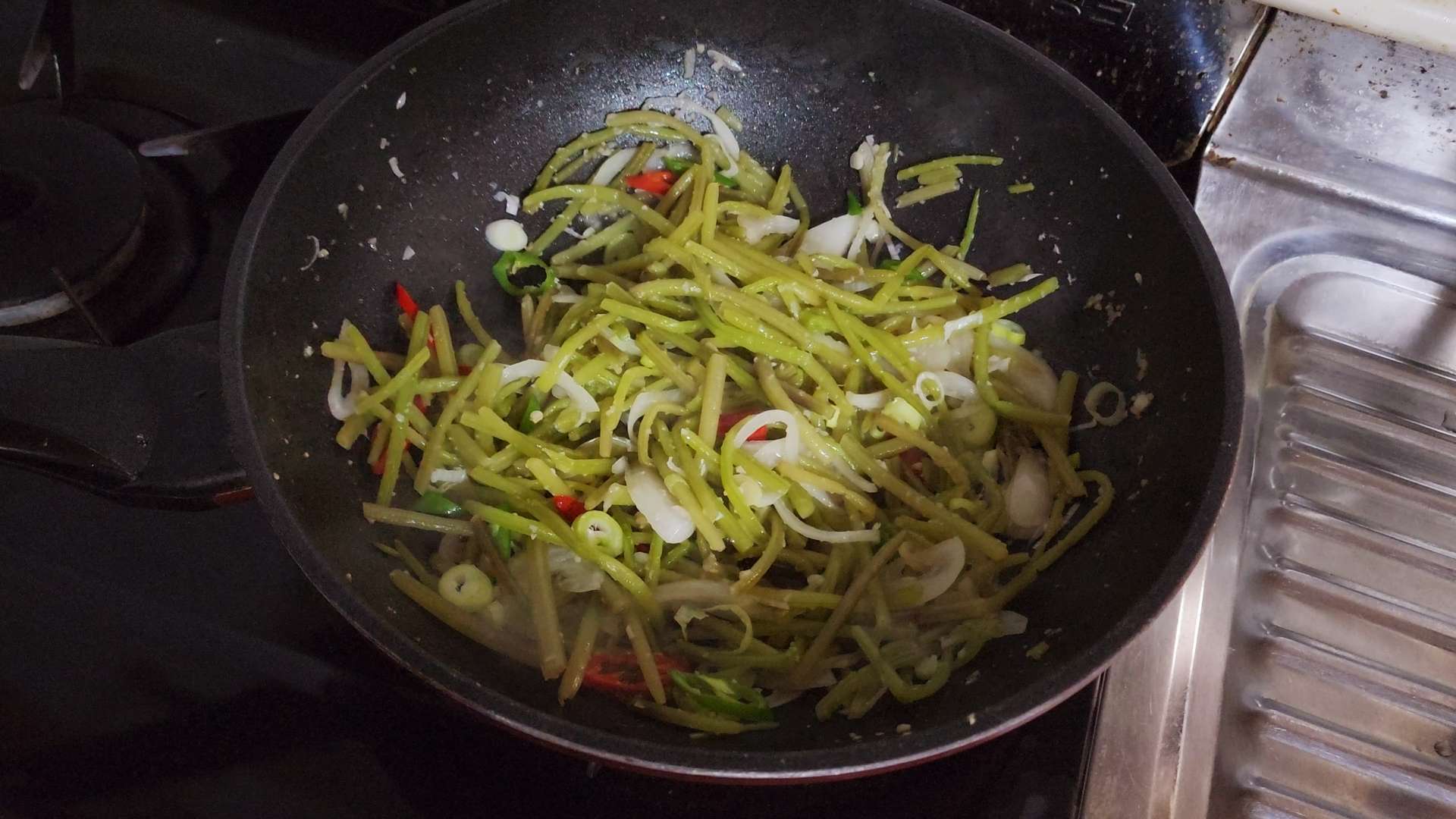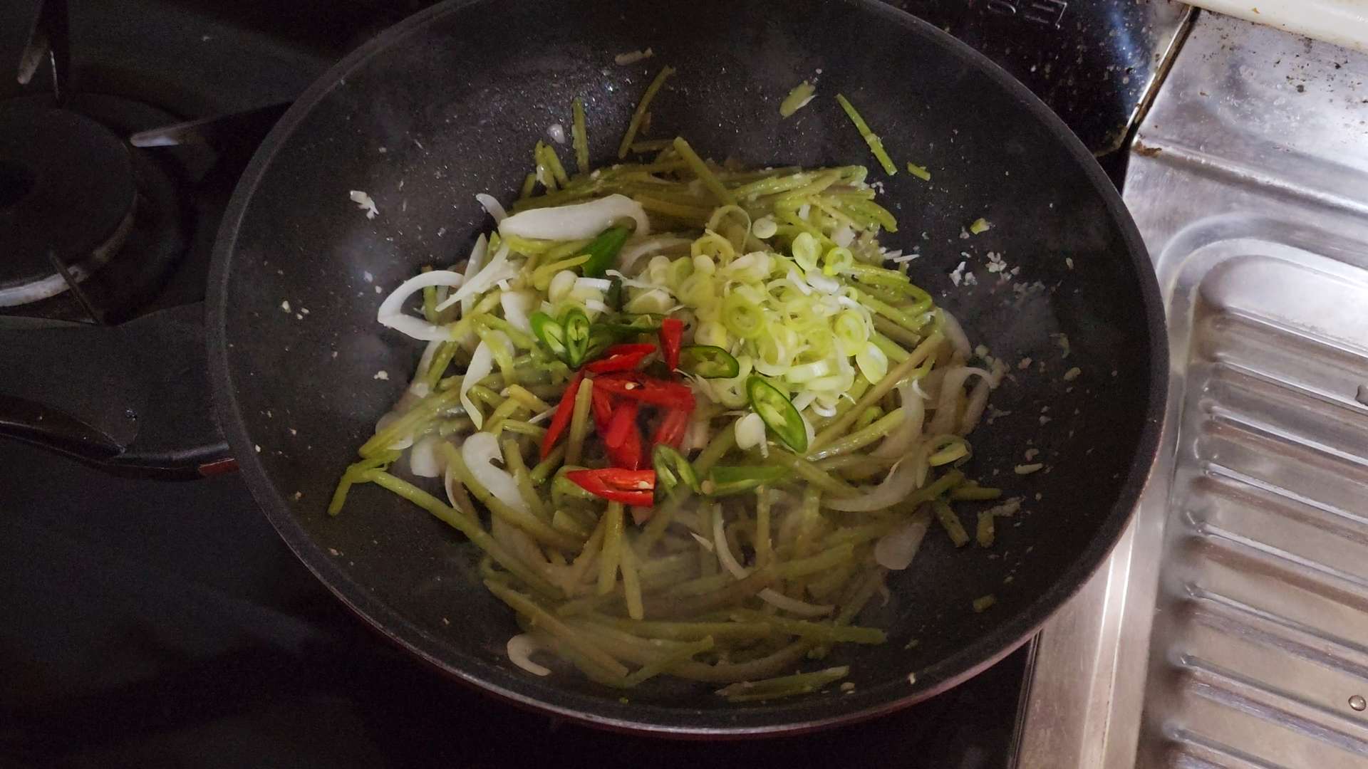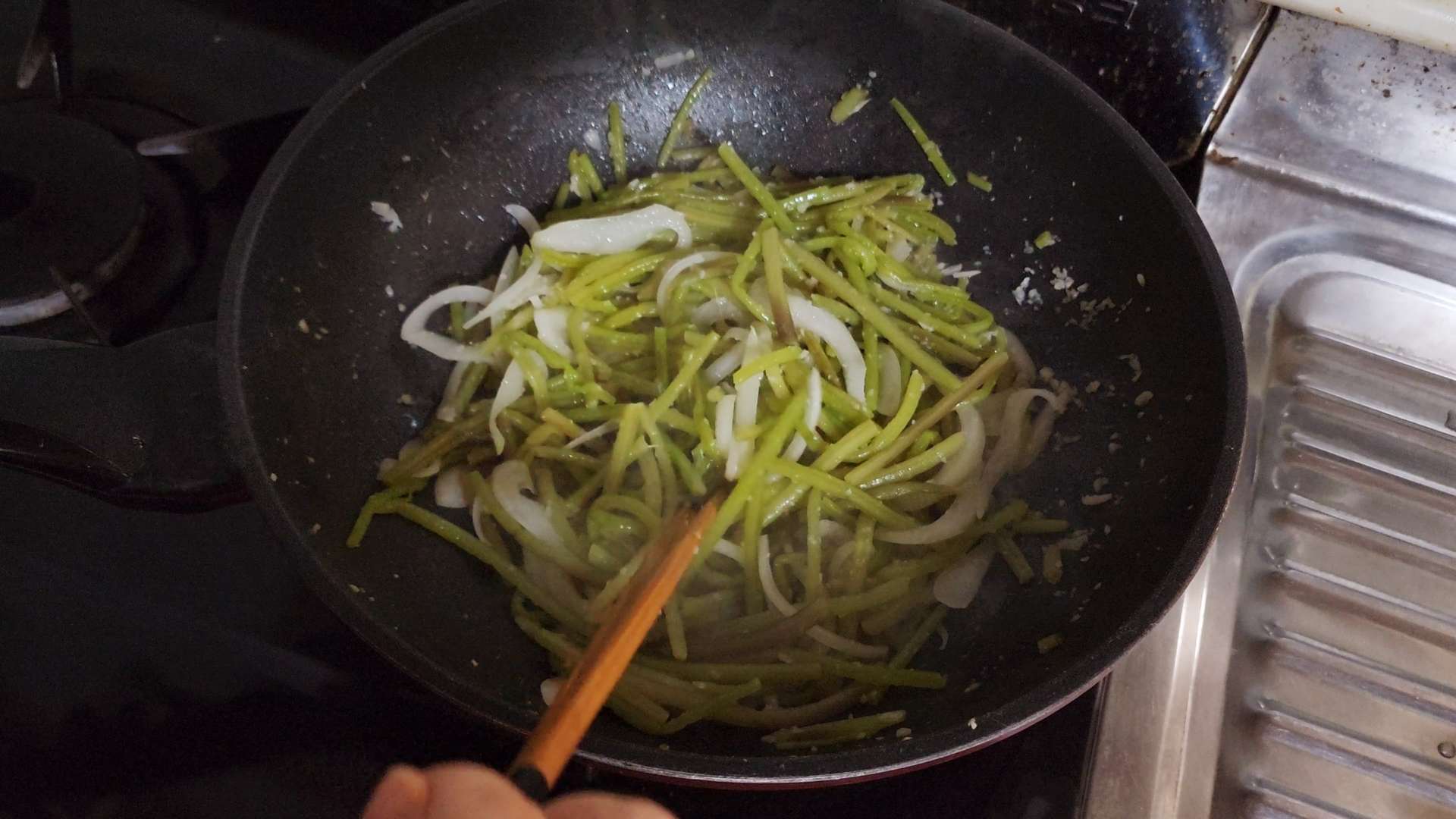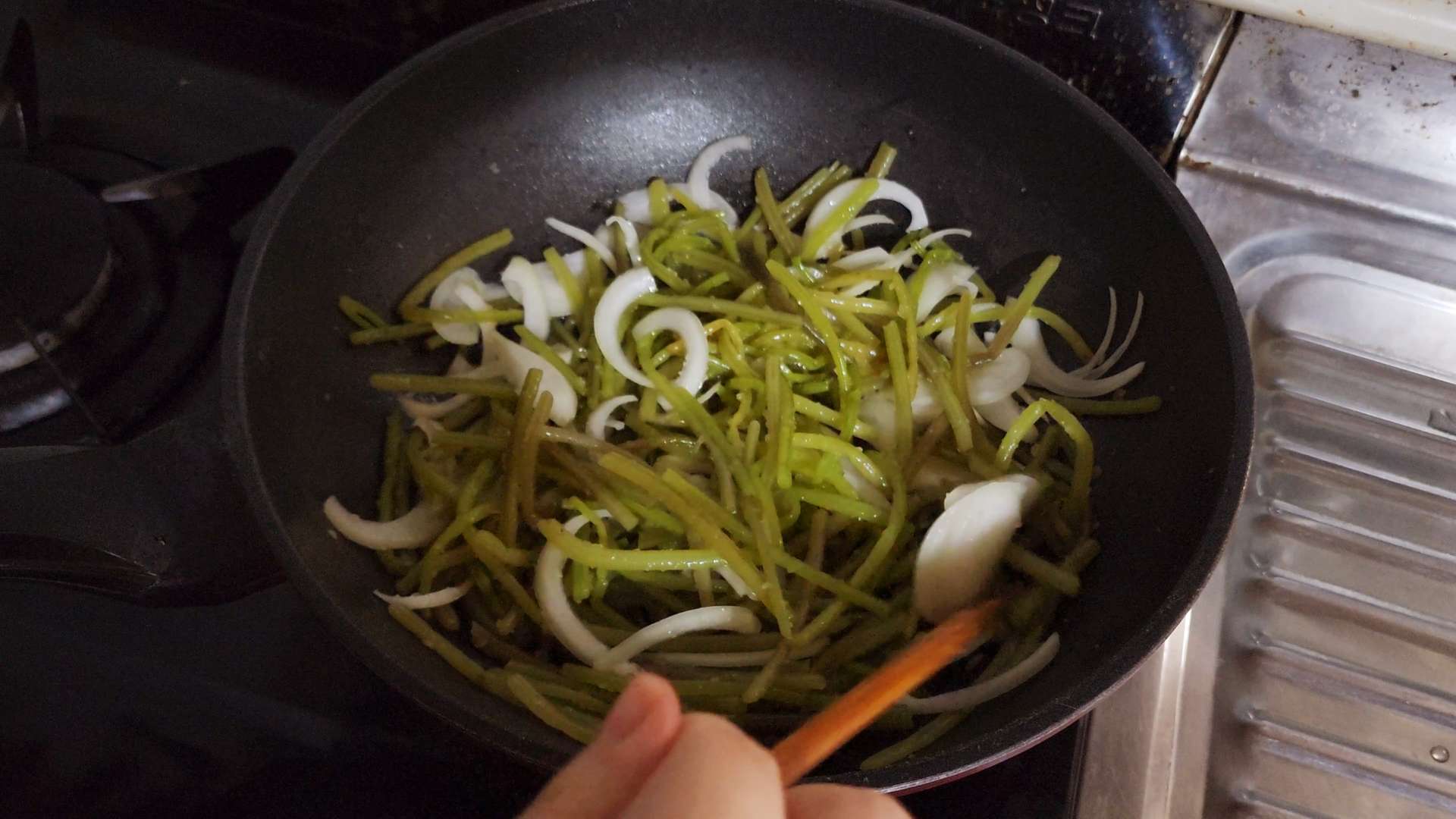 고구마줄기, 양파를 넣고 중불에서 5분간 볶아줍니다.