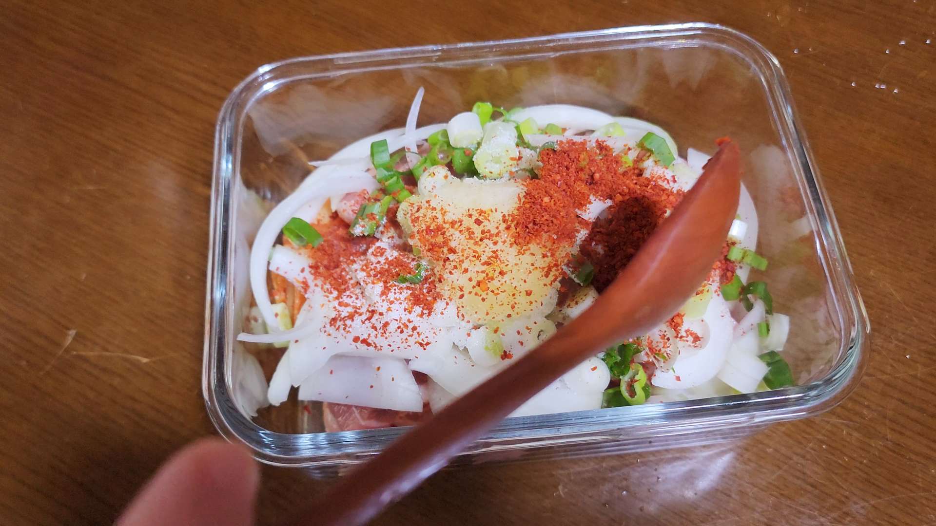 설탕 1/2T, 다진 마늘 1/2T, 고춧가루 1/2T를 넣고 섞어줍니다.