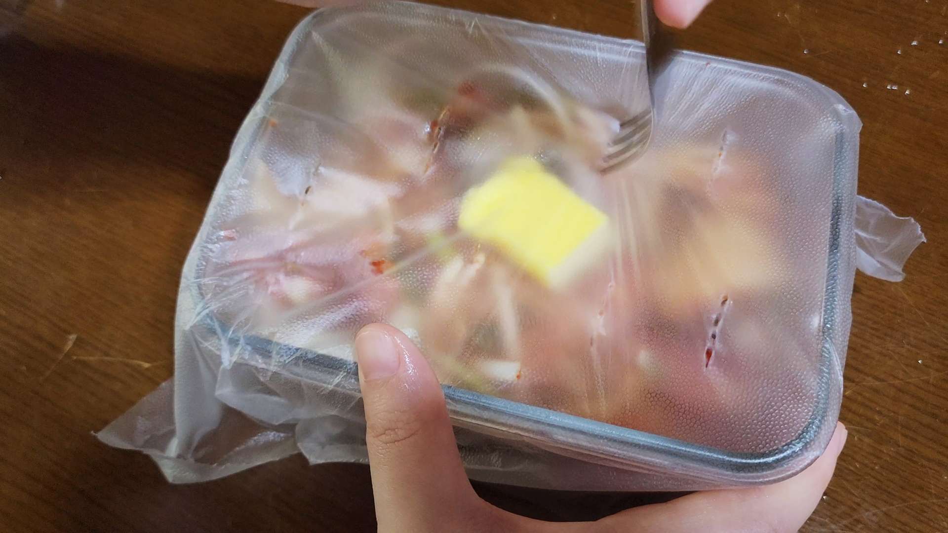 랩으로 감싸고 포크로 구멍을 뚫어줍니다. 전자레인지에 10분간 돌려줍니다.