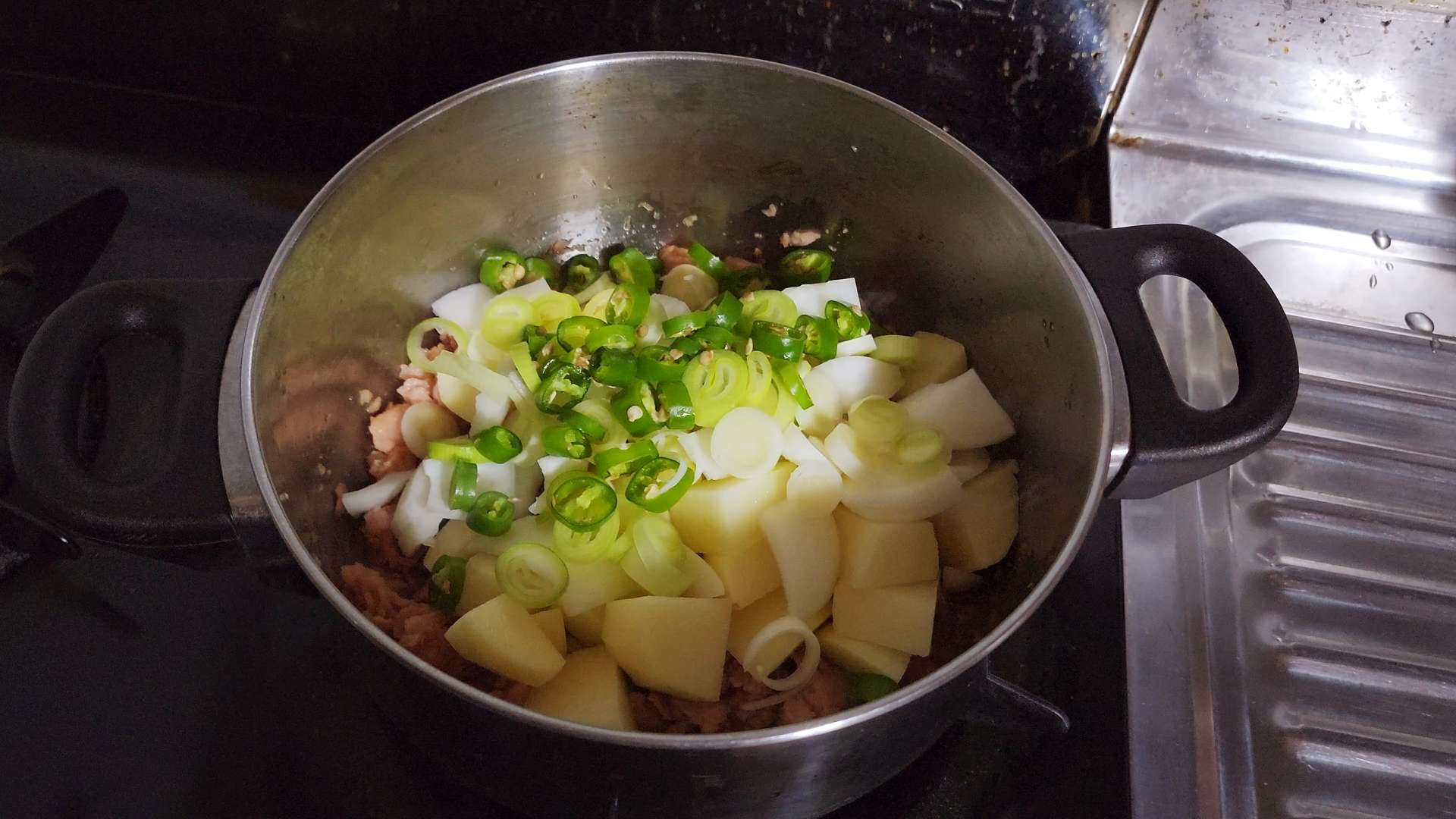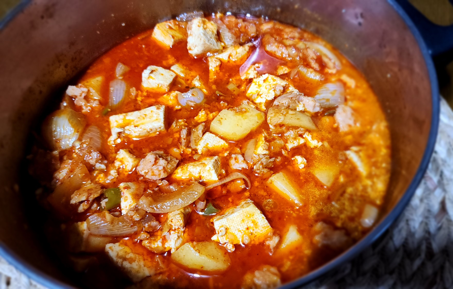 재료: 스팸 200g, 물 400ml, 감자 2개, 양파 1/2개, 두부 1모, 대파 1/2대, 청양고추 3개, 고춧가루 2T, 설탕 1T, 다진마늘 1T, 진간장 3T, 참치액 1T,