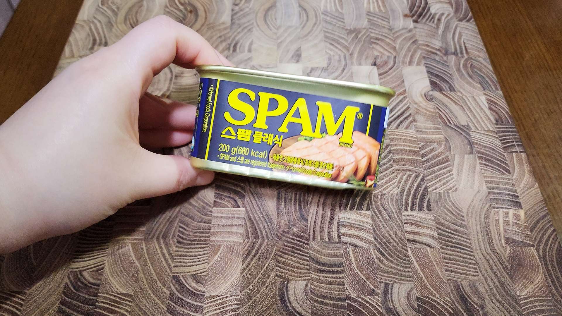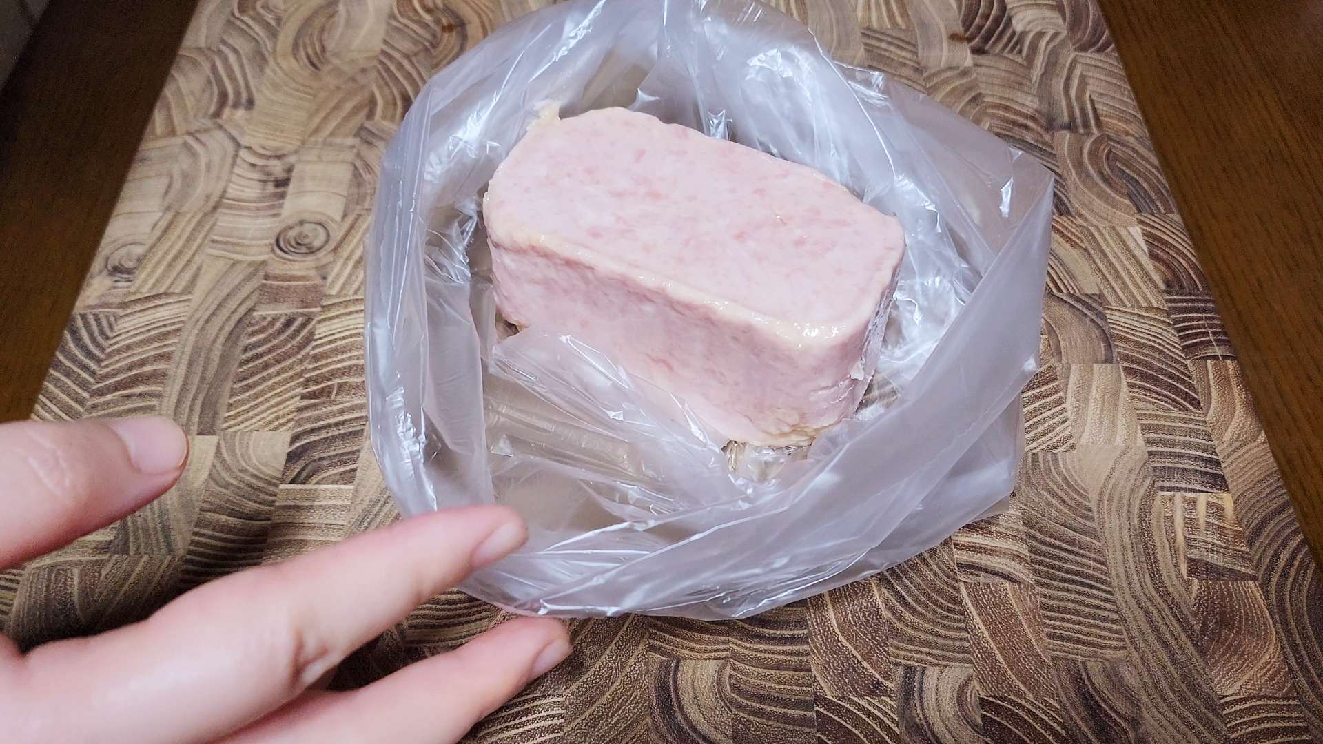 스팸은 위생 봉투에 넣어 손으로 으깨줍니다.