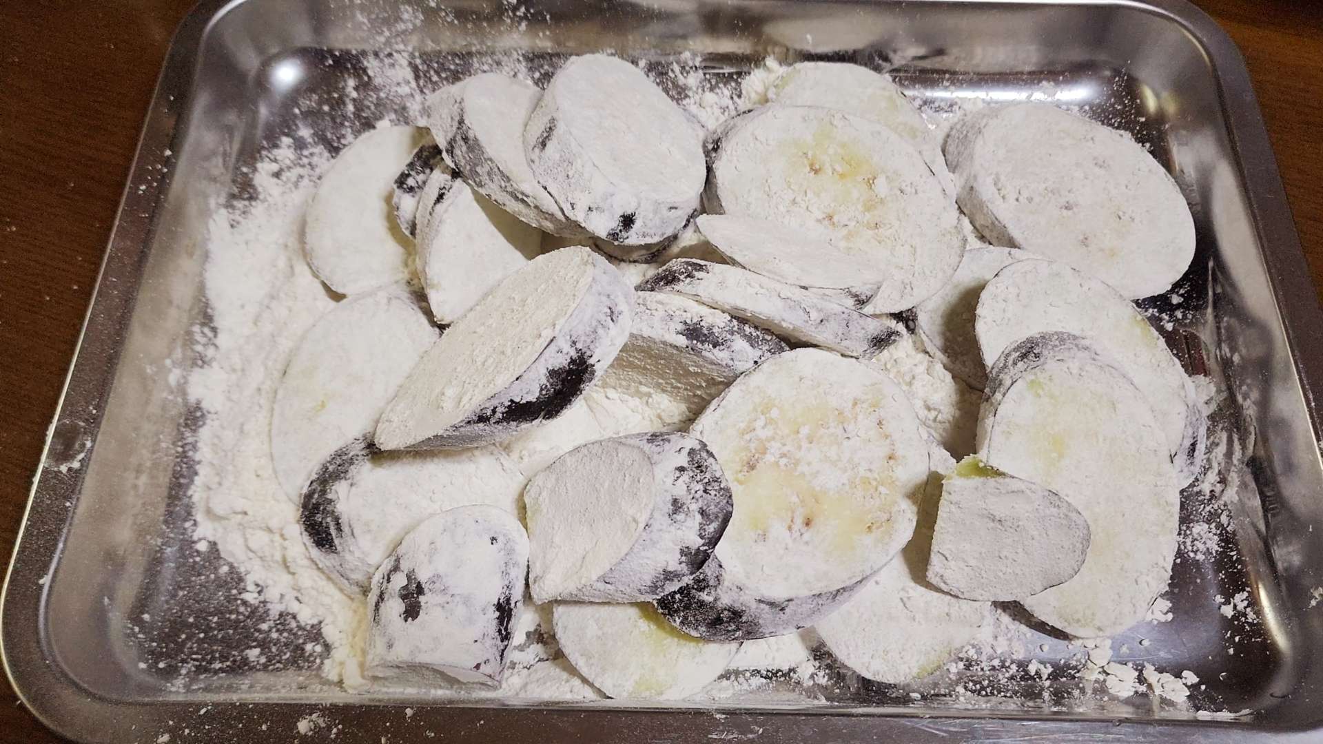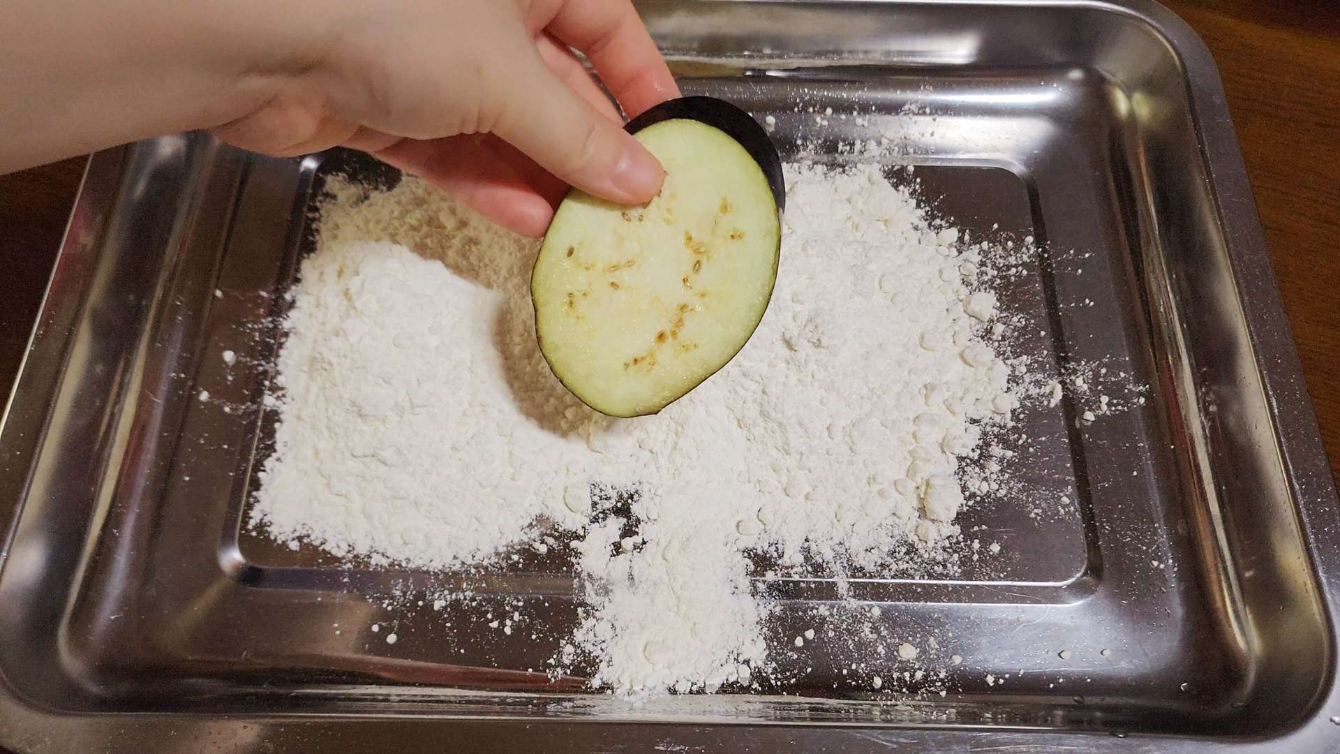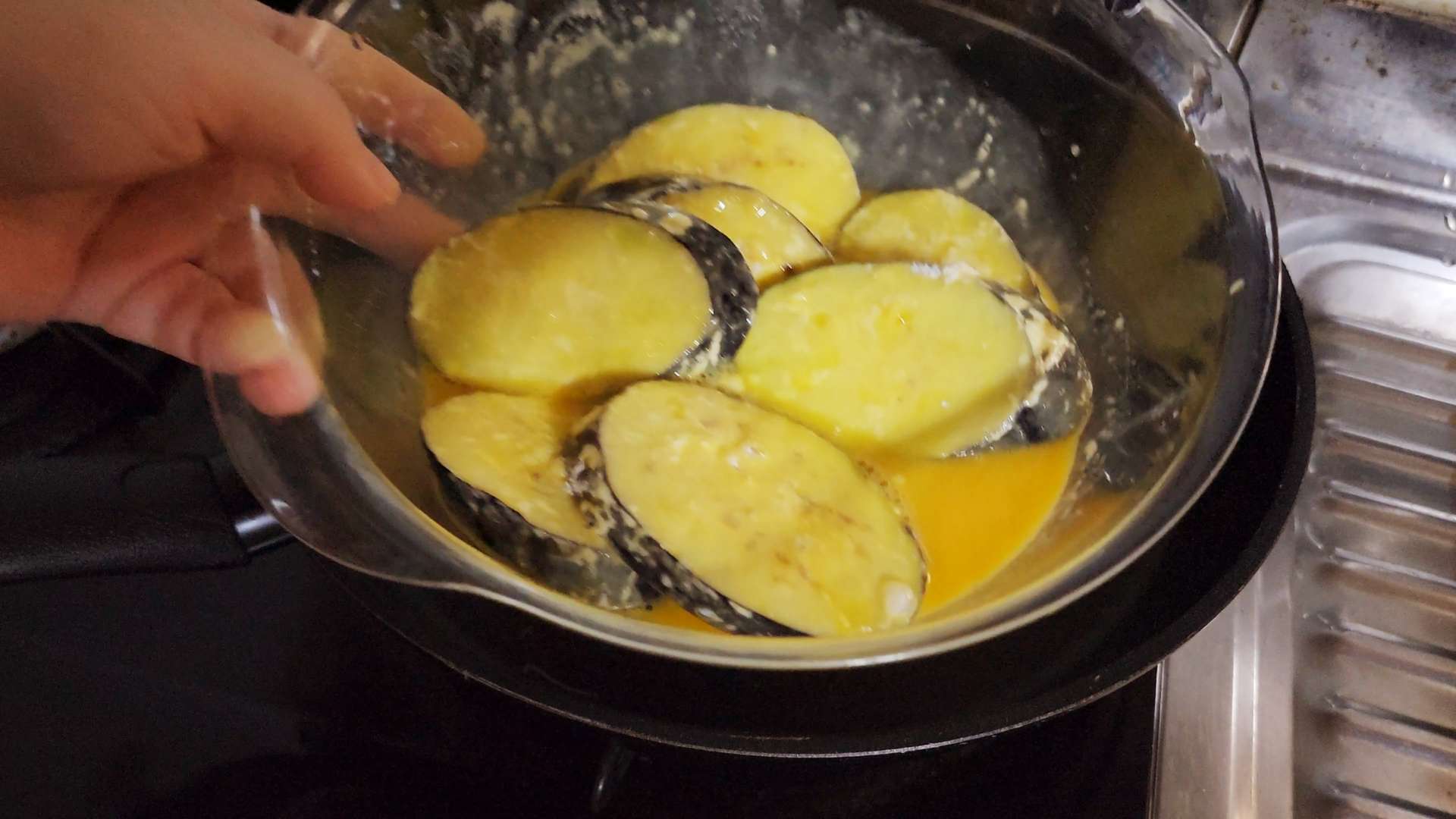 재료: 가지 2개, 계란4개, 밀가루, 소금 한꼬집,