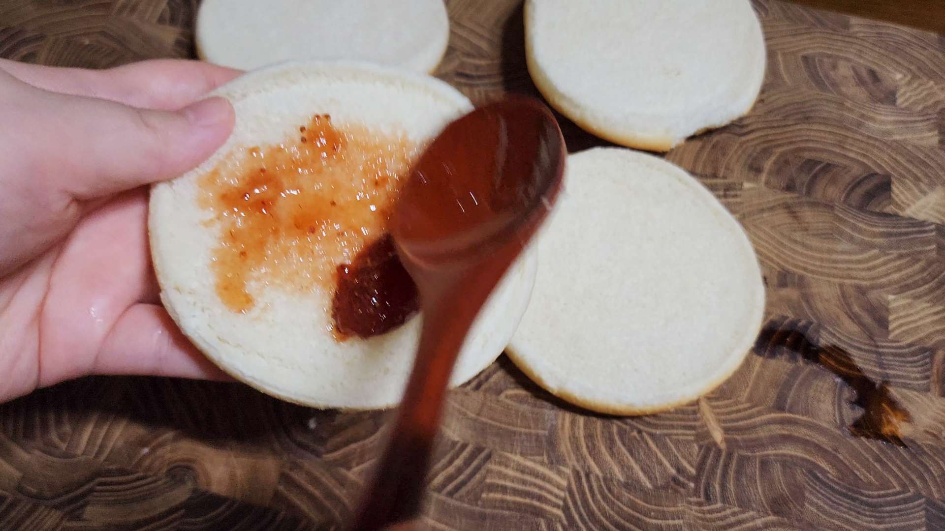 모닝빵 한쪽에 잼을 바르고 계란을 올려줍니다.