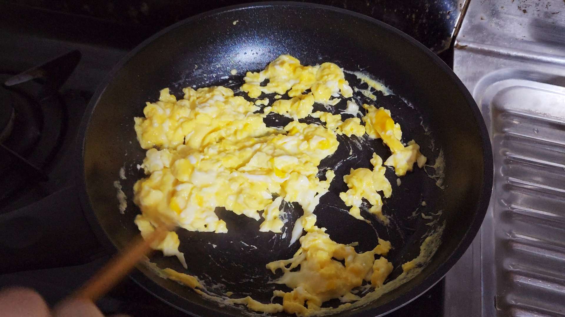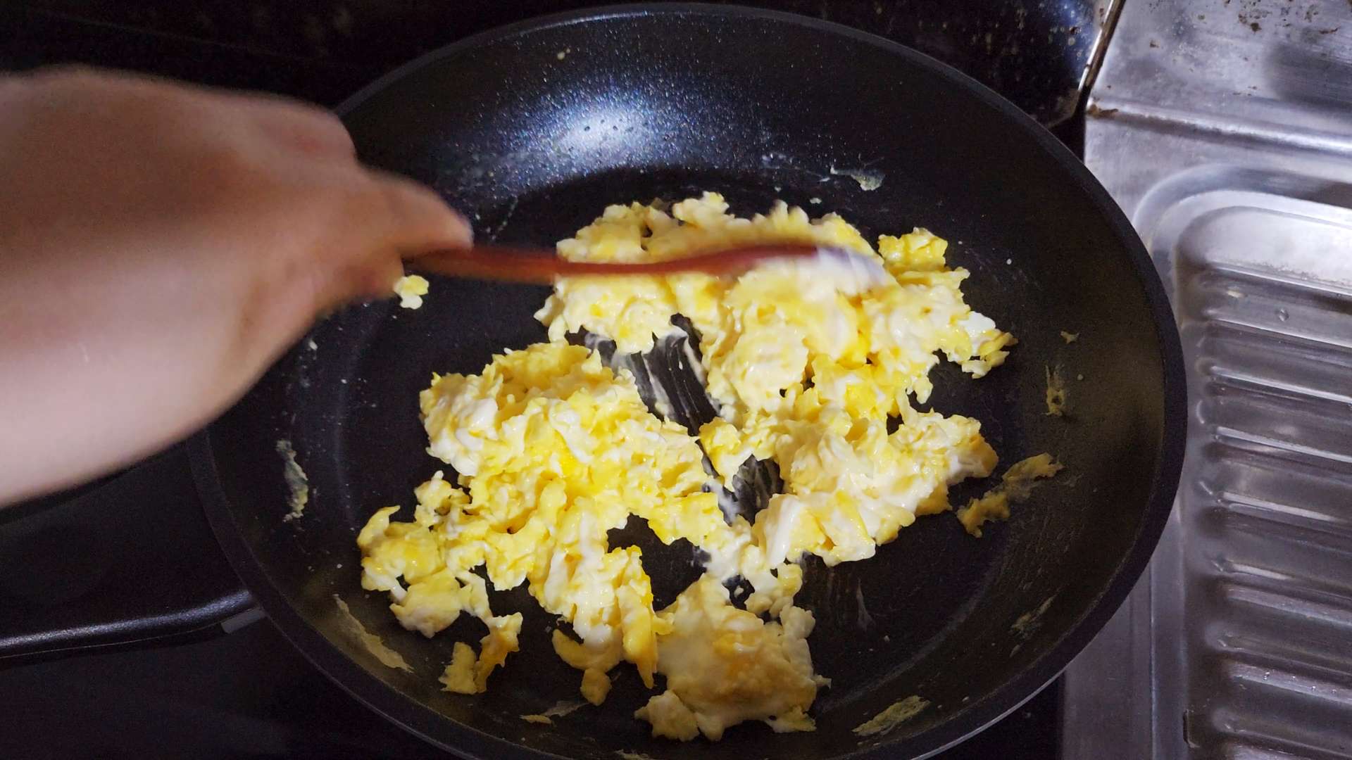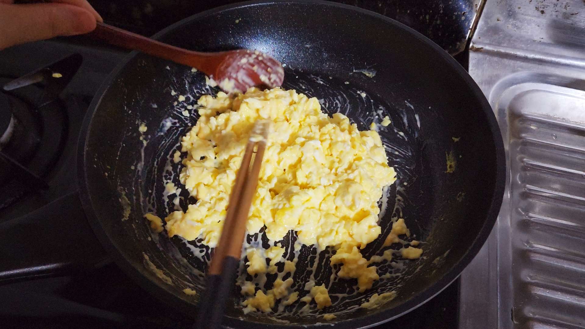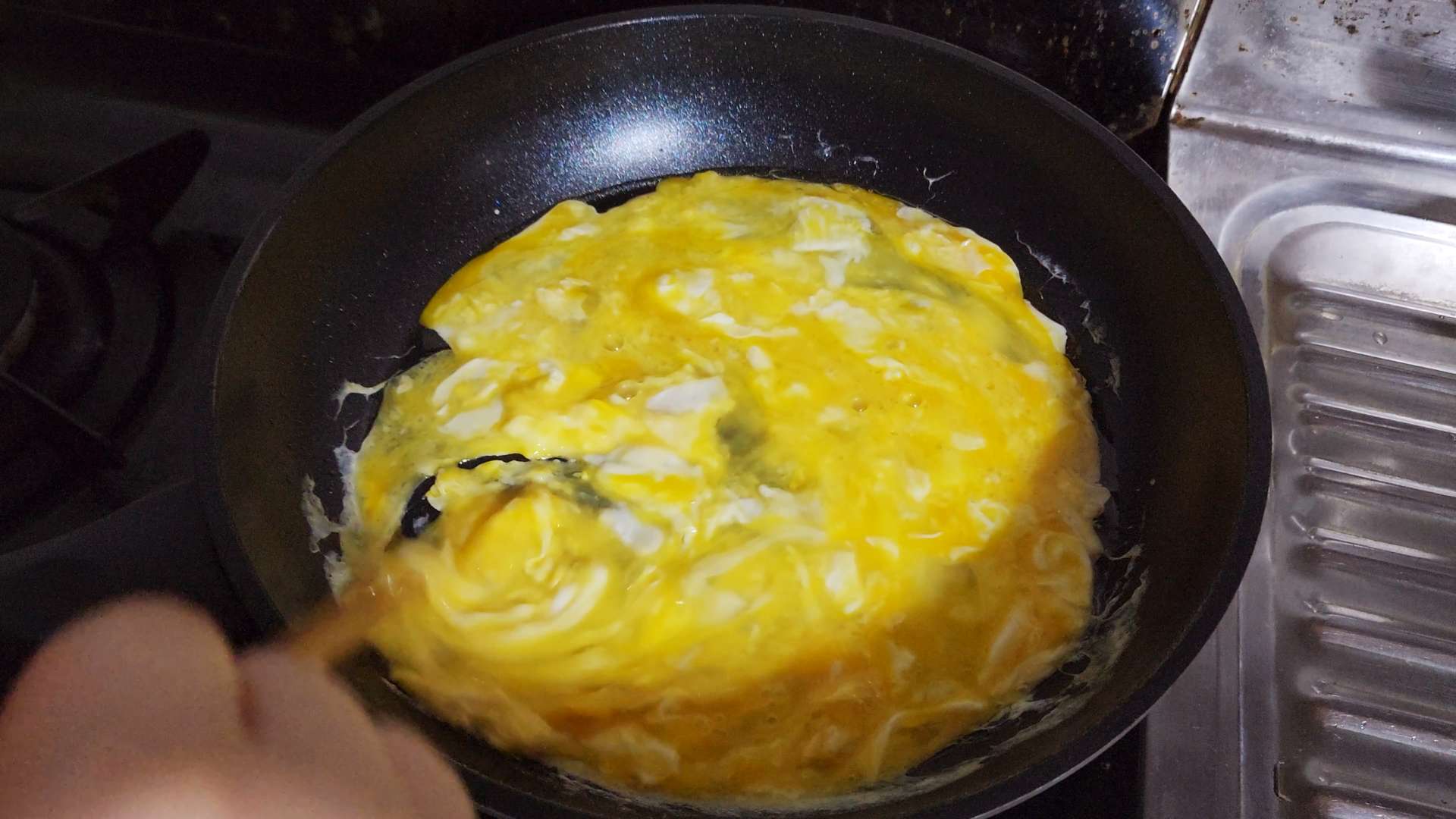 팬에 식용유를 넣고 계란 4개를 넣어 중불에서 휘저어줍니다. 계란이 촉촉할 때 불을 꺼줍니다.
