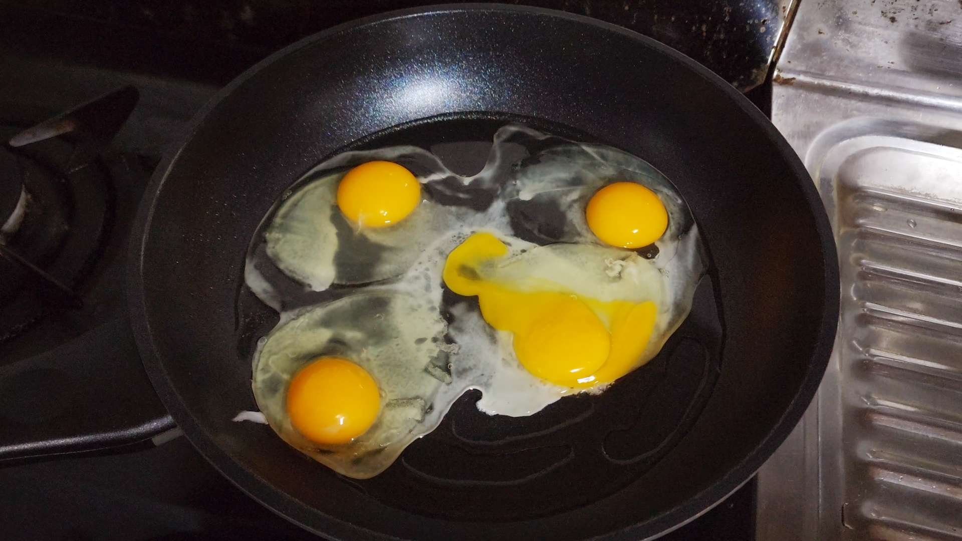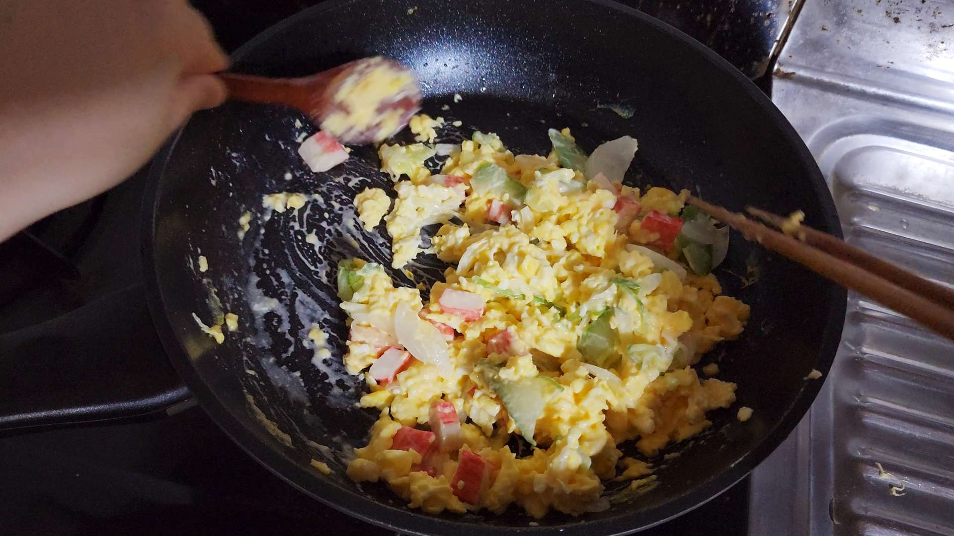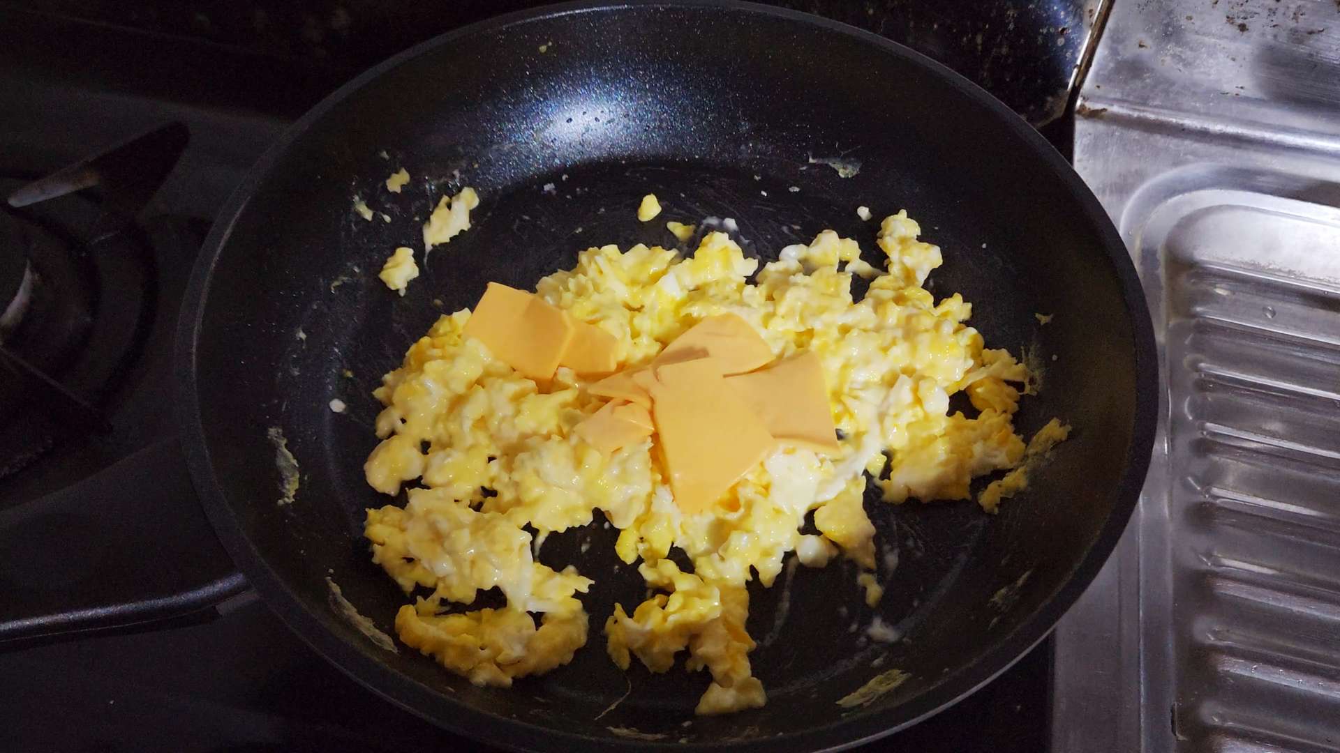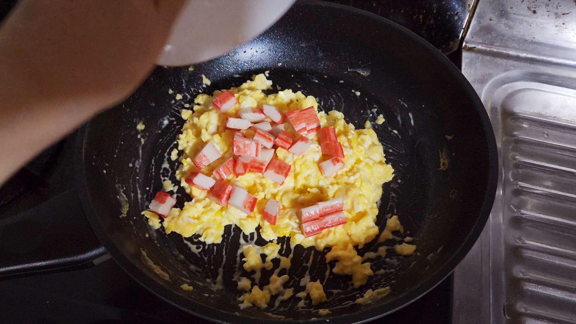 팬에 식용유를 넣고 계란 4개를 넣어 중불에서 휘저어줍니다. 계란이 촉촉할 때 불을 꺼줍니다.