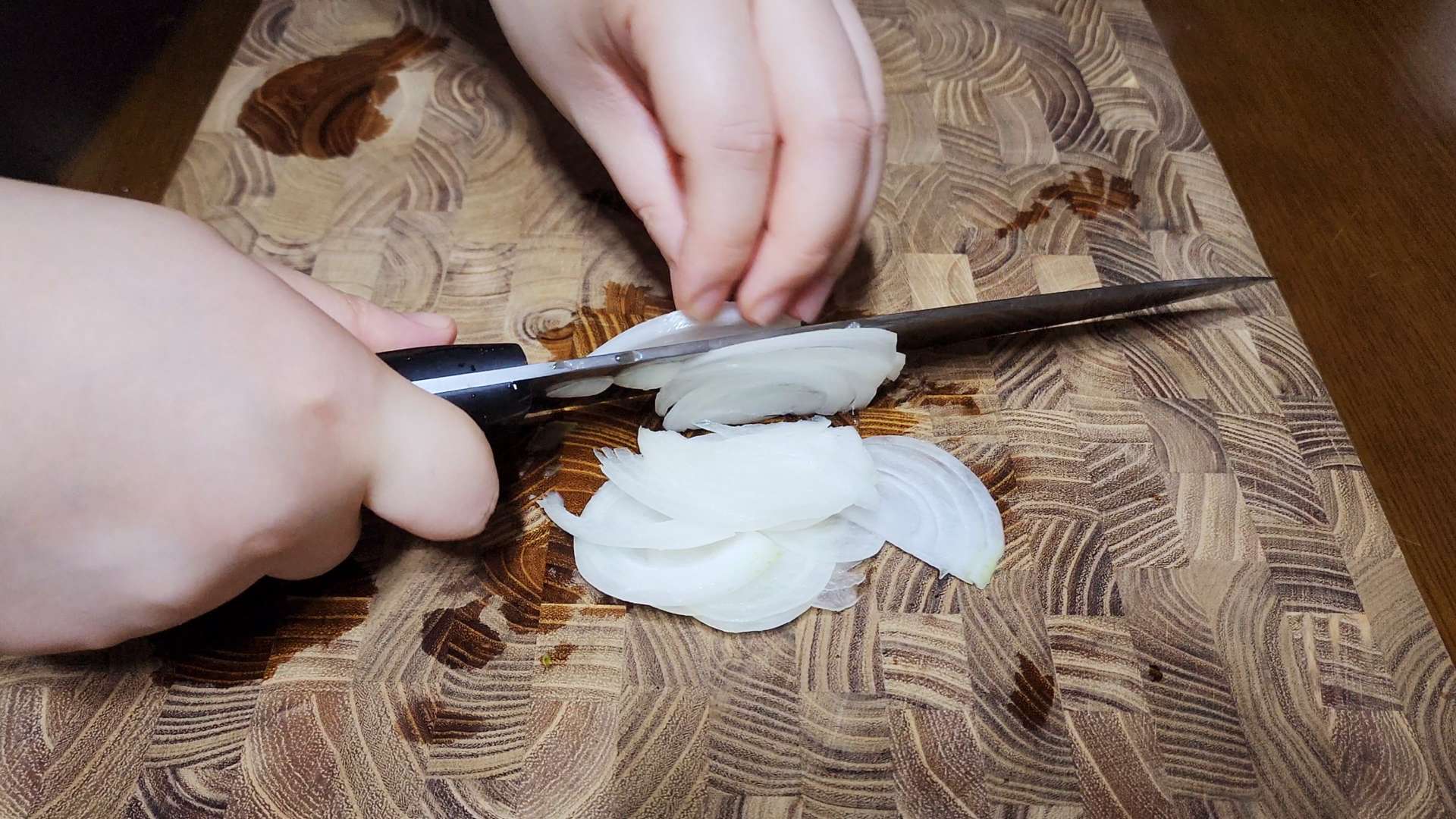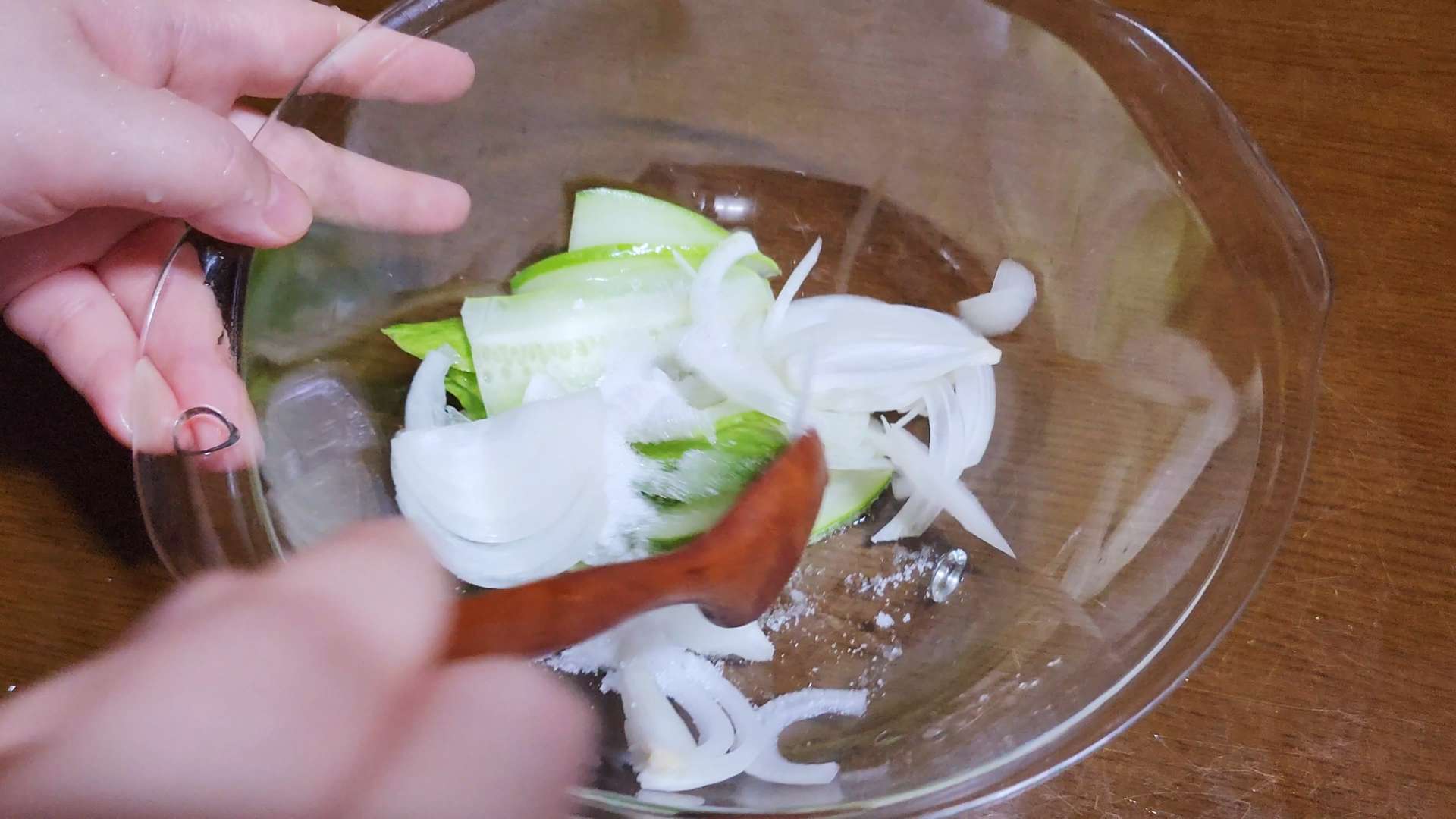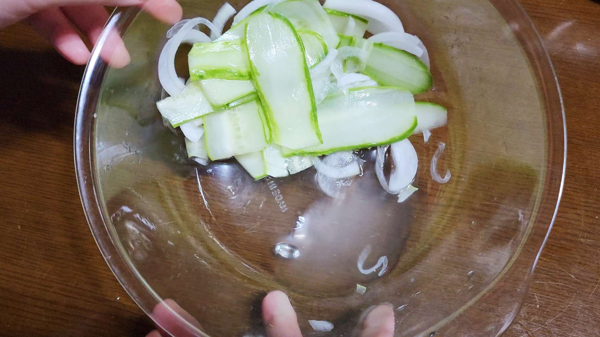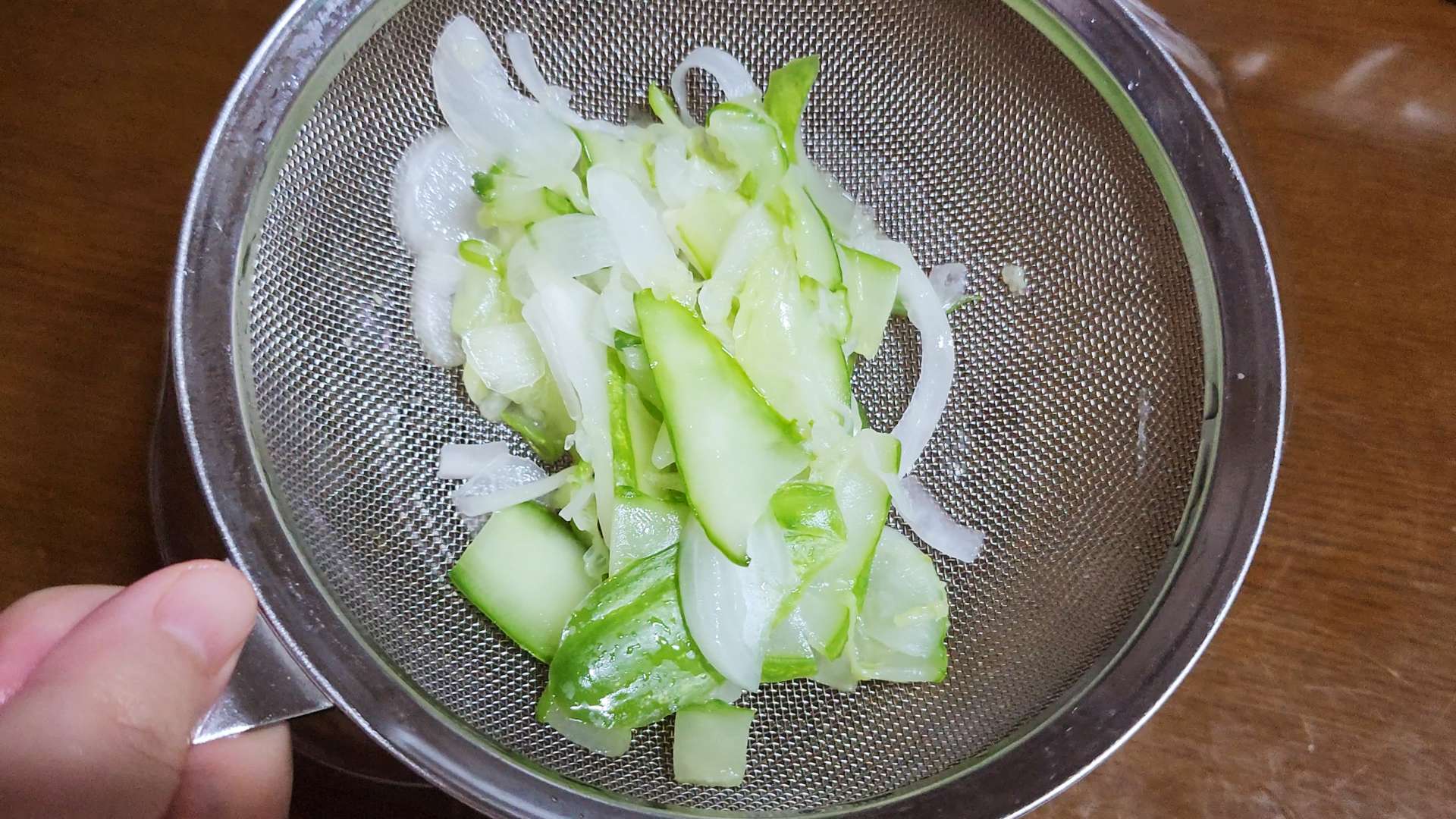 절인 오이양파는 꾹 짜서 물기를 제거해줍니다.