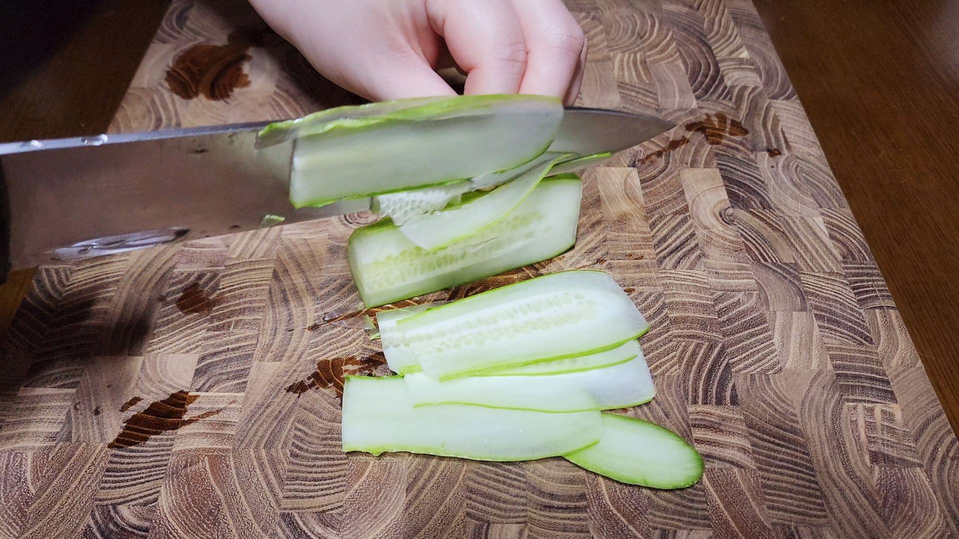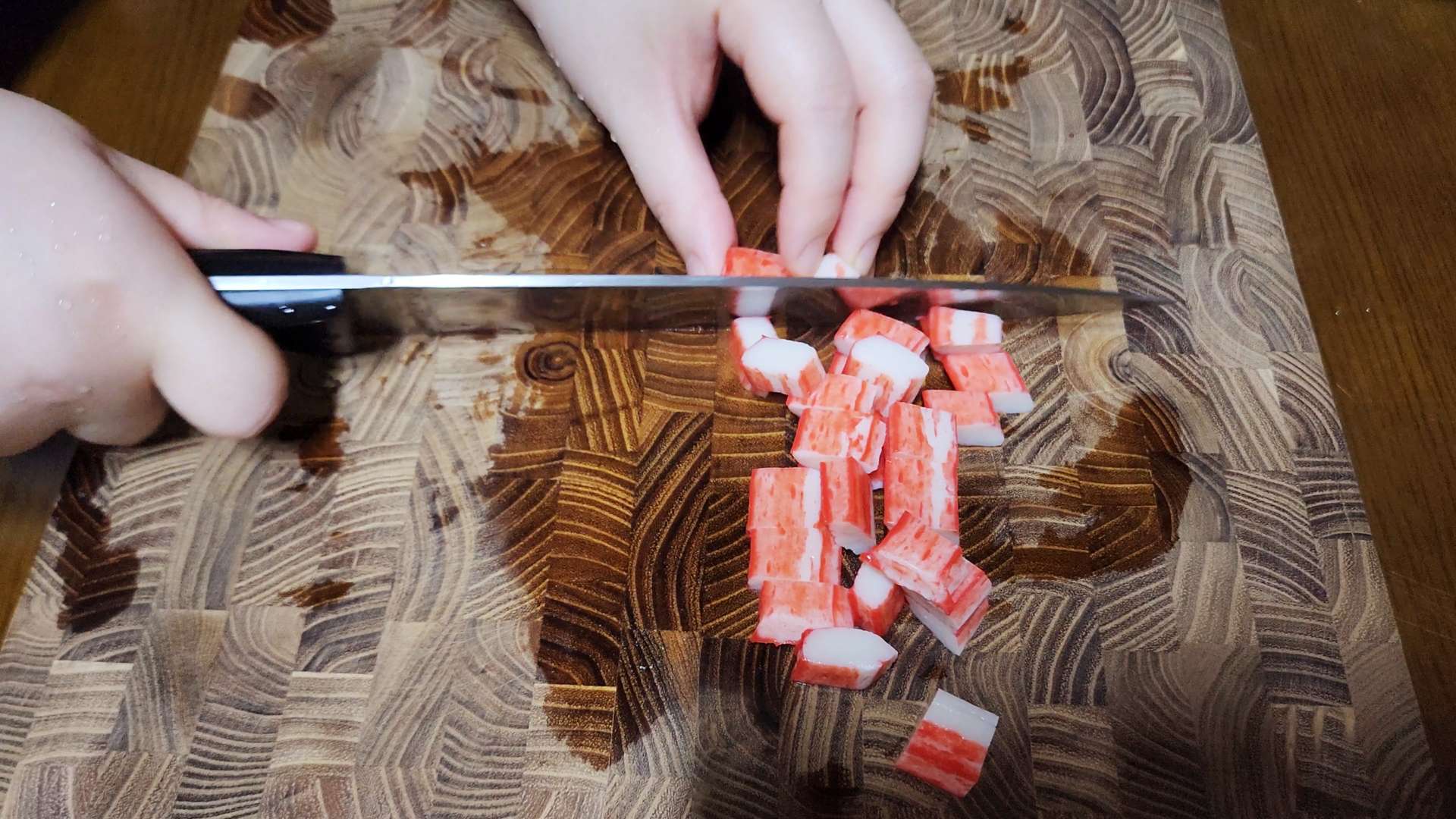 게맛살은 먹기 좋게 도톰하게 썰어줍니다.