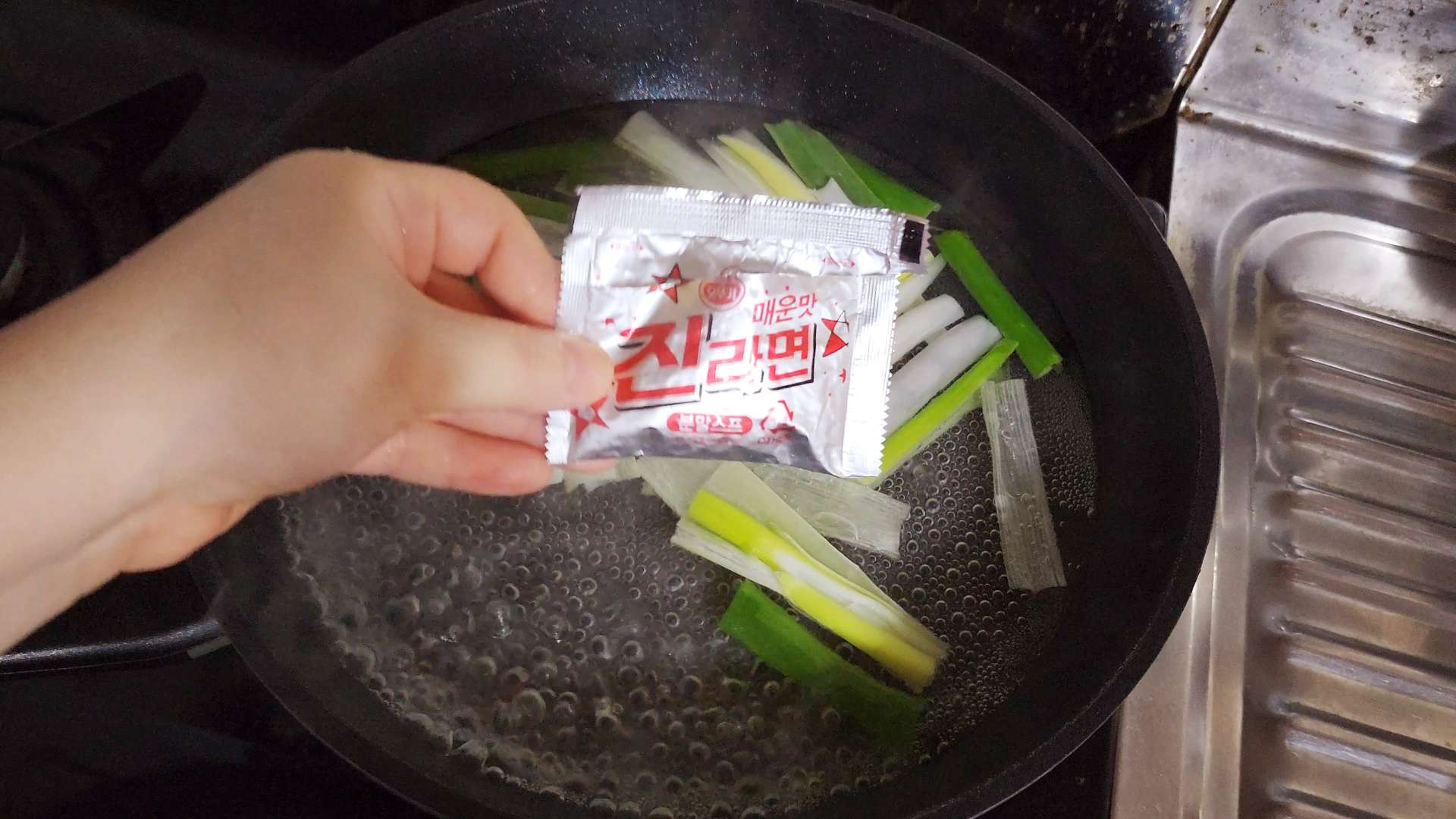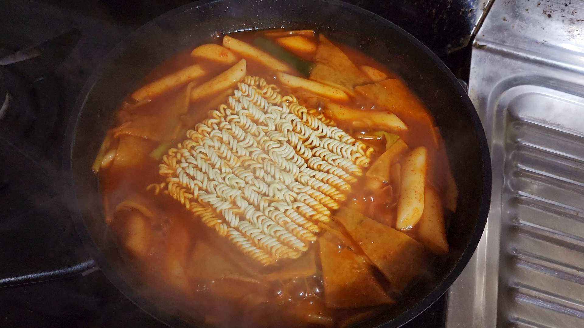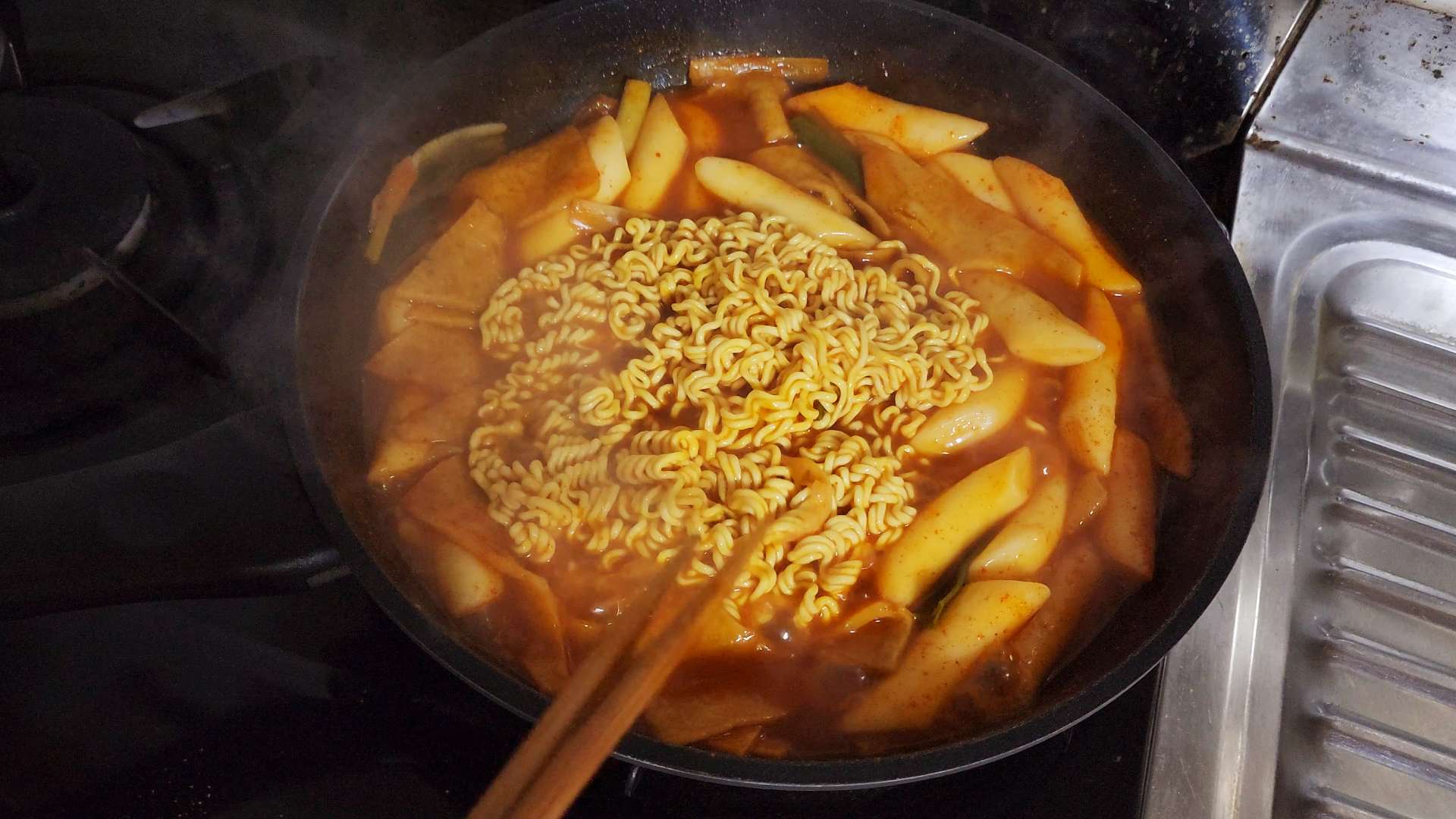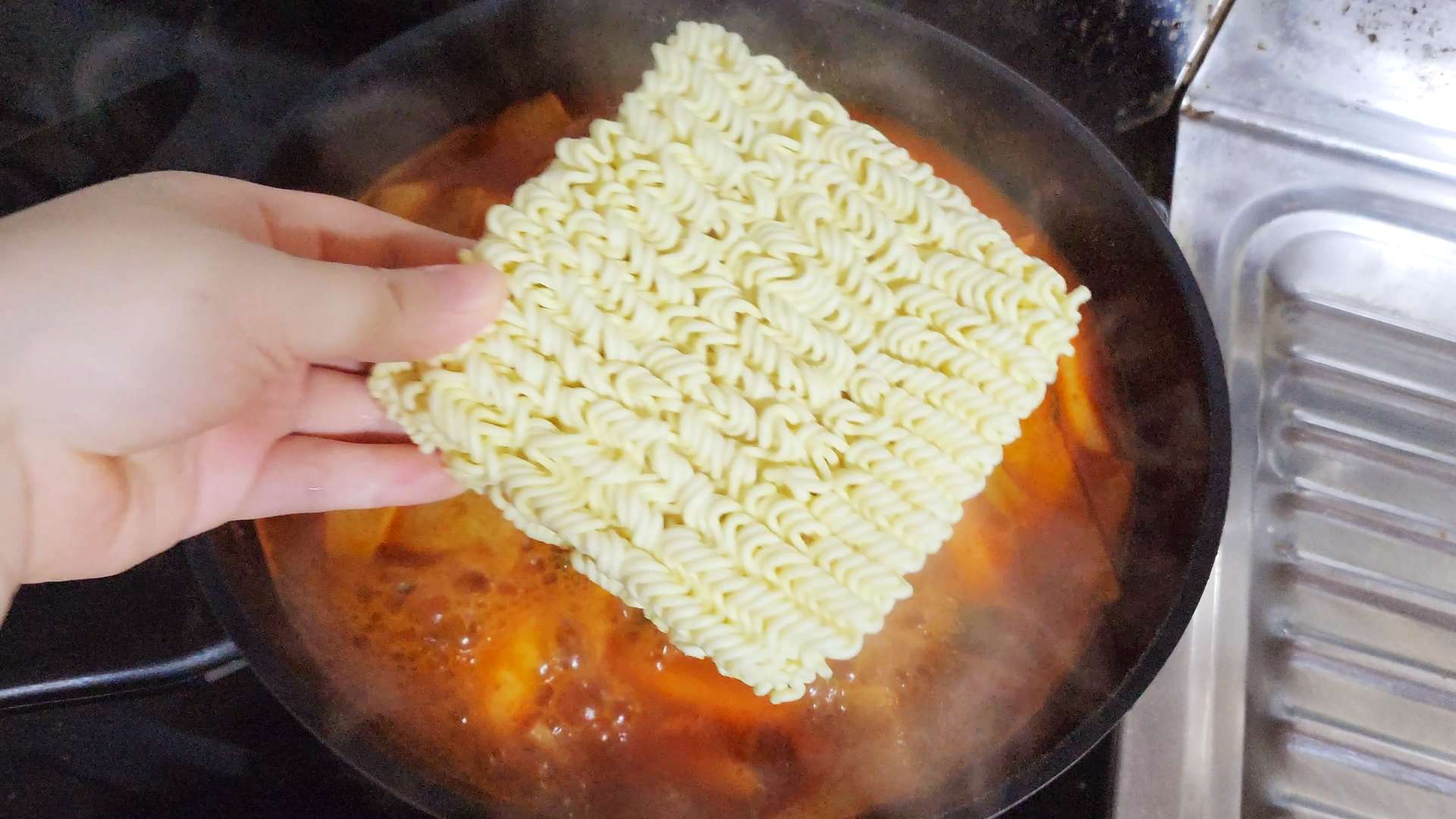 떡이 통통하게 부풀면 라면을 넣고 3분 정도 끓여줍니다.