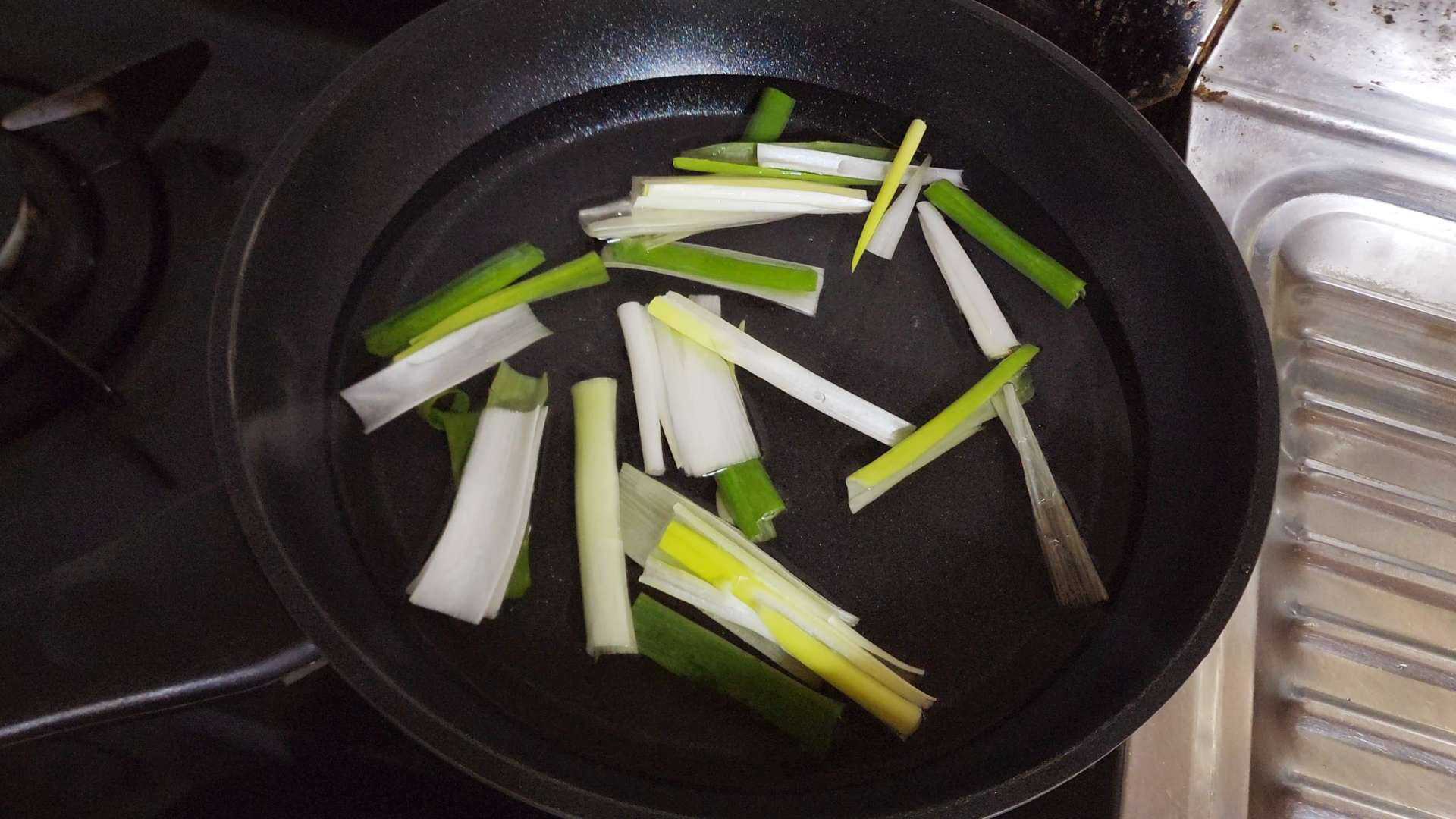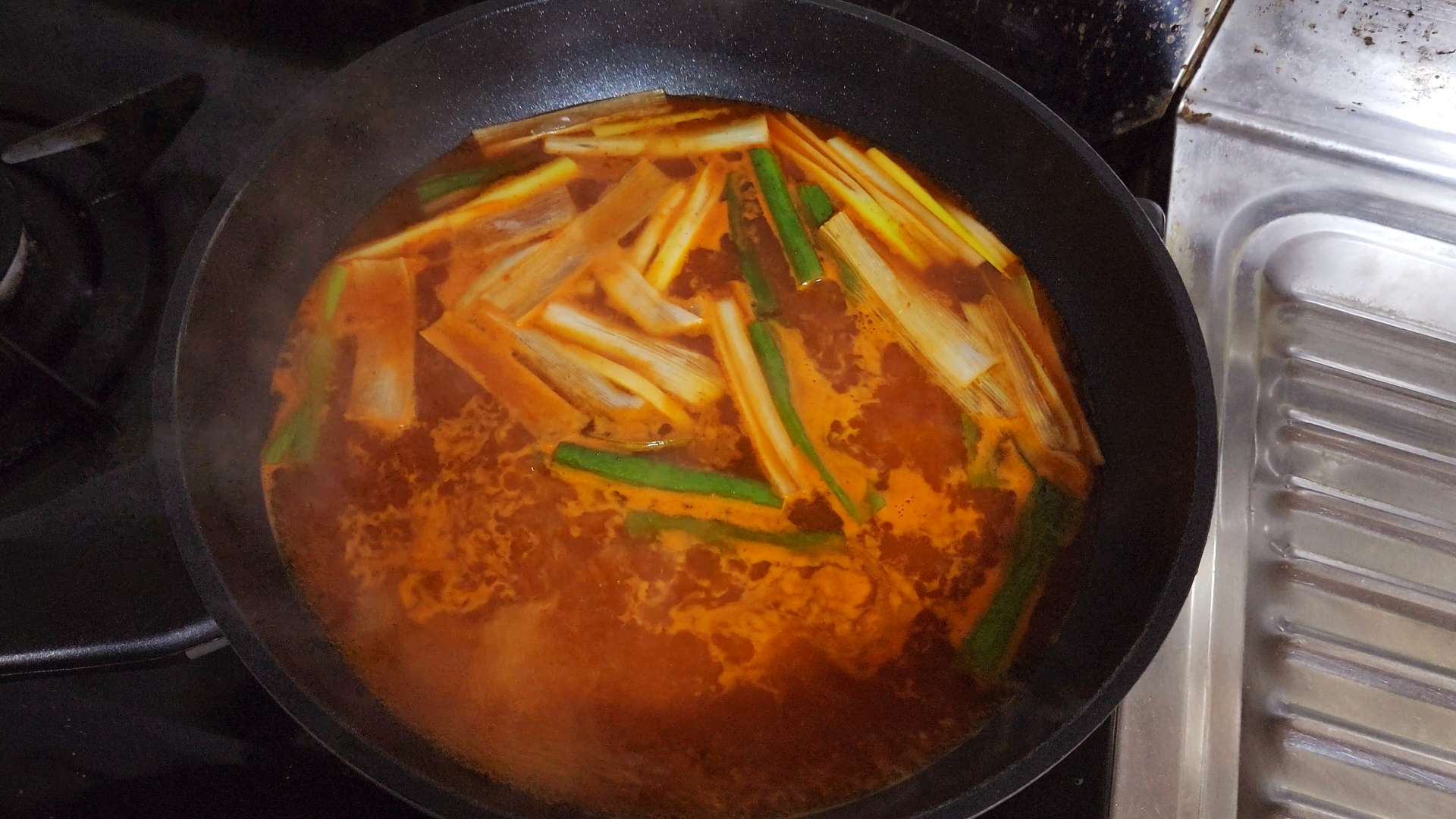 팬에 대파, 물 700ml를 넣고 중불에서 끓여줍니다.
