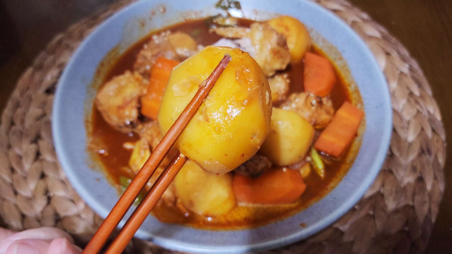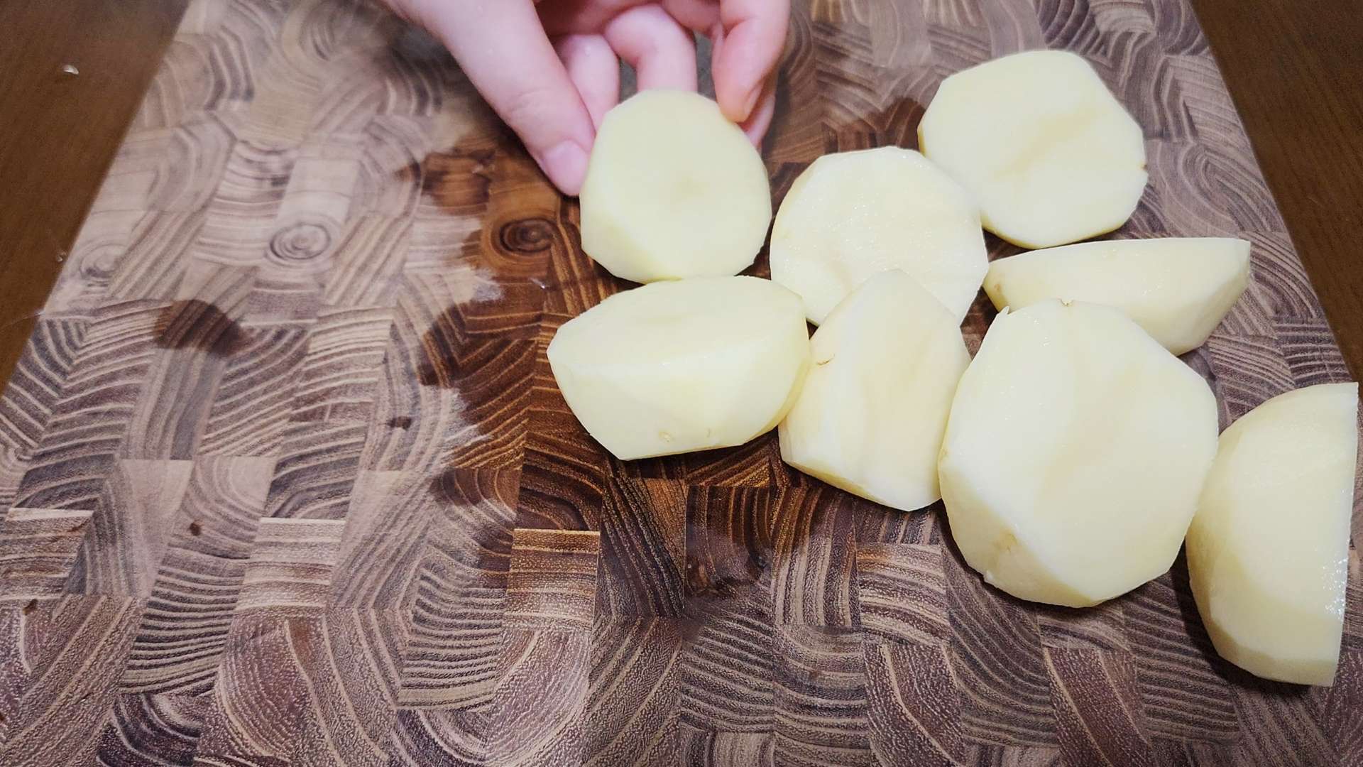 닭이 하얗게 변하면 감자, 당근, 양파를 넣어줍니다.