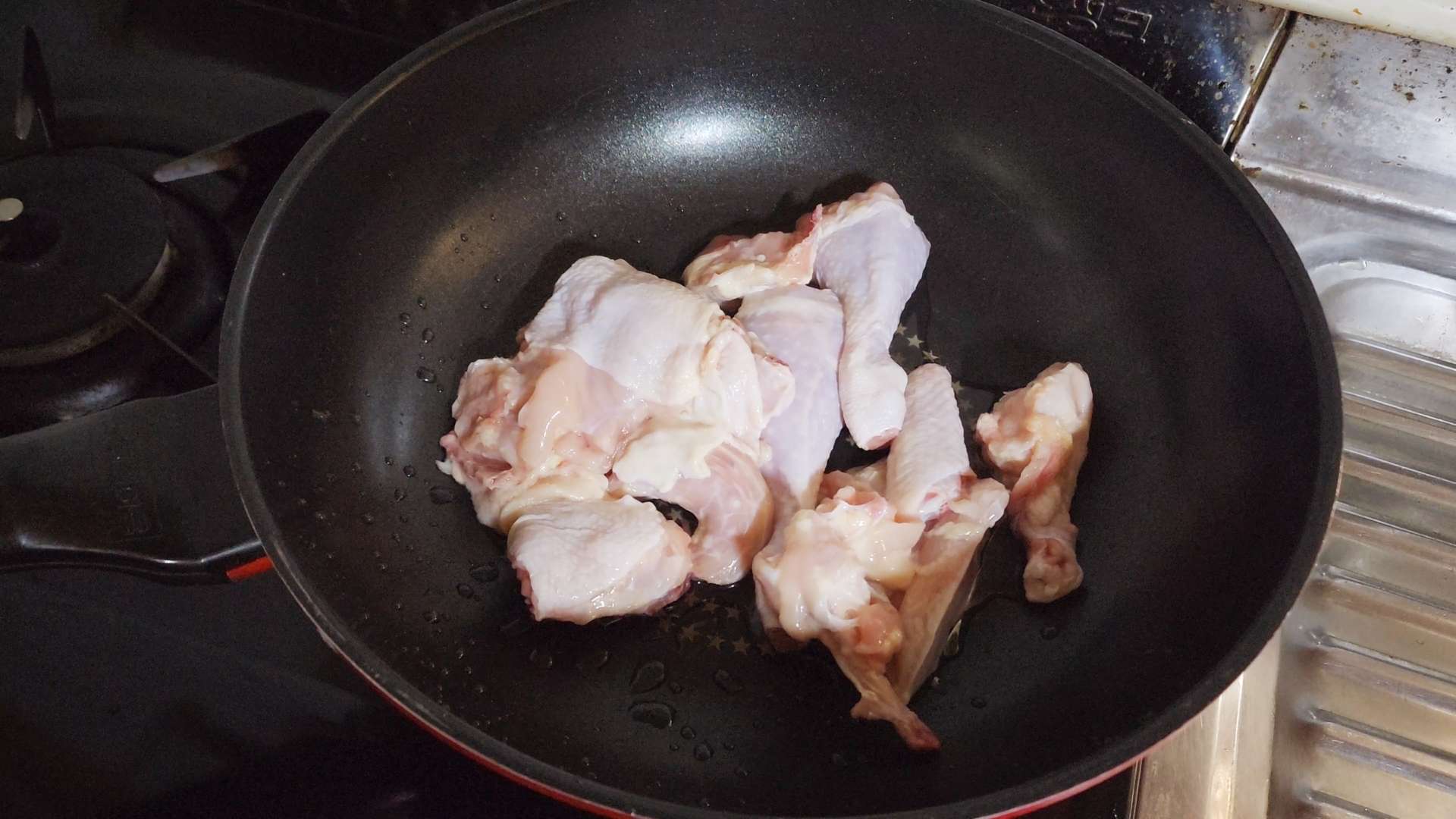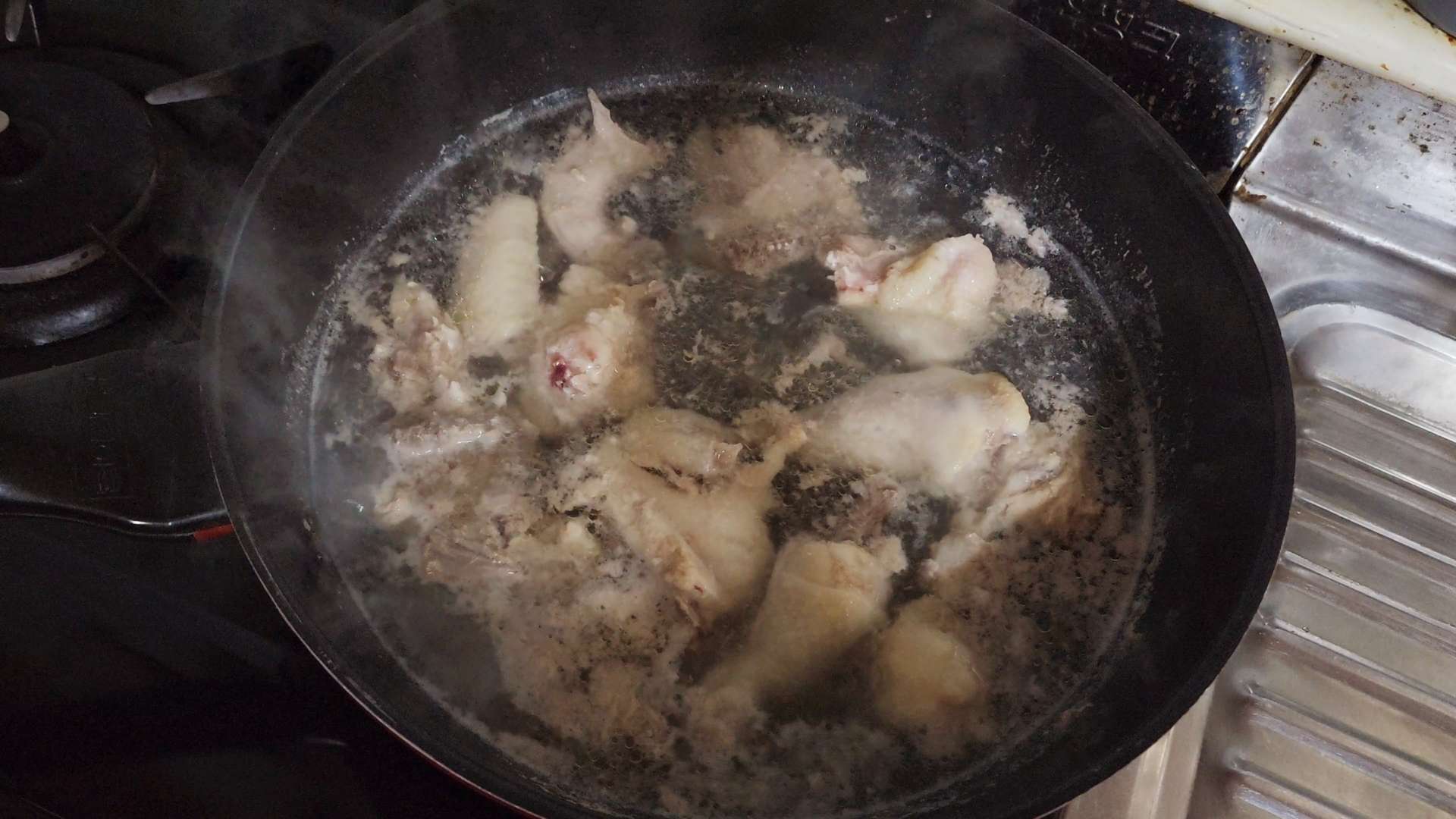 닭은 먹기 좋은 크기로 자르고 불순물을 제거하고 깨끗이 씻어줍니다. 팬에 닭, 물 3컵을 넣고 끓여줍니다.