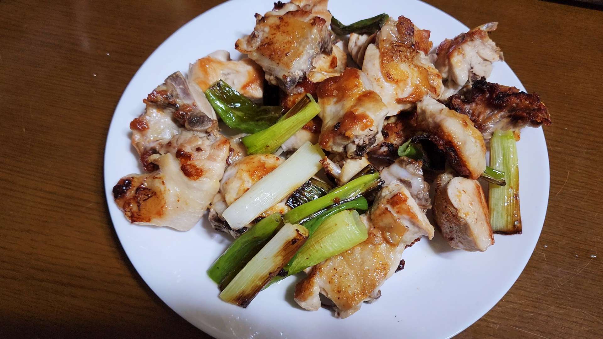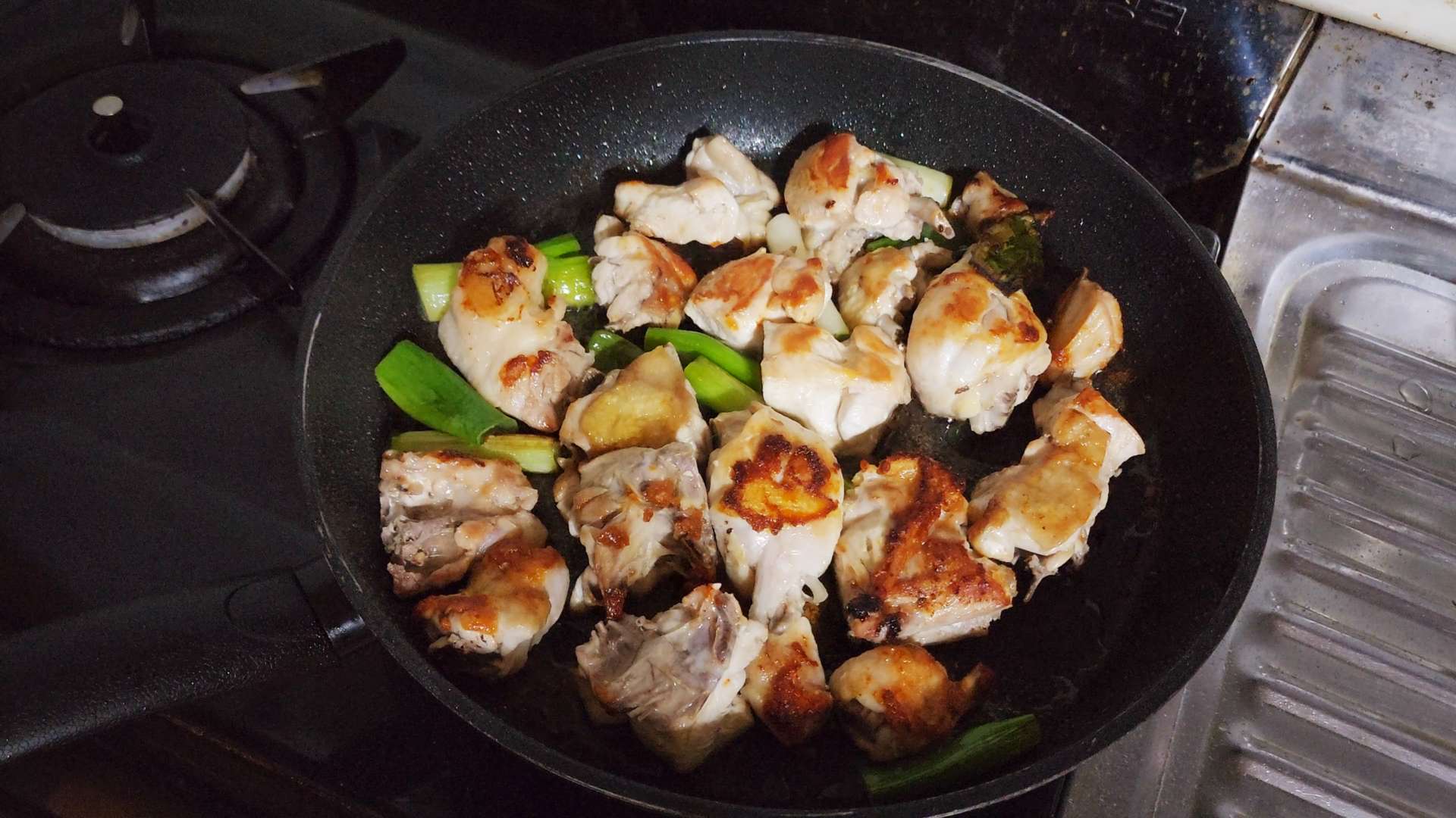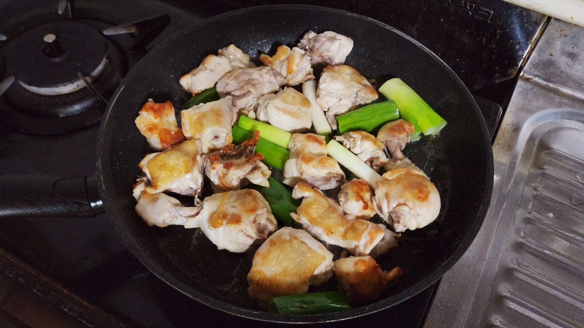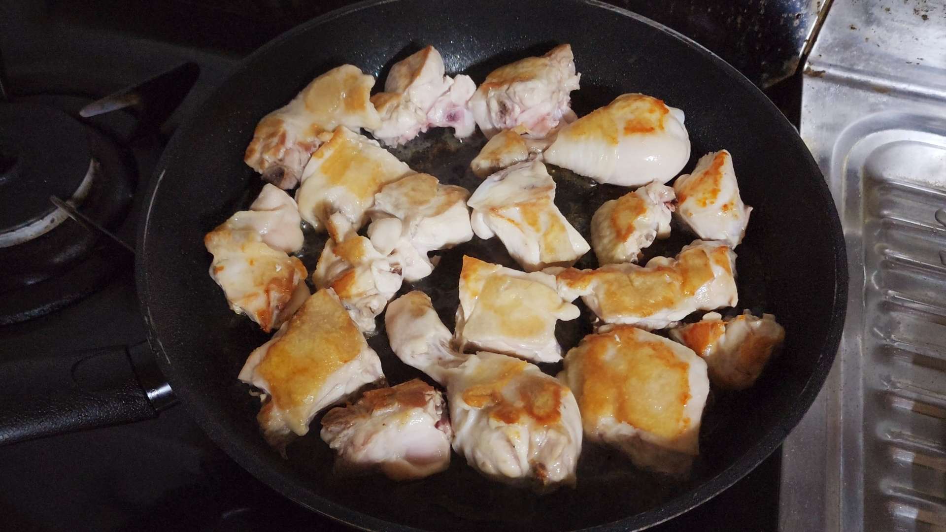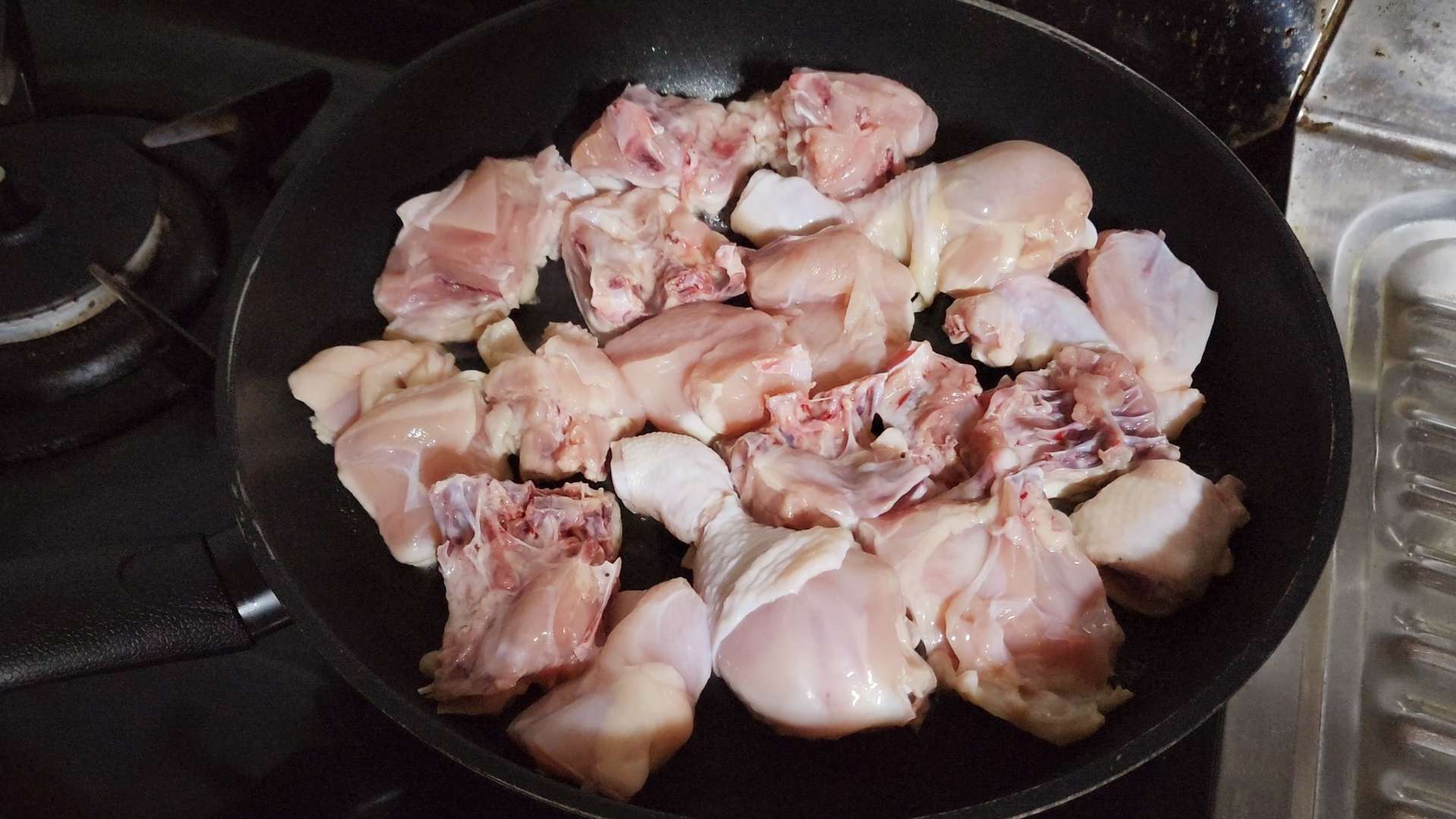 강불로 예열한 팬에 닭은 껍질부터 올려줍니다.