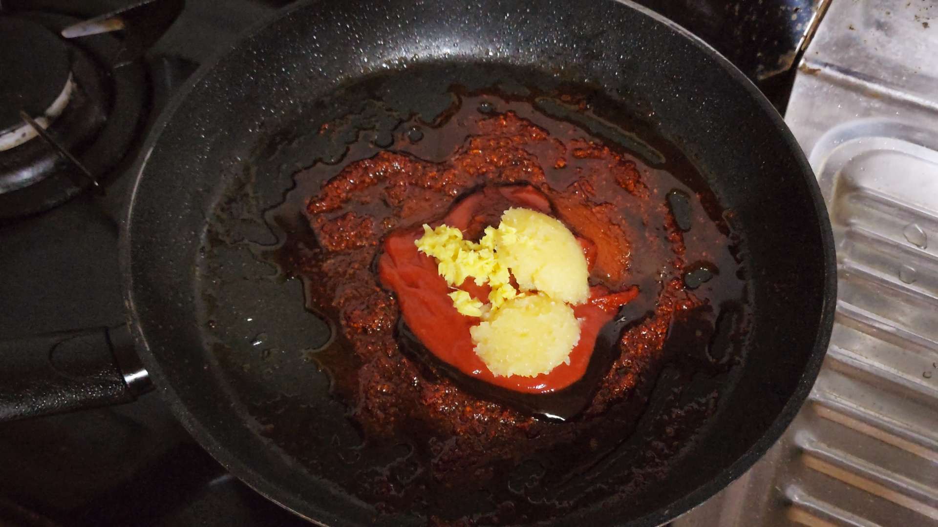 설탕 3T, 간장 3T, 굴소스 2T, 케첩 4T, 고추장 1T, 다진 마늘 2T, 다진 생강 0.5T을 넣고 약불에서 볶아줍니다.