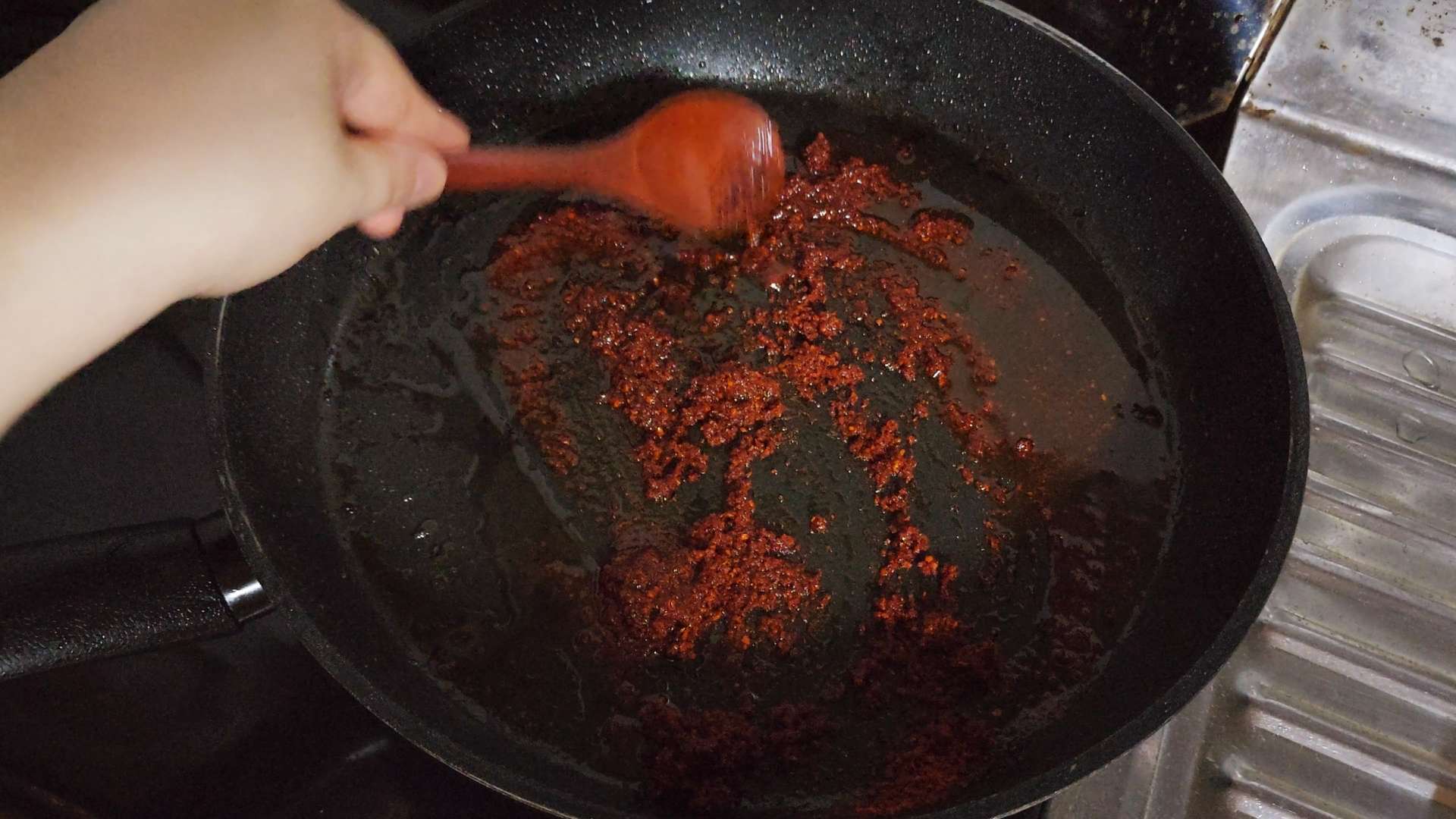 식용유, 고춧가루 4T를 넣고 남은 닭기름에 불을 끈 채로 볶아 고추기름을 내줍니다.