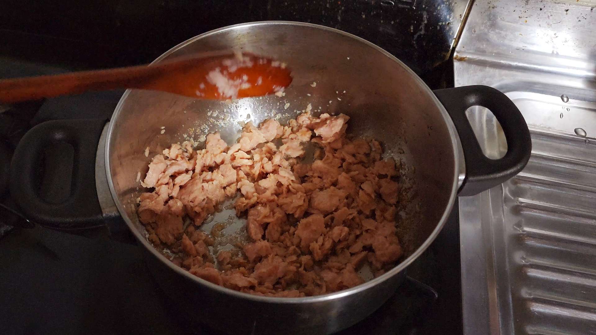 냄비에 스팸을 넣고 중불에 볶아 기름을 내줍니다.