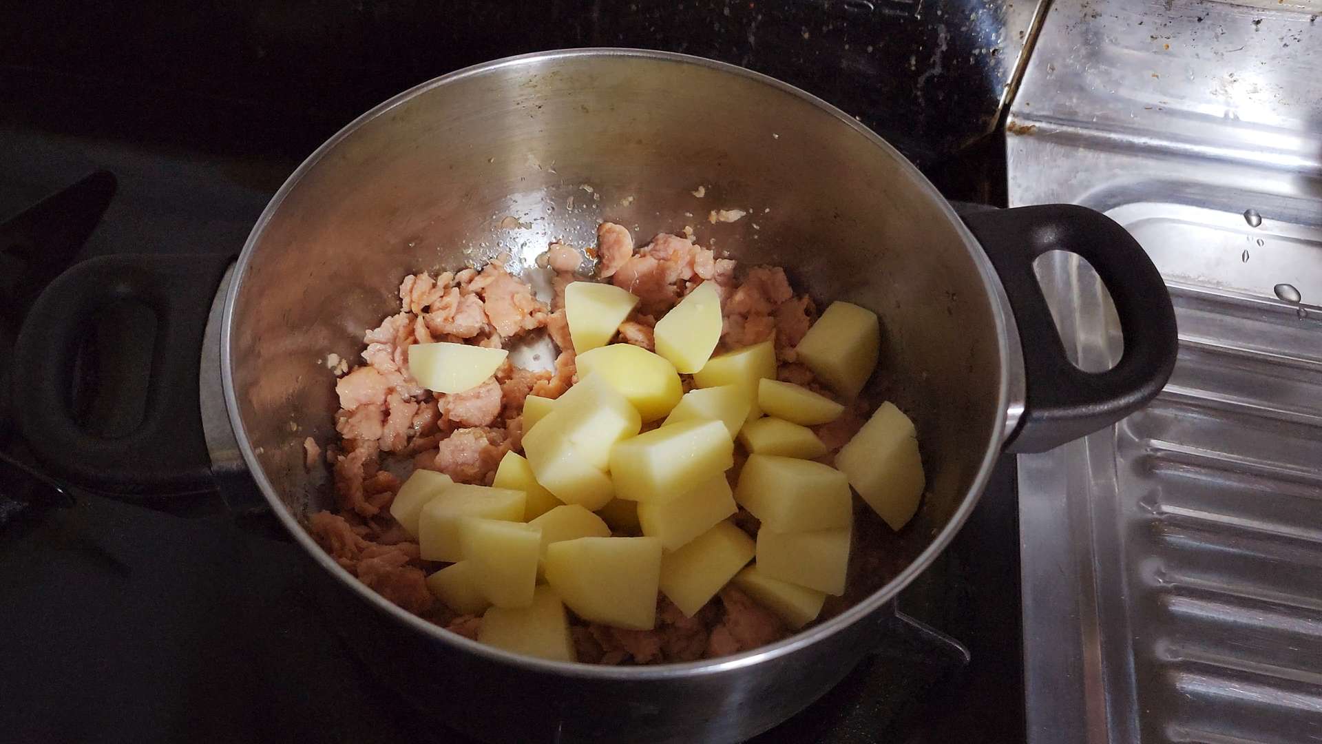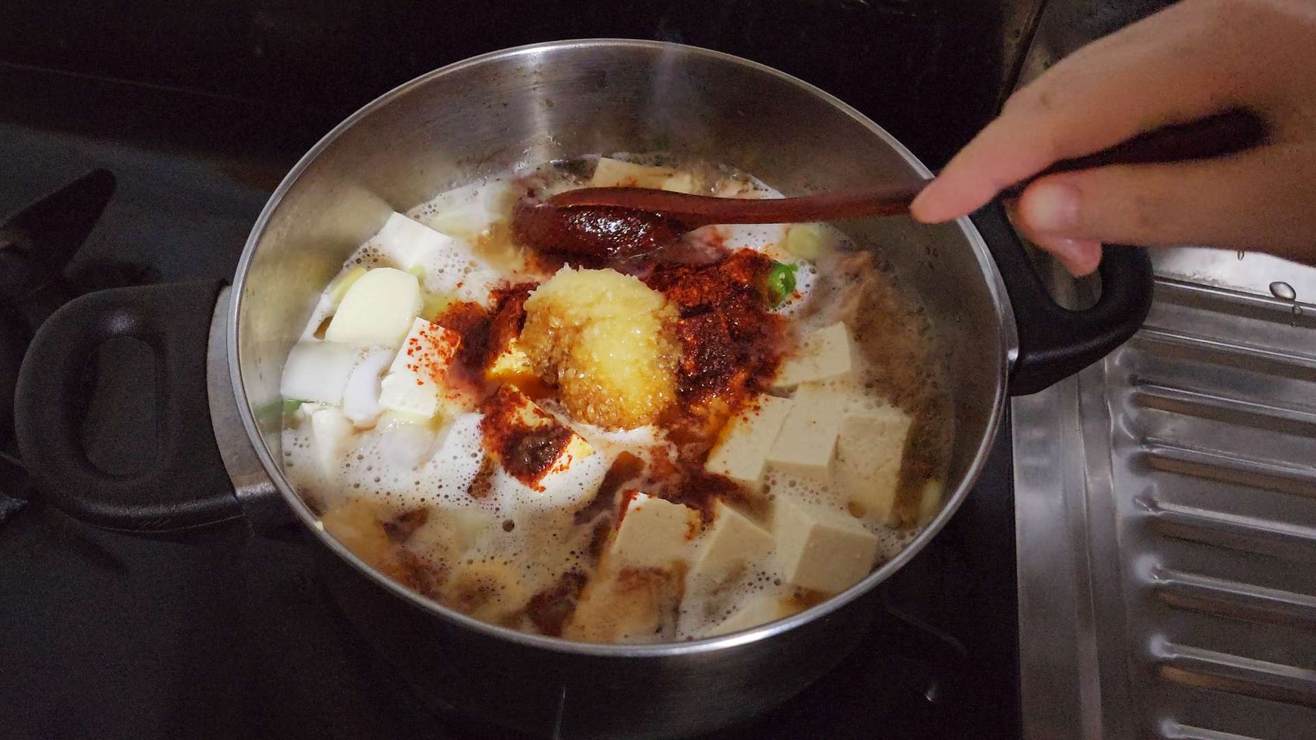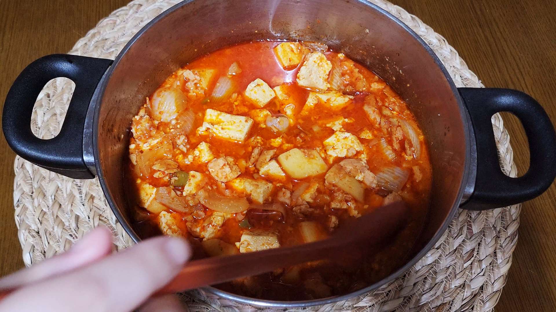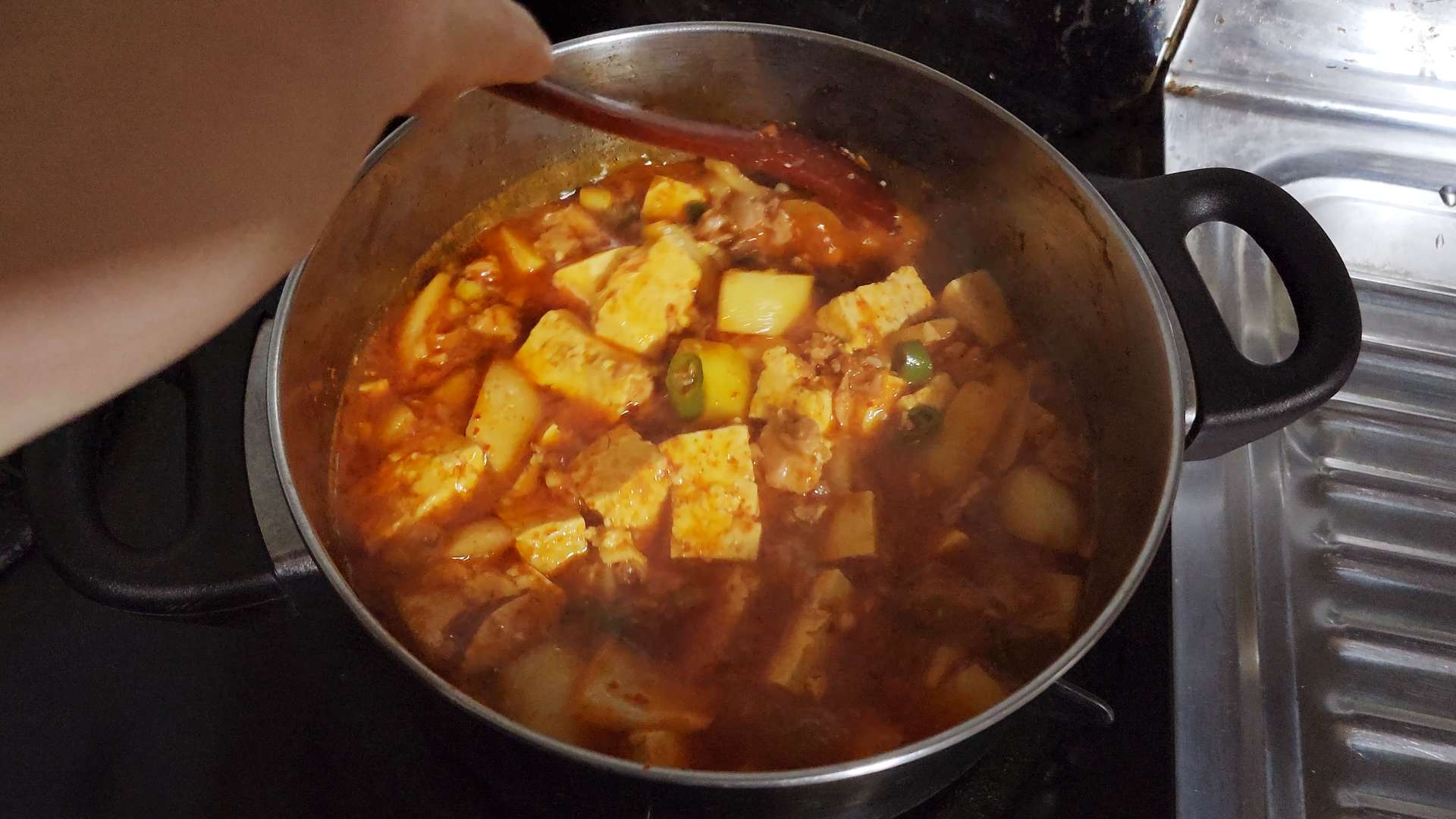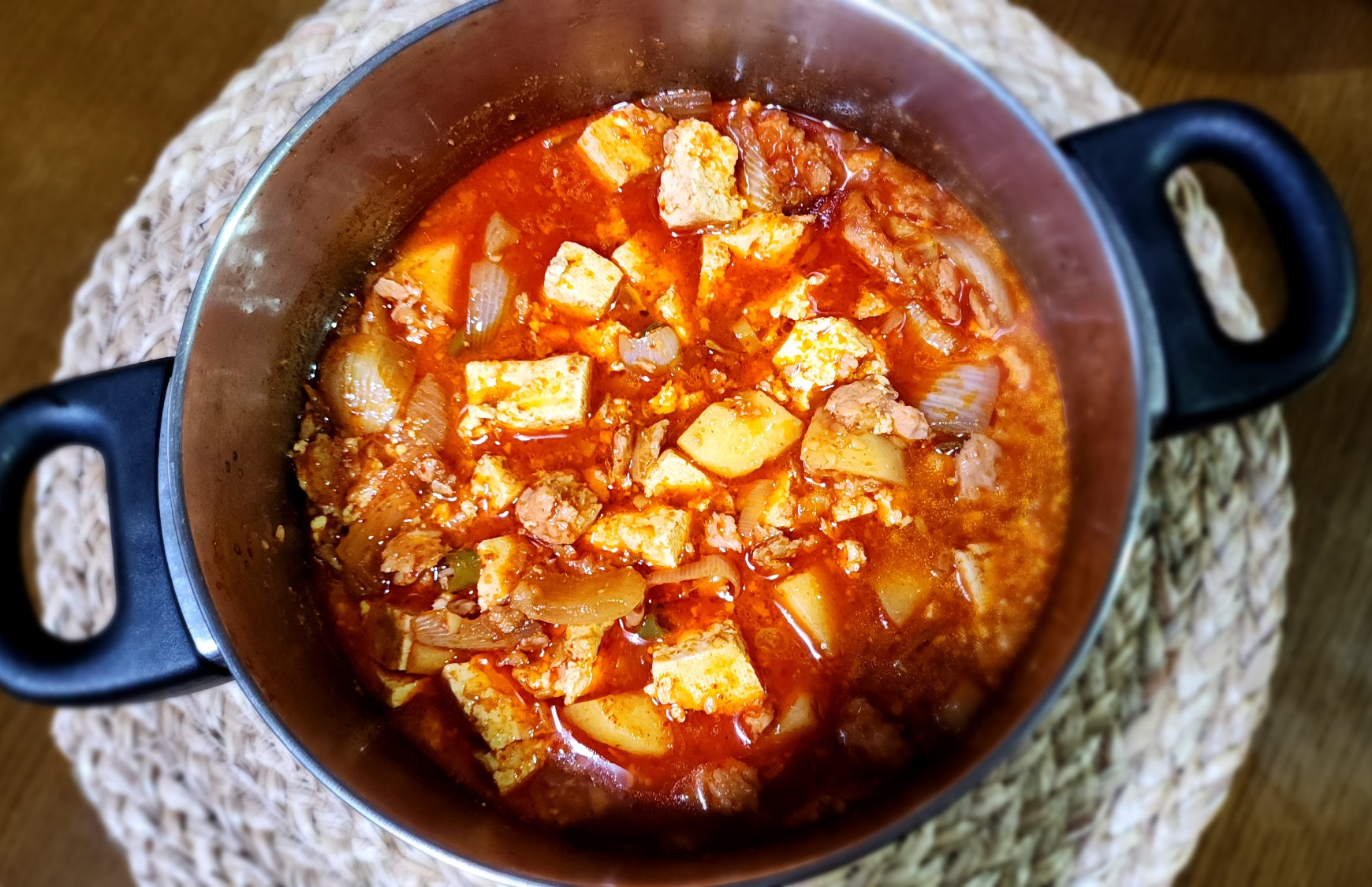 재료: 스팸 200g, 물 400ml, 감자 2개, 양파 1/2개, 두부 1모, 대파 1/2대, 청양고추 3개, 고춧가루 2T, 설탕 1T, 다진마늘 1T, 진간장 3T, 참치액 1T,