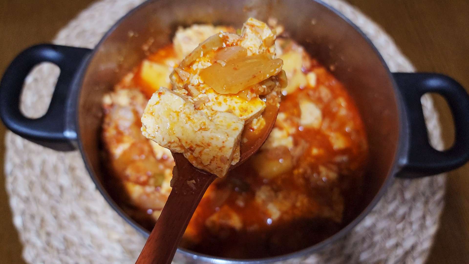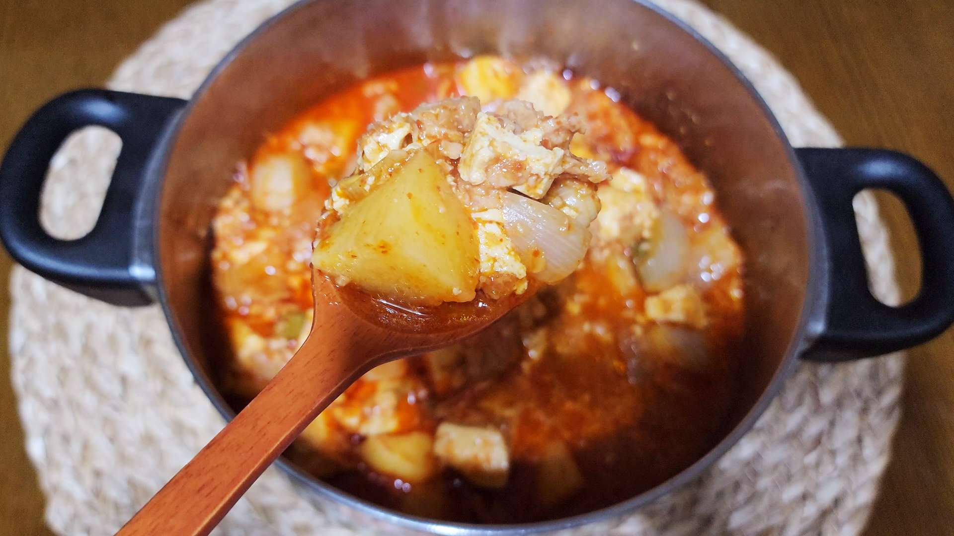 부드러운 스팸과 잘 익은 감자가 얼큰하고 진한 국물과 같이 먹으면 맛있답니다.