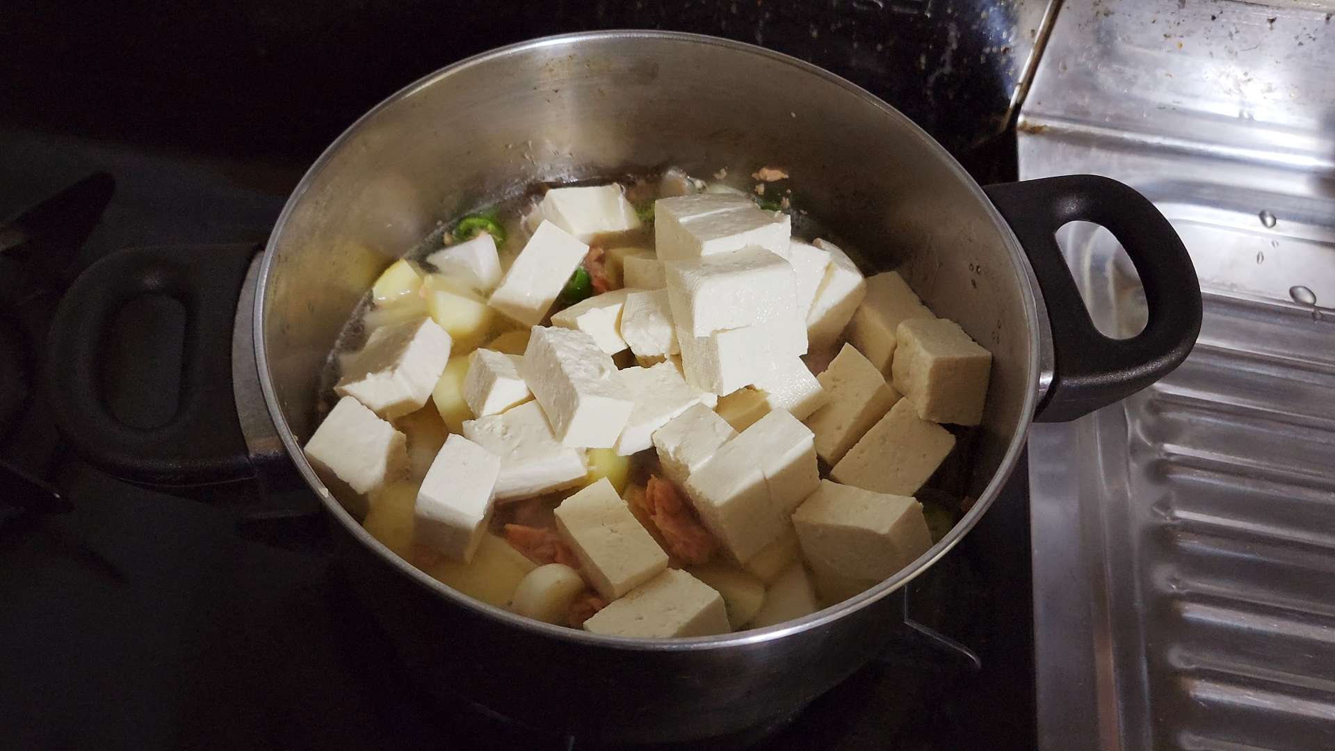 감자, 양파, 대파, 청양고추, 물, 두부를 넣어줍니다.