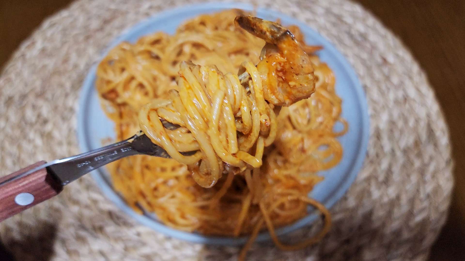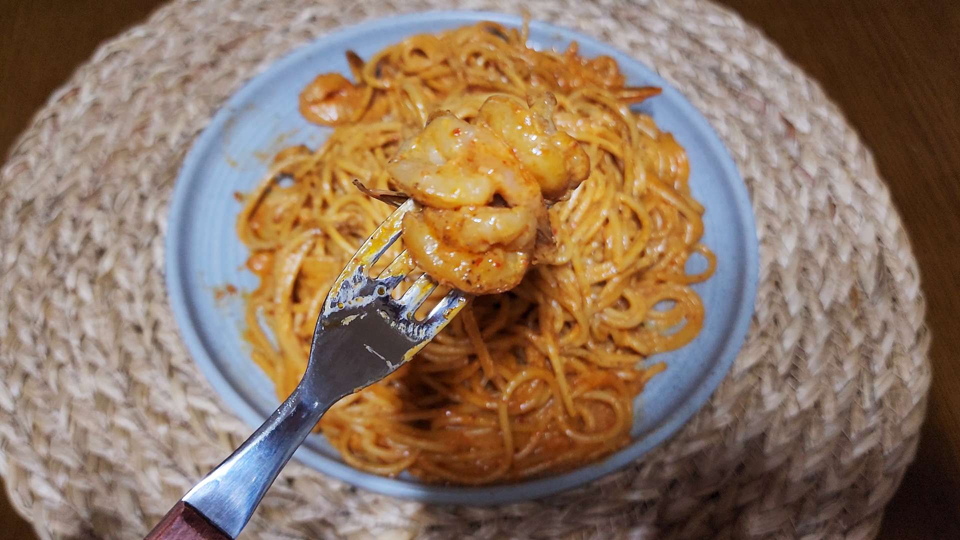 매콤하고 고소한 소스에 버무린 파스타면과 쫄깃한 버터갈릭새우를 같이 먹으면 맛있답니다.