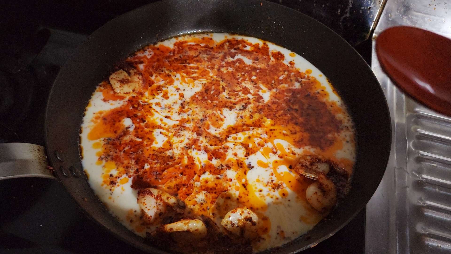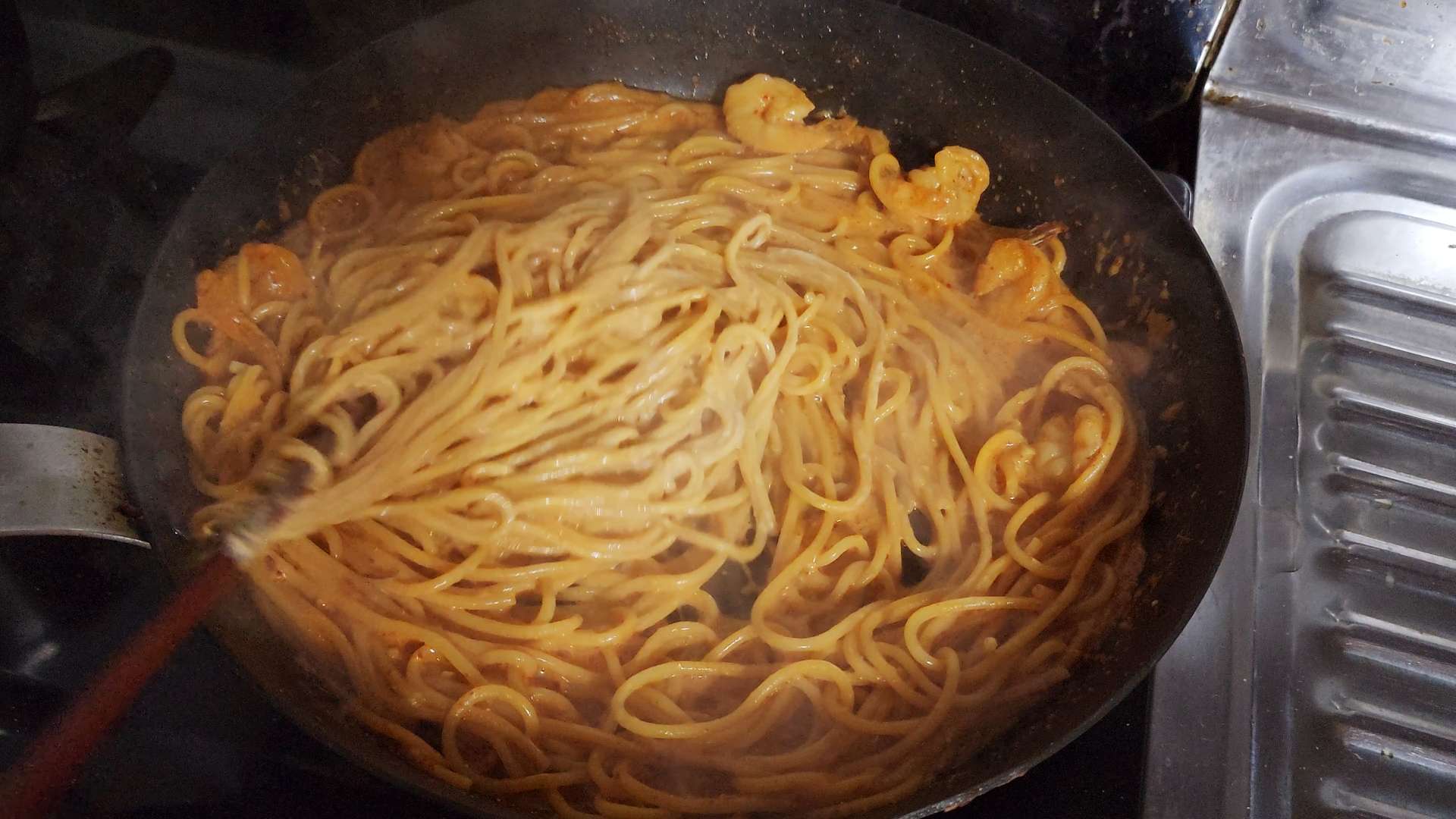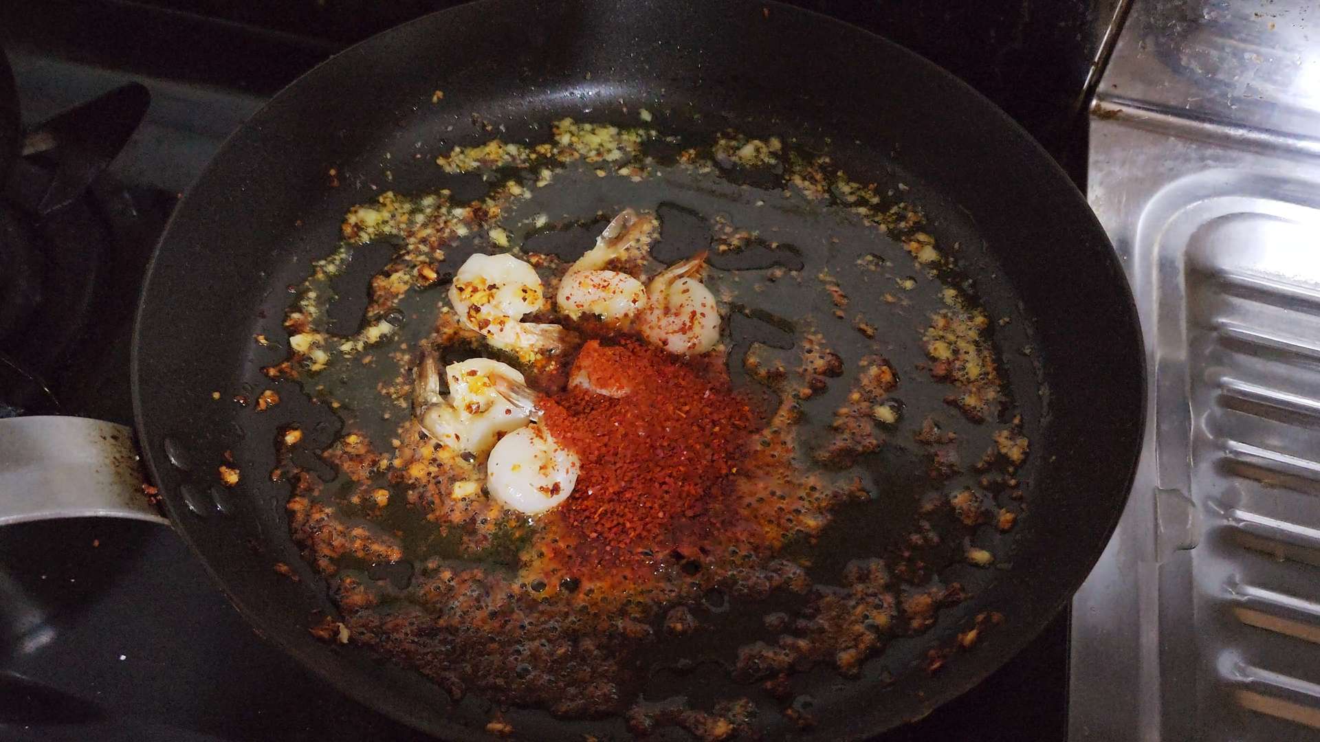 재료: 스파게티 면 2인분, 냉동 새우 6마리, 마요네즈 듬뿍 1T, 버터 40g, 다진 마늘 0.5T, 고춧가루 1T,