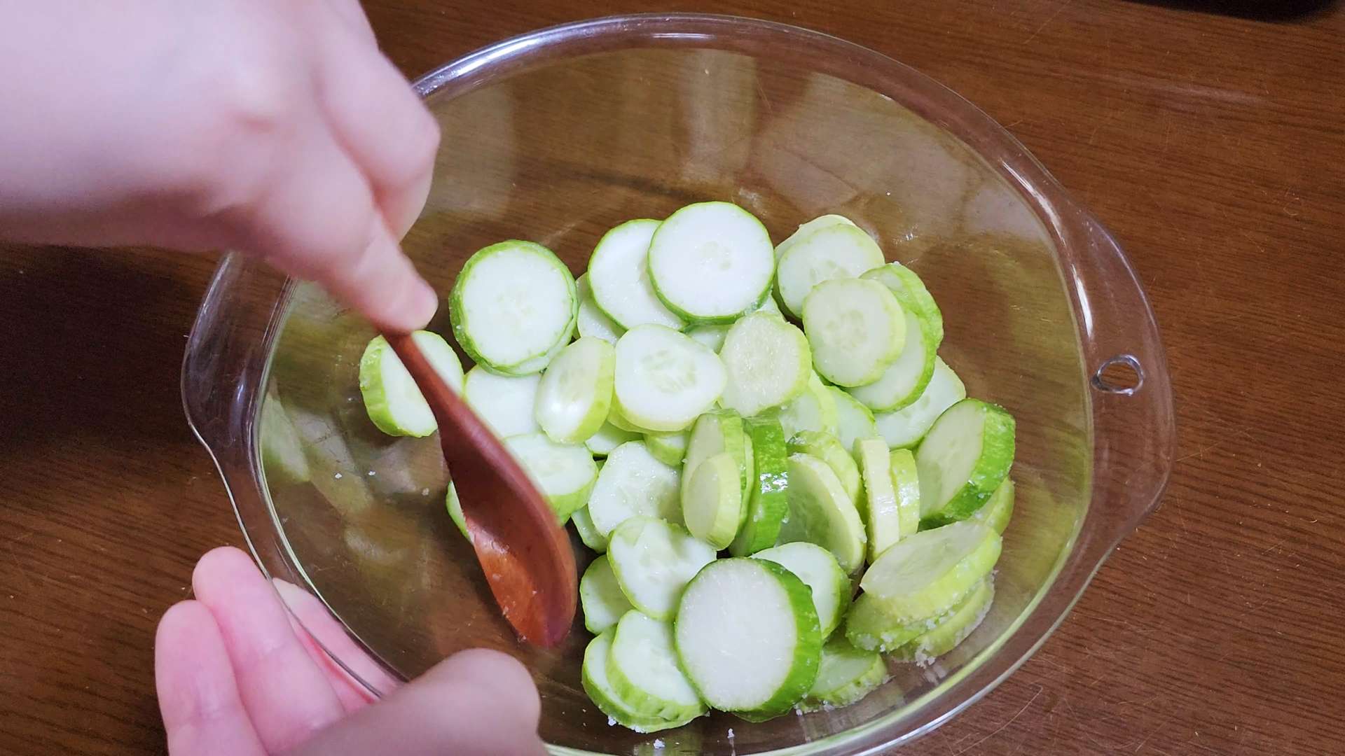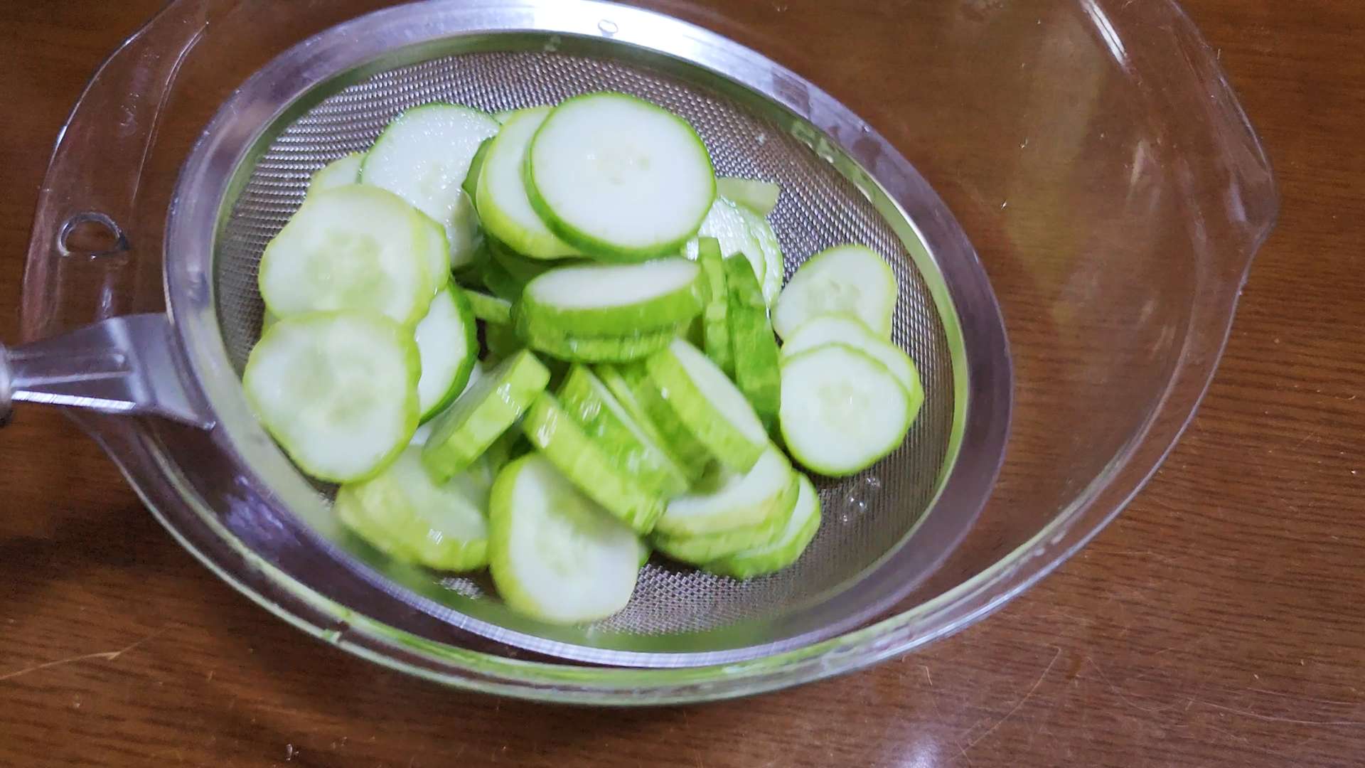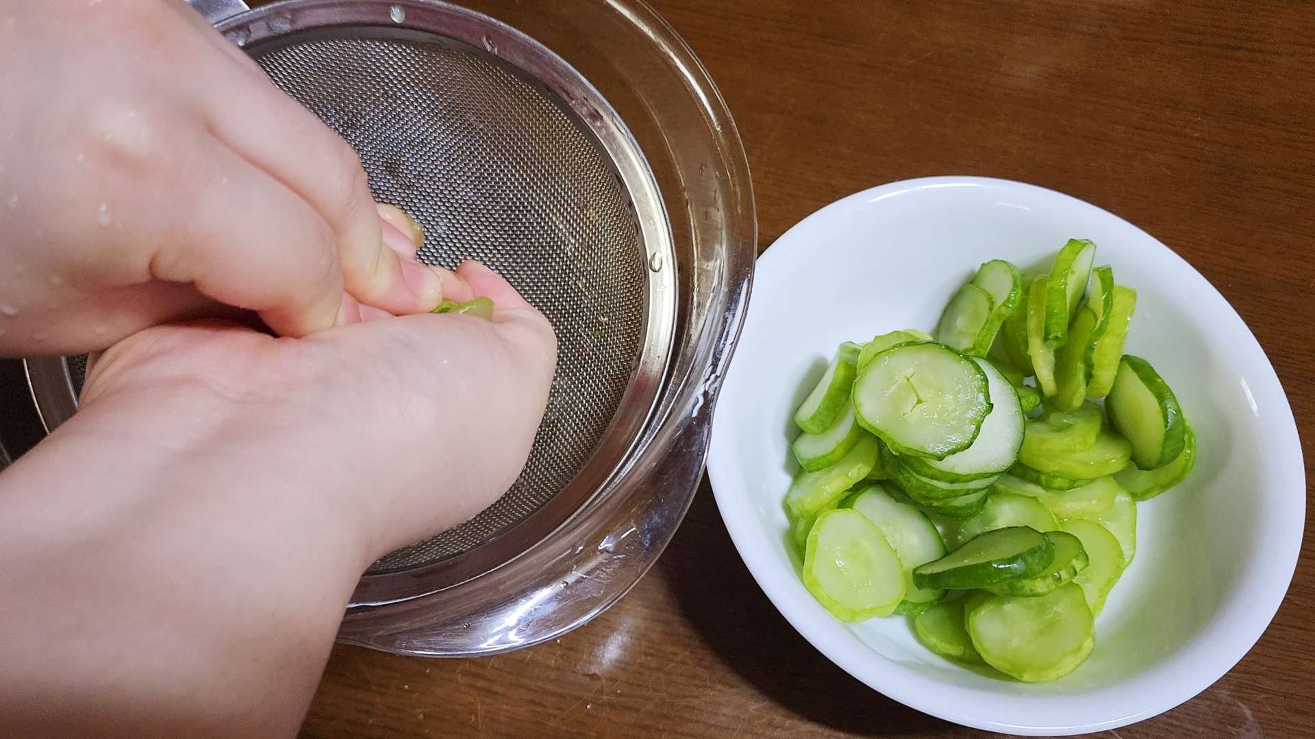 오이는 체반에 밭쳐 물기를 짜줍니다.