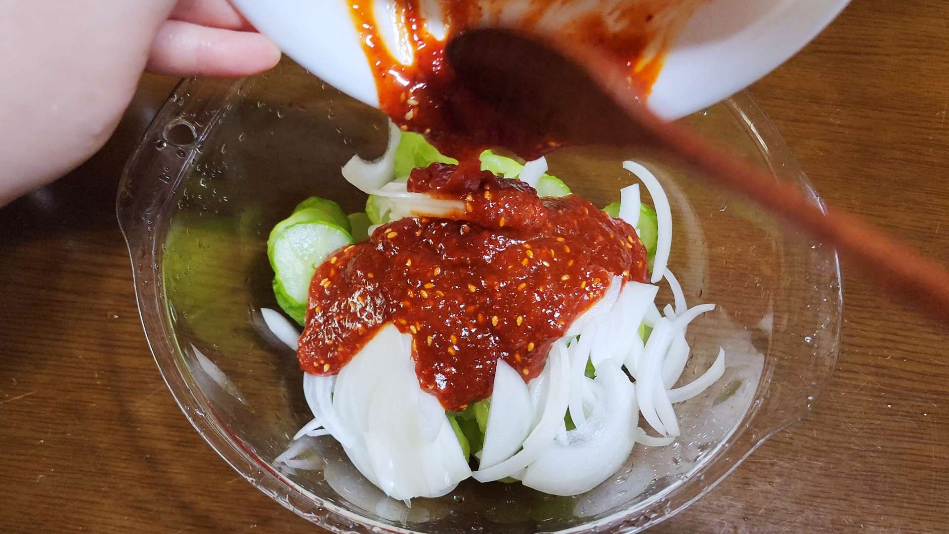 볼에 오이, 양파, 양념장을 넣고 무쳐줍니다.