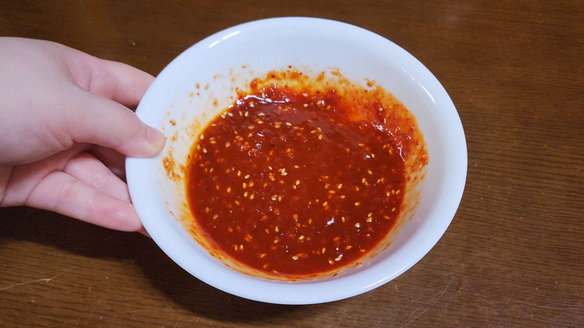 양념: 고추장 1T, 고춧가루 1T, 설탕 1T, 올리고당 1T, 다진마늘 1/2T, 간장 1T, 식초 1.5T, 참기름 1T, 통깨