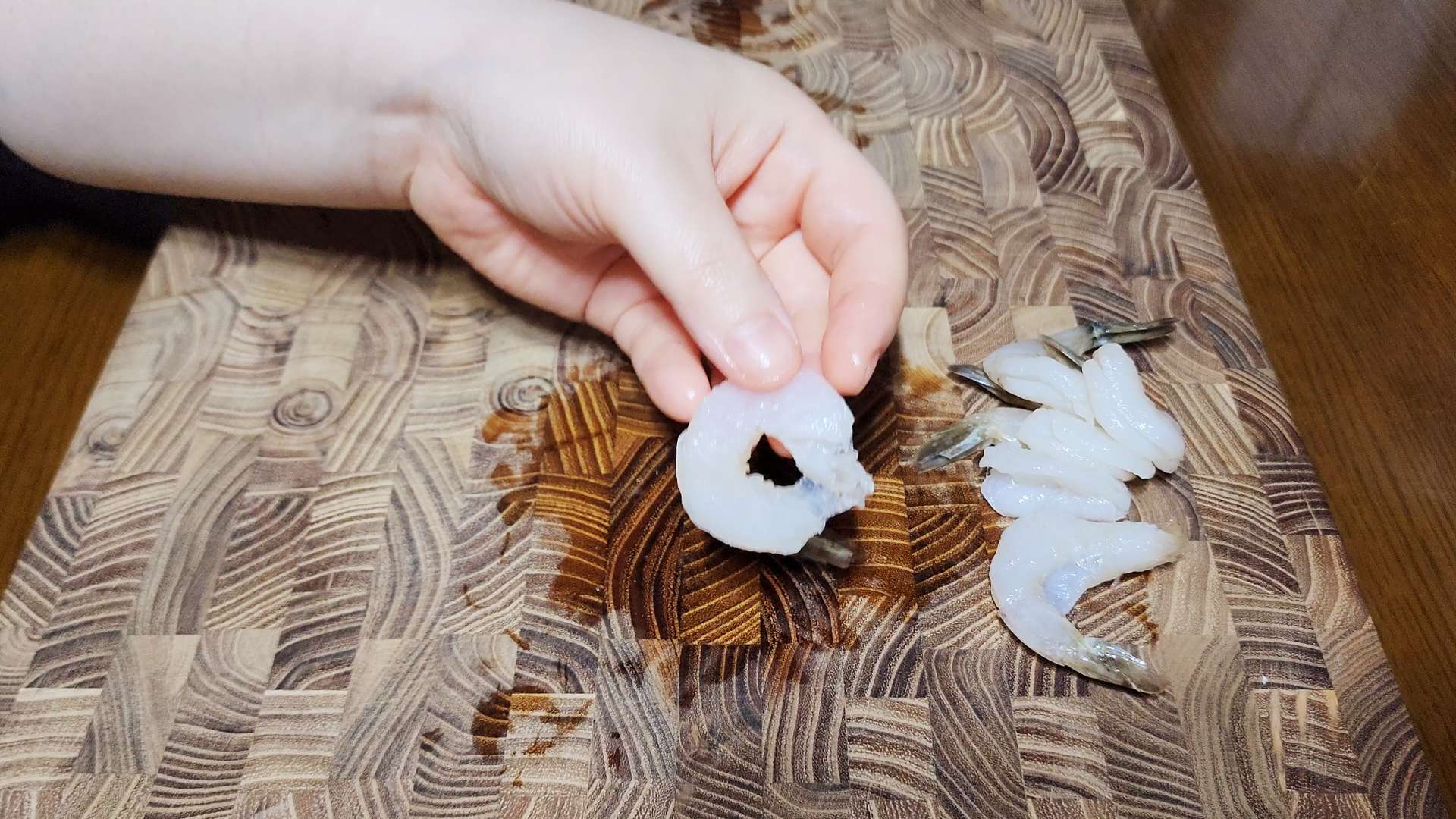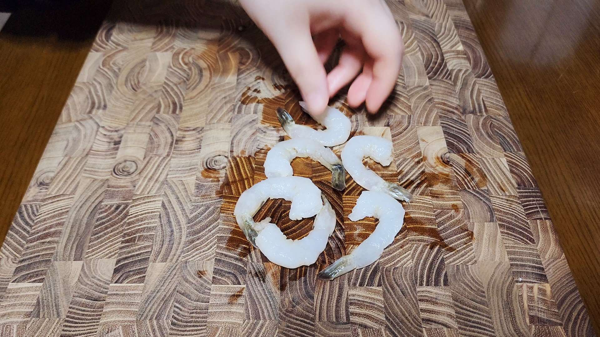 냉동새우는 흐르는 물에 씻어 해동하고, 등을 살짝