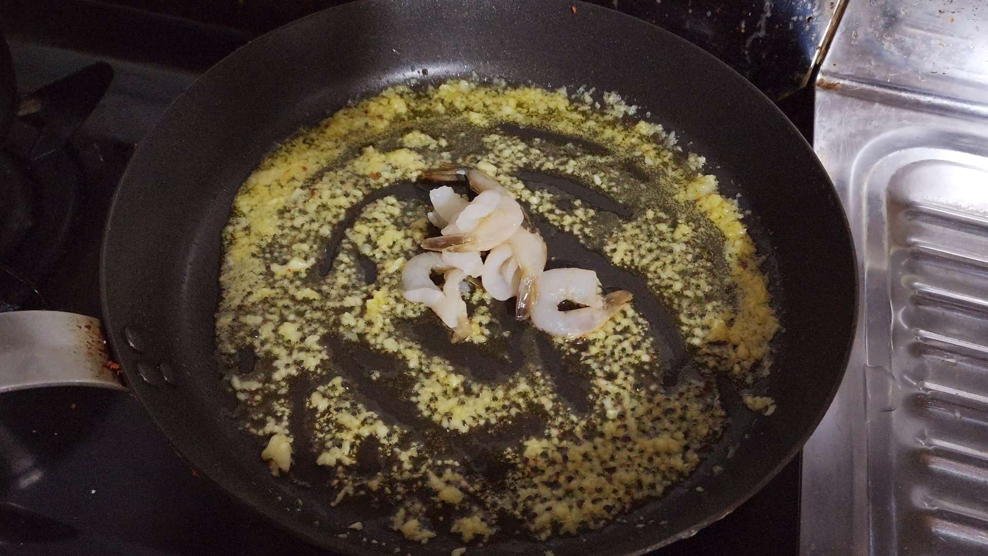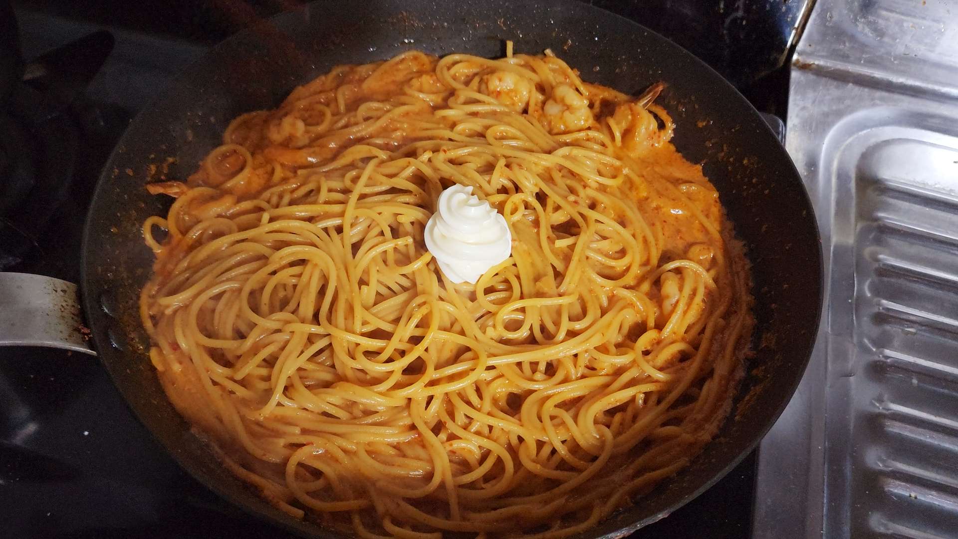 재료: 스파게티 면 2인분, 냉동 새우 6마리, 마요네즈 듬뿍 1T, 버터 40g, 다진 마늘 0.5T, 고춧가루 1T,