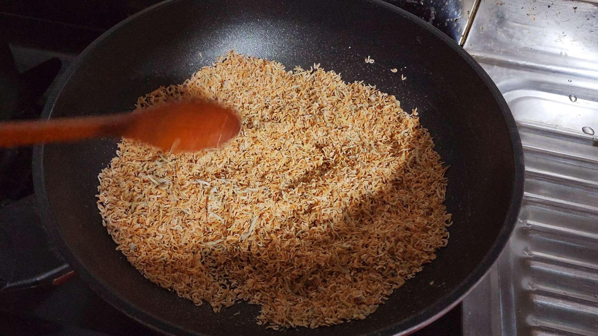 마른 팬에 밥새우를 볶아 체에 걸러 잔가루를 털어줍니다.