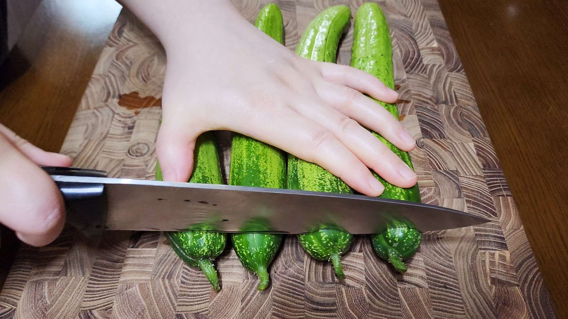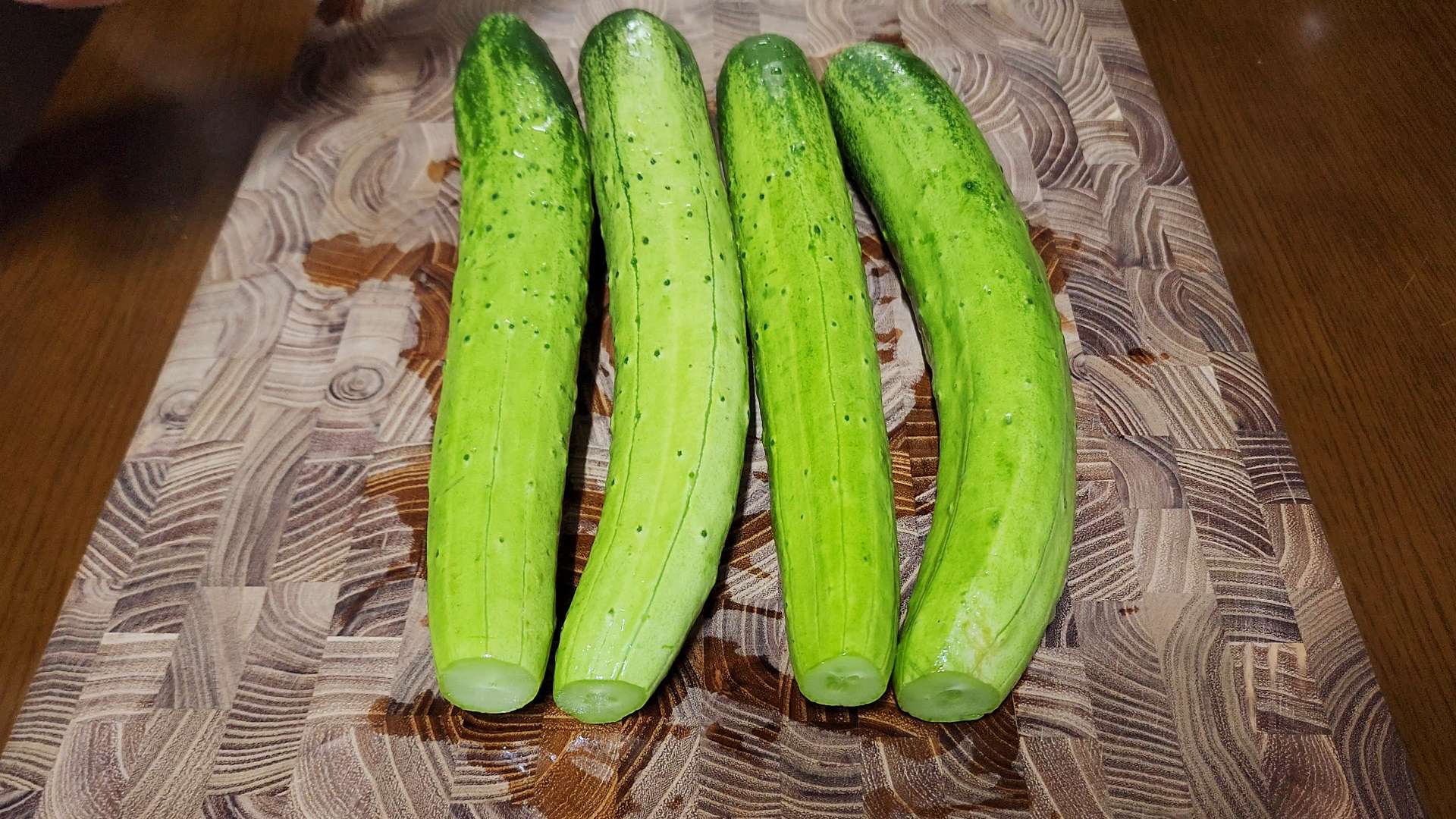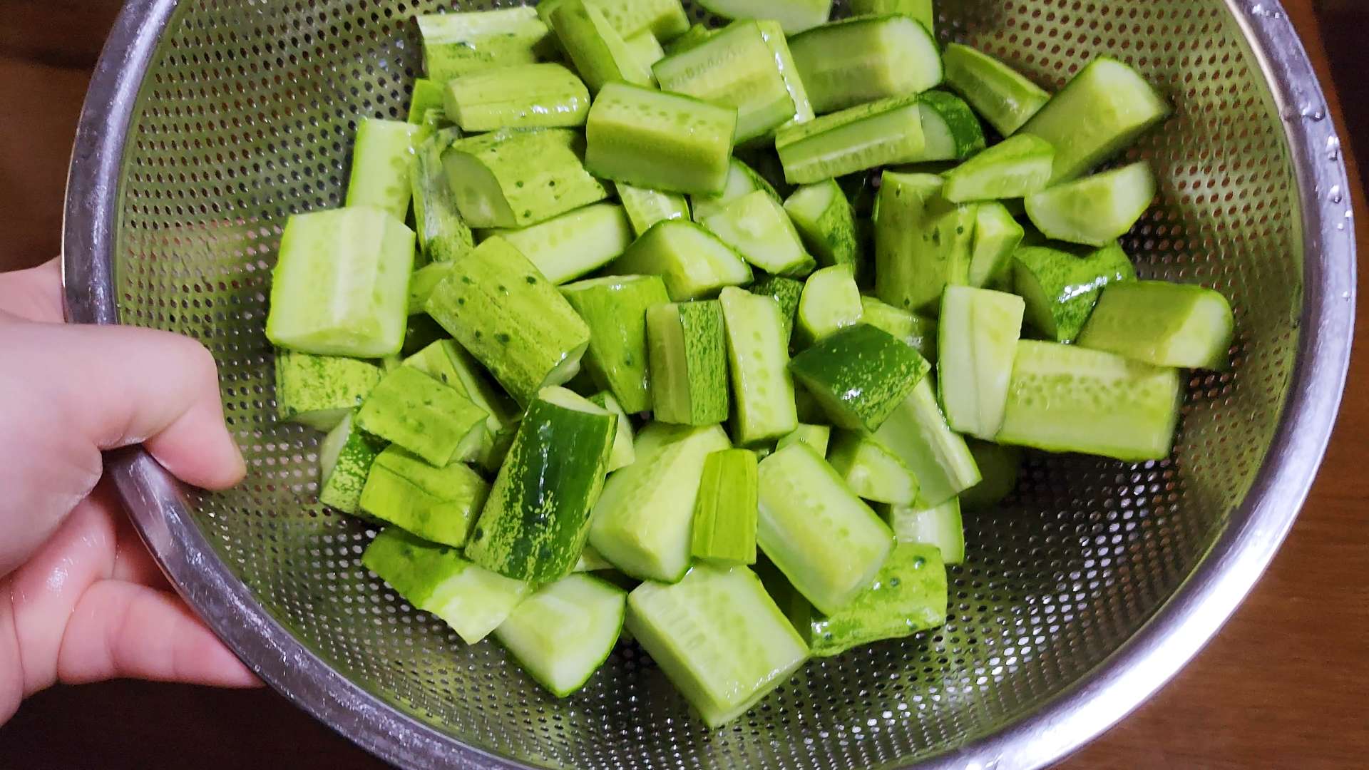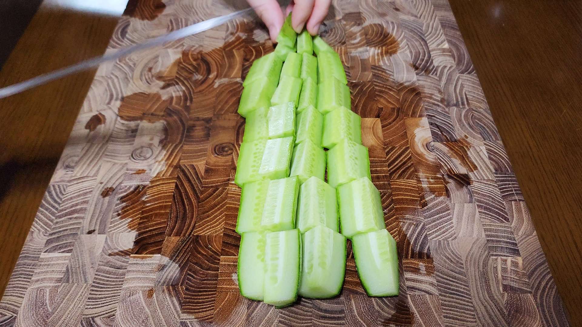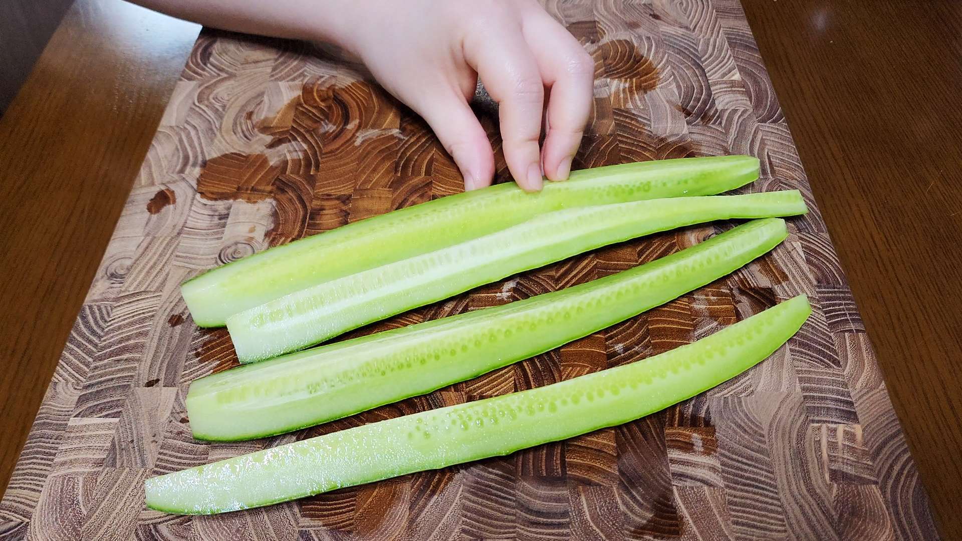 오이는 길게 4등분해 깍둑 썰어줍니다.