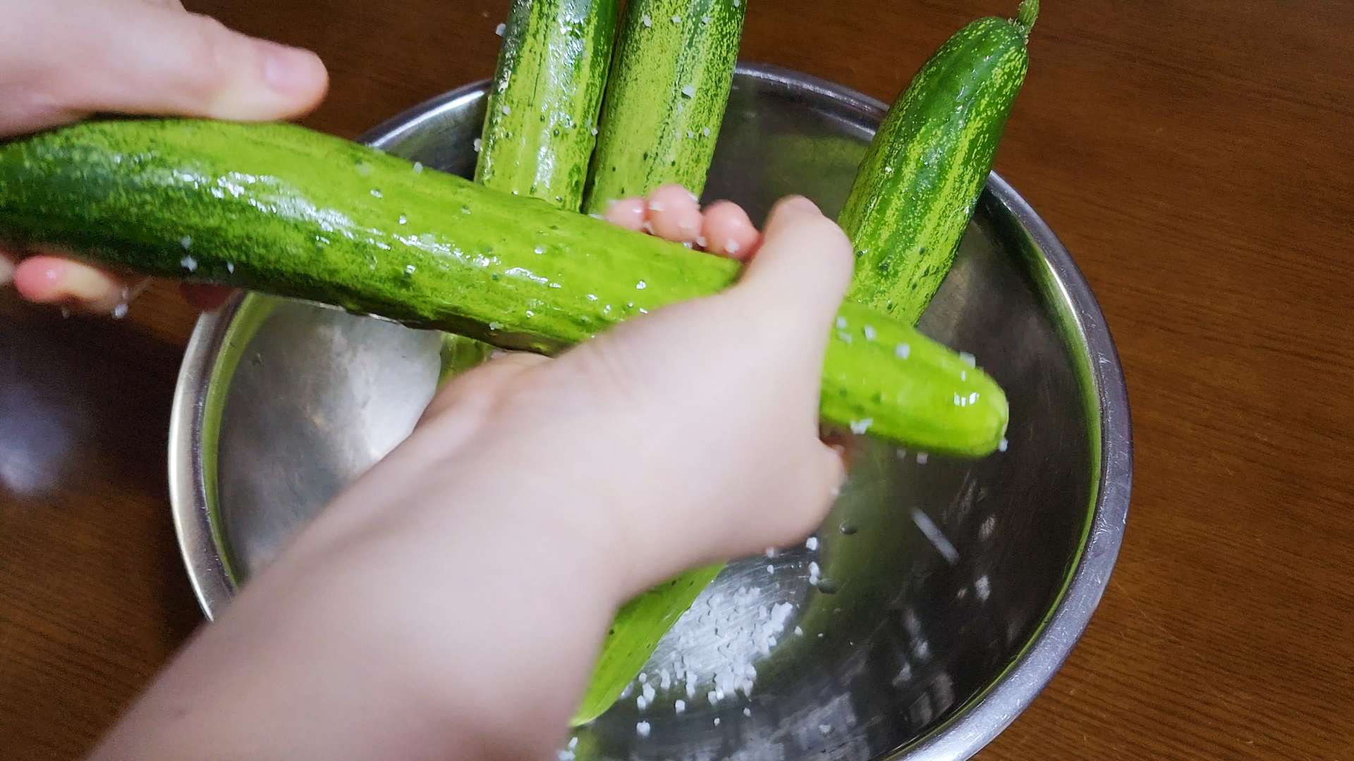 오이는 굵은소금으로 문질러 씻고 헹궈줍니다.