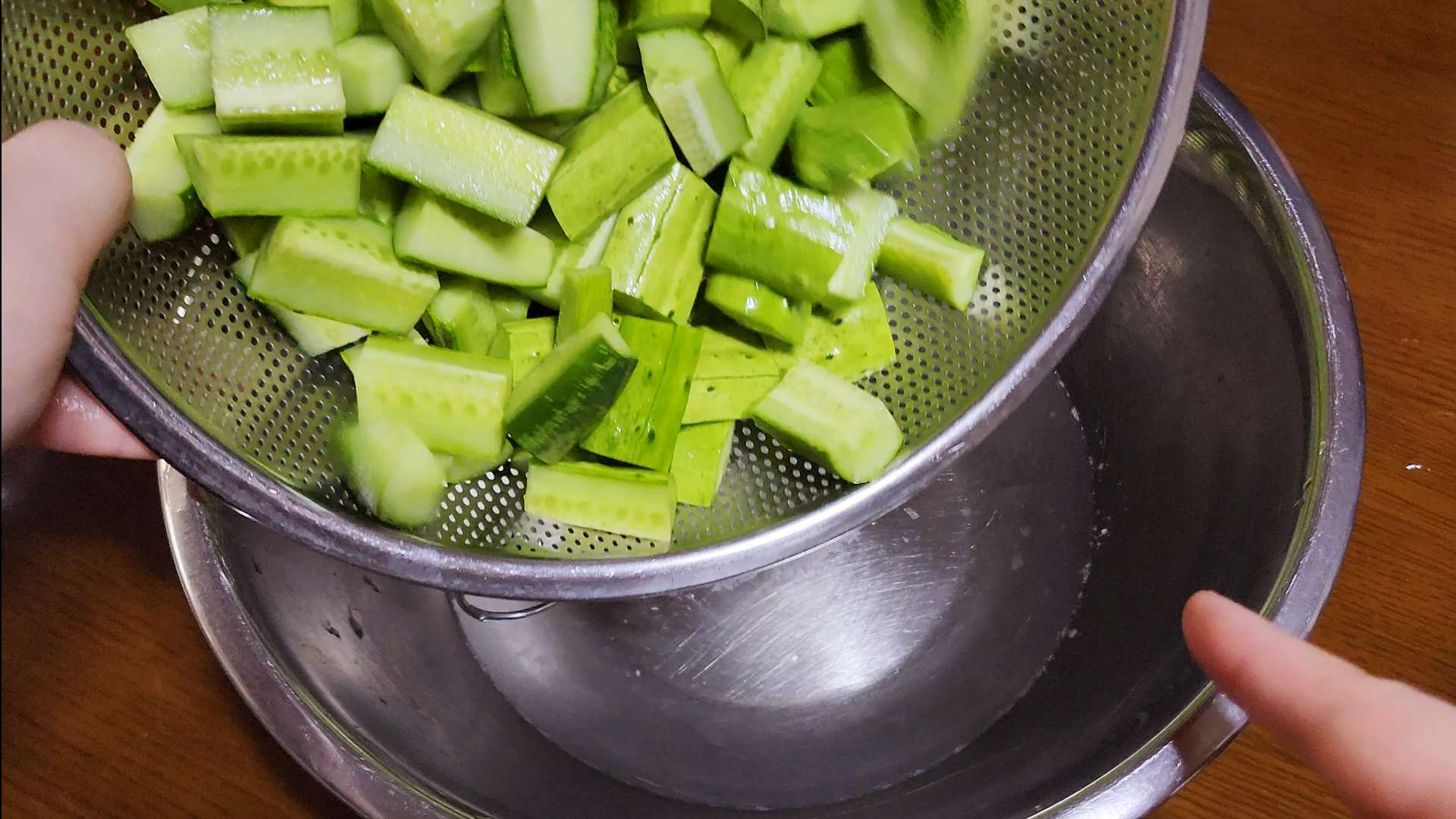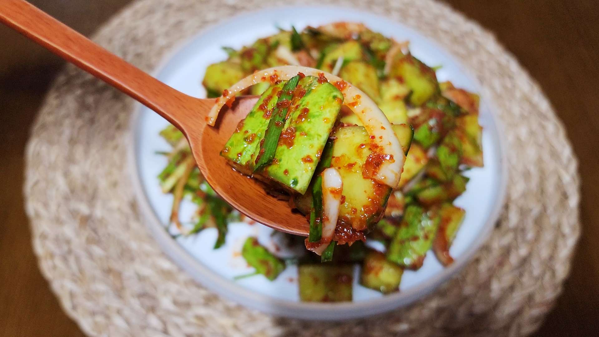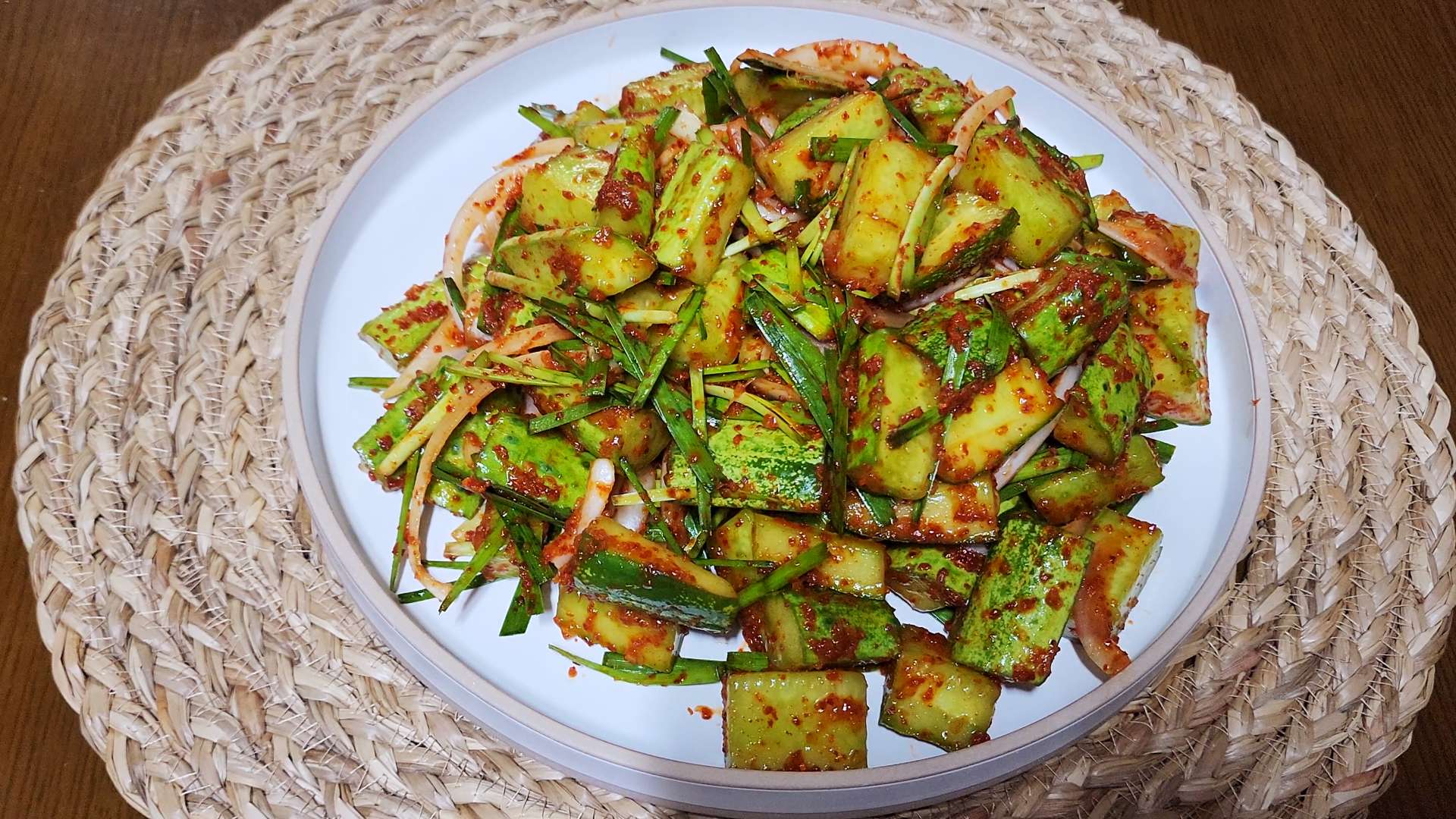 매콤달콤 짭조름한 양념이 아삭하게 절인 오이에 잘