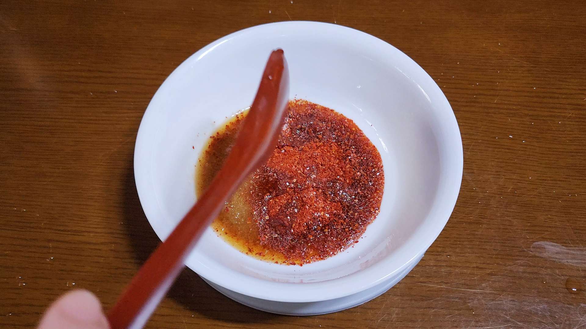 볼에 고춧가루 3T, 설탕 1T, 멸치액젓 2T, 다진마늘 1T를 넣고 섞어줍니다.