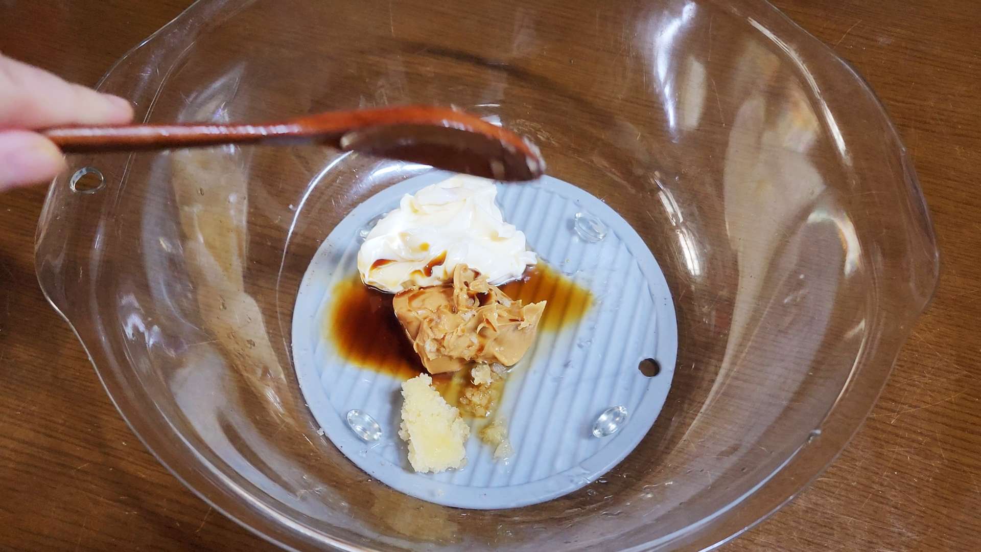 땅콩버터 2T, 마요네즈 3T, 생수 1T, 진간장 1t, 다진마늘 1t를 섞어줍니다.
