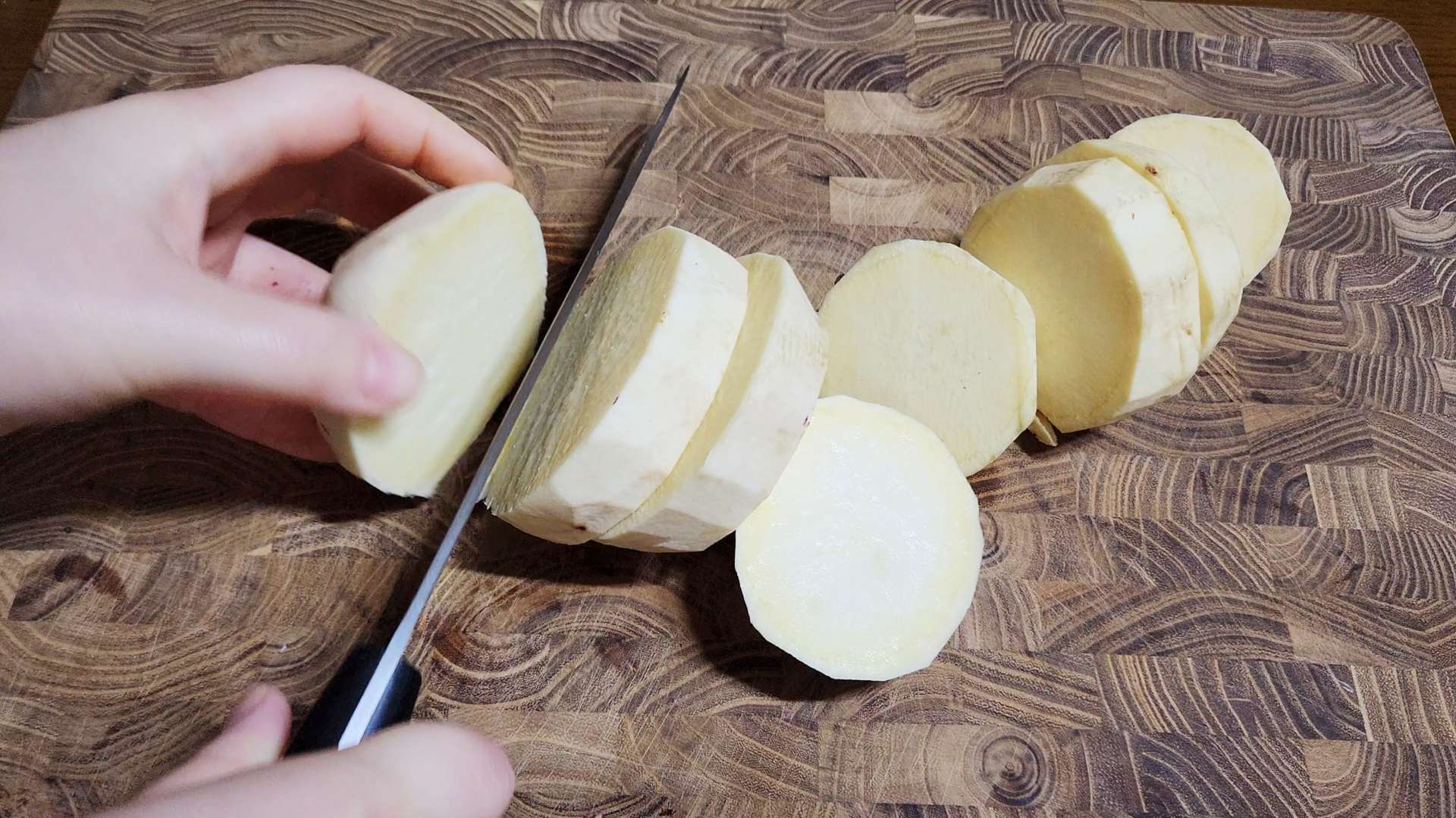 고구마는 2cm 정도 두께로 썰어줍니다.
