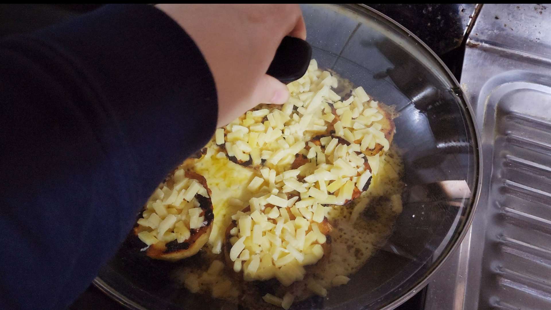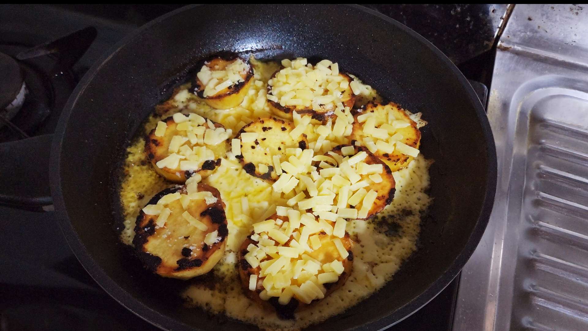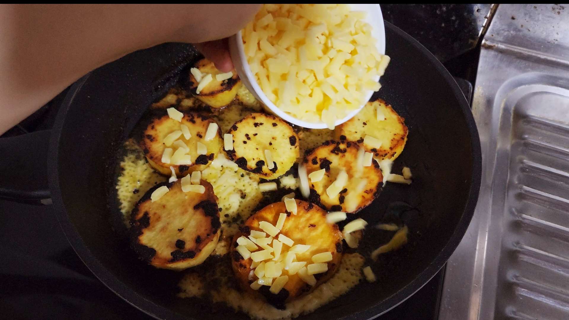 고구마 위에 슈레드 피자치즈 두 줌을 올리고 소금 3꼬집을 뿌린 뒤 뚜껑을 덮고 약불에서 5분 정도 둡니다.