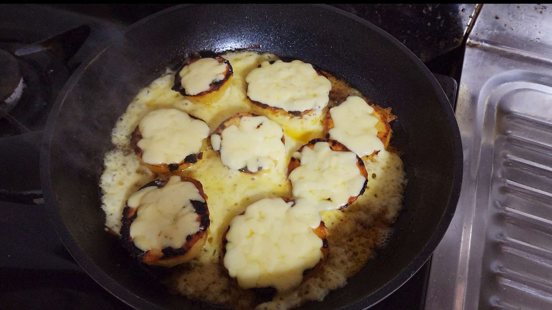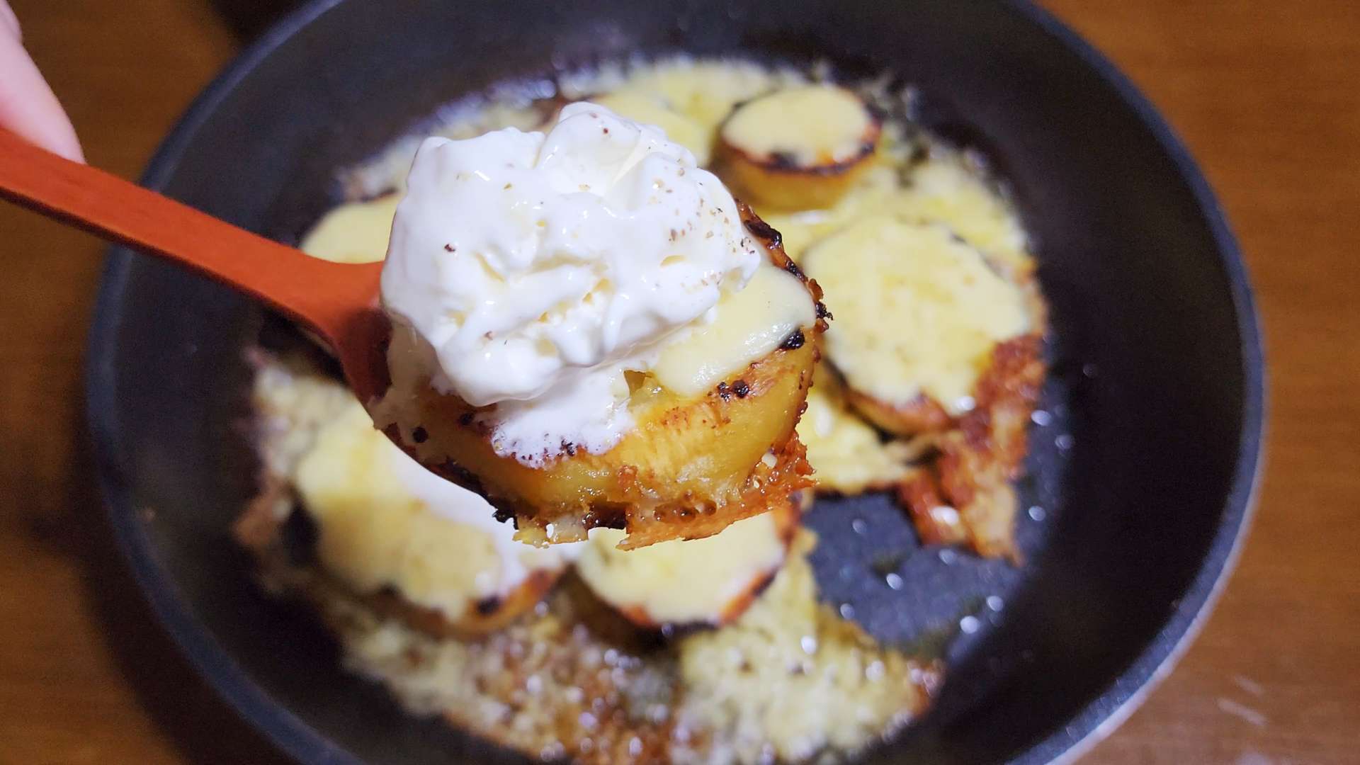 치즈가 녹으면 바닐라 아이스크림을 올리고 꿀, 통후추를 뿌려줍니다.