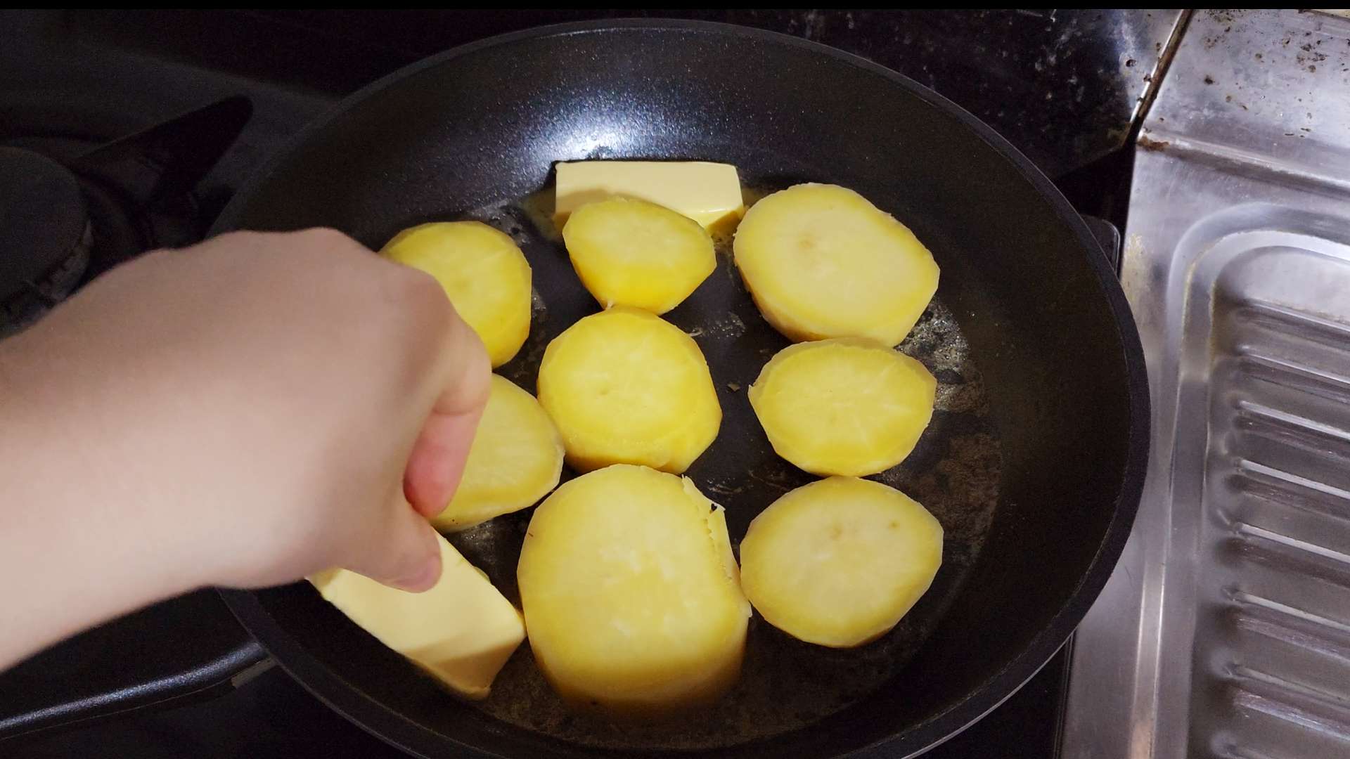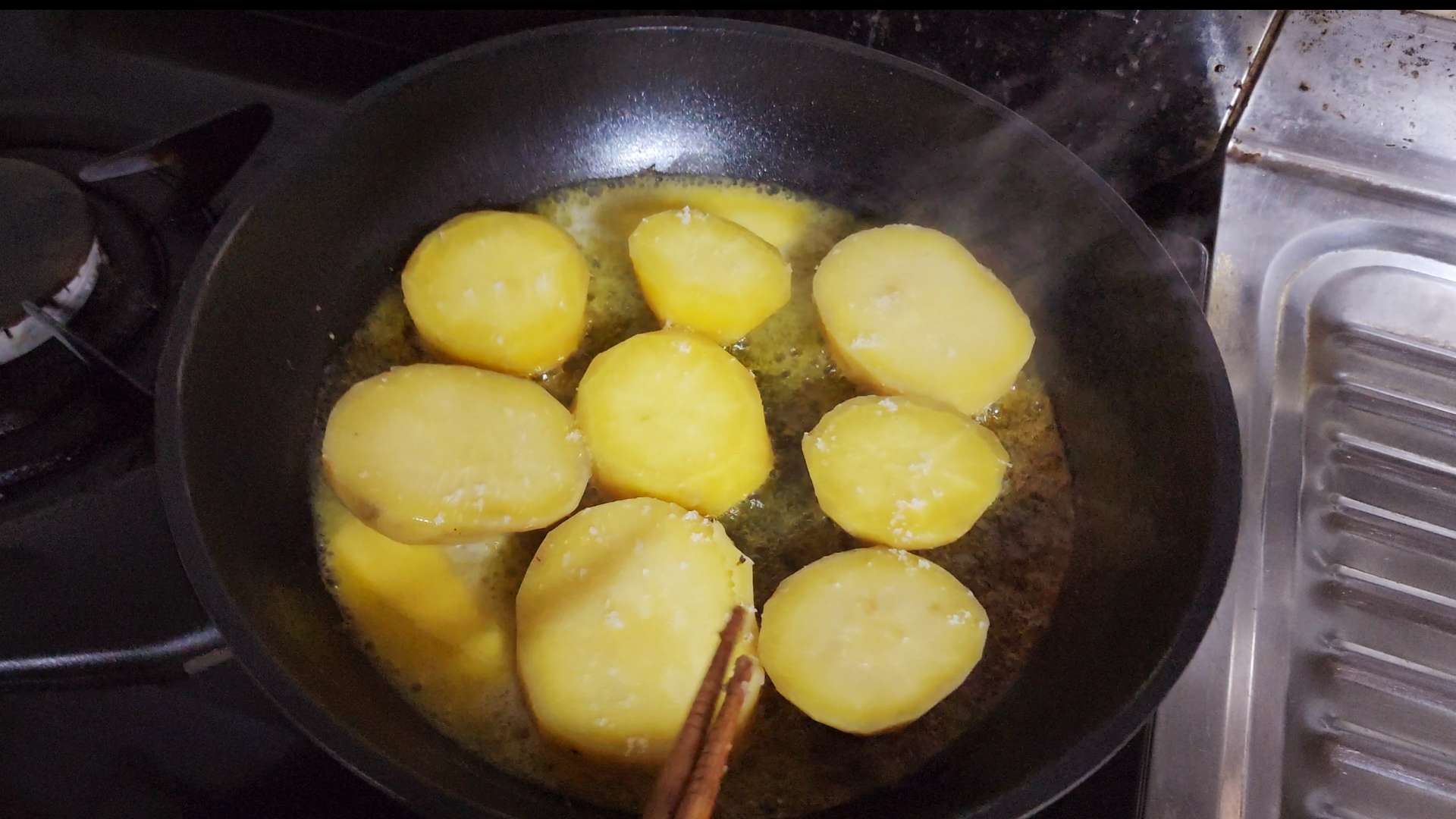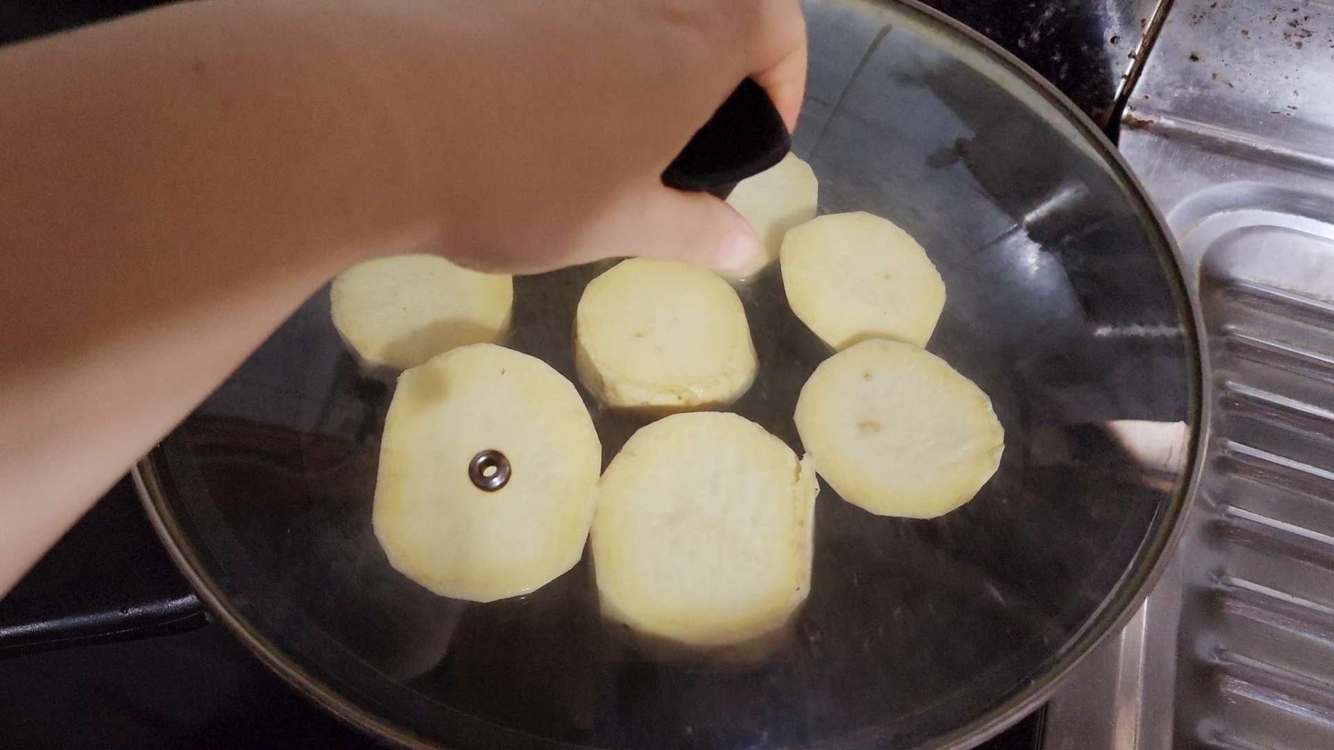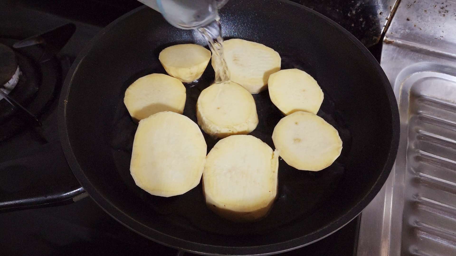 팬은 중불로 예열해 줍니다. 마른 팬에 고구마를 올리고 물 200ml를 넣고 뚜껑을 덮어 물이 졸아들 때까지 익혀줍니다.
