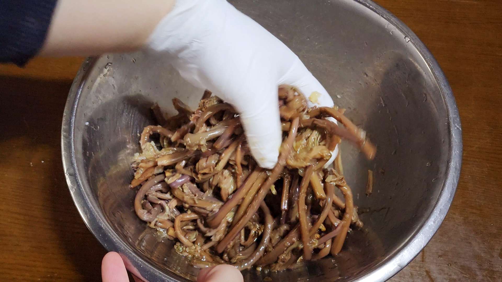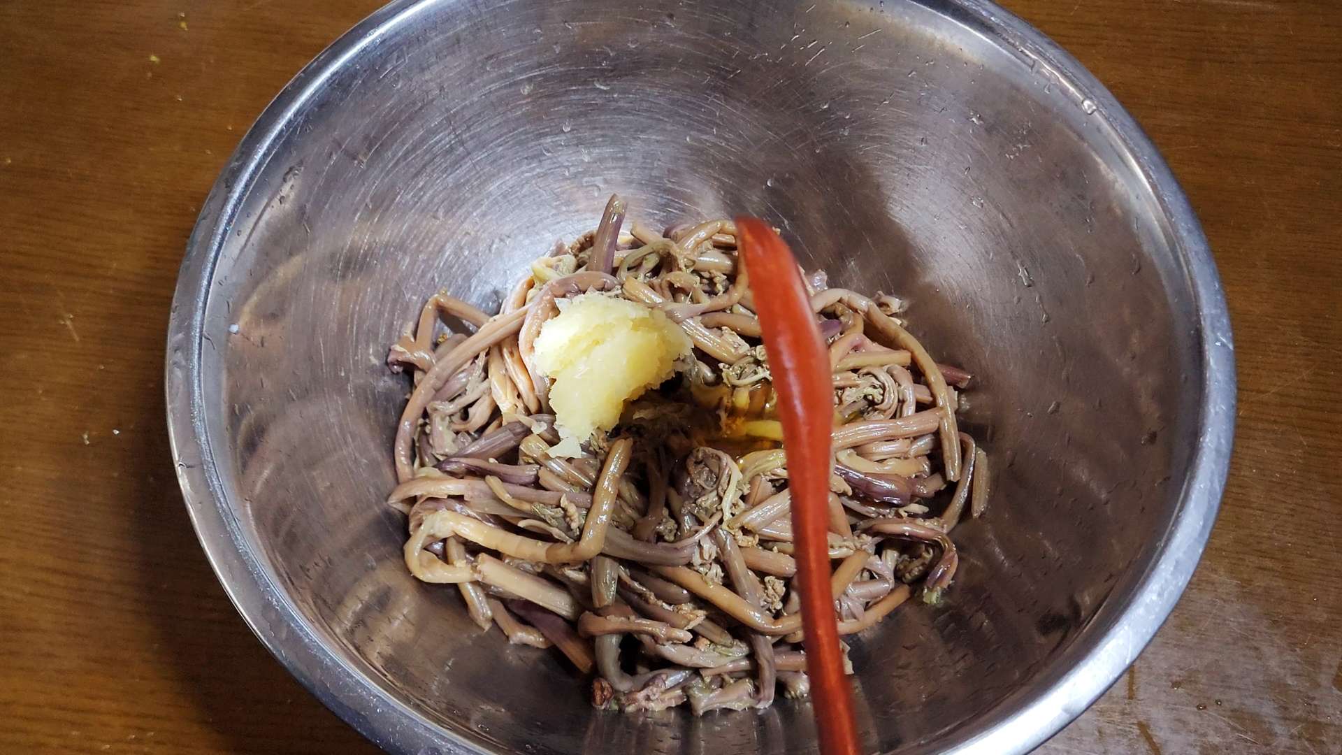 고사리, 국간장 2T, 다진 마늘 0.5T, 참기름 1T을 넣고 무쳐줍니다.