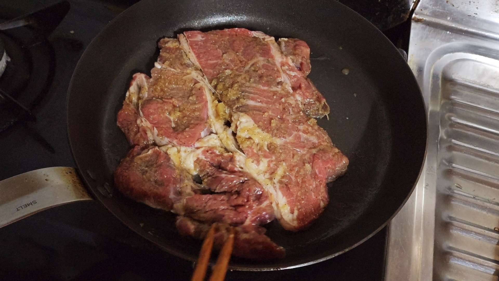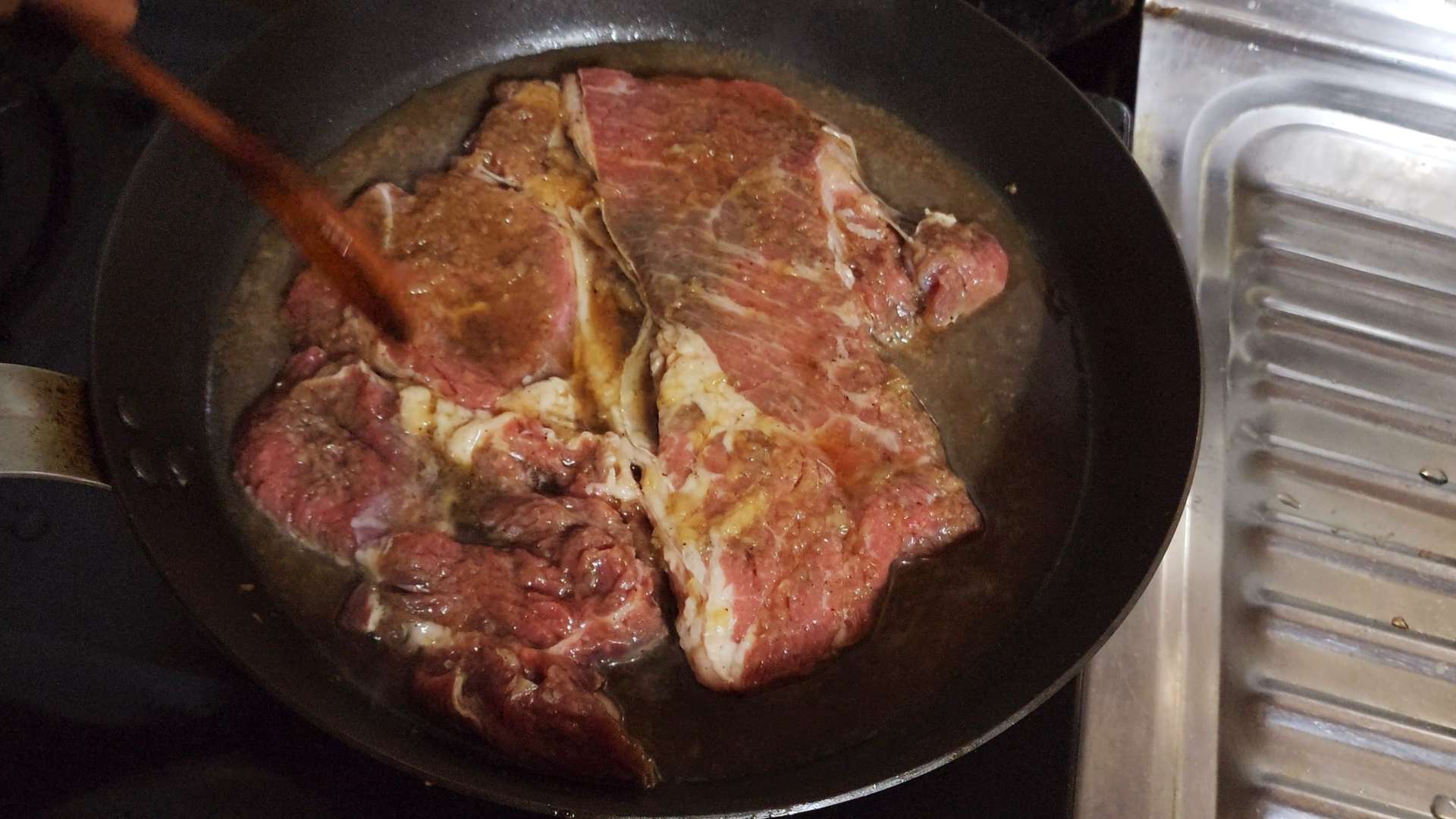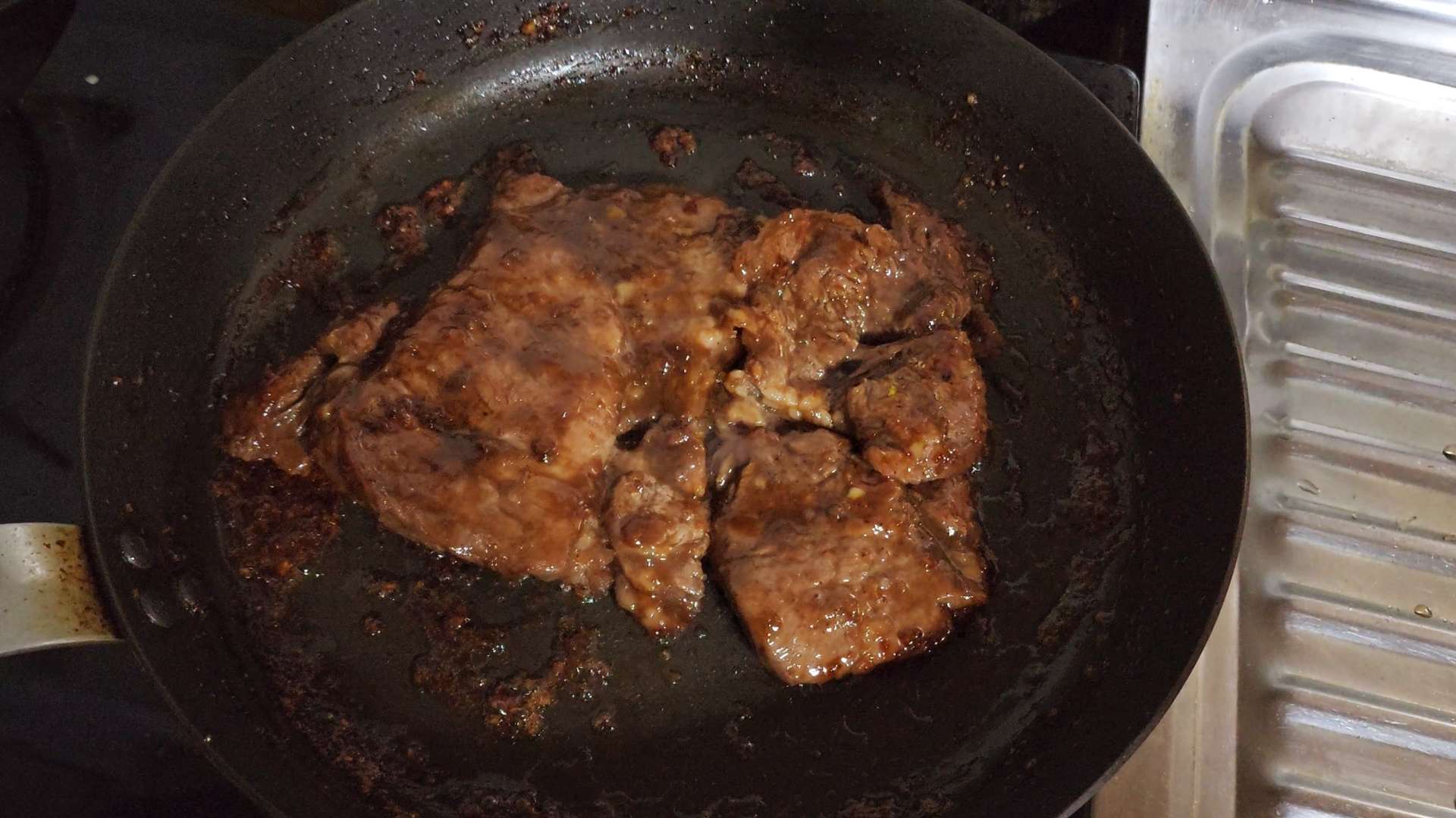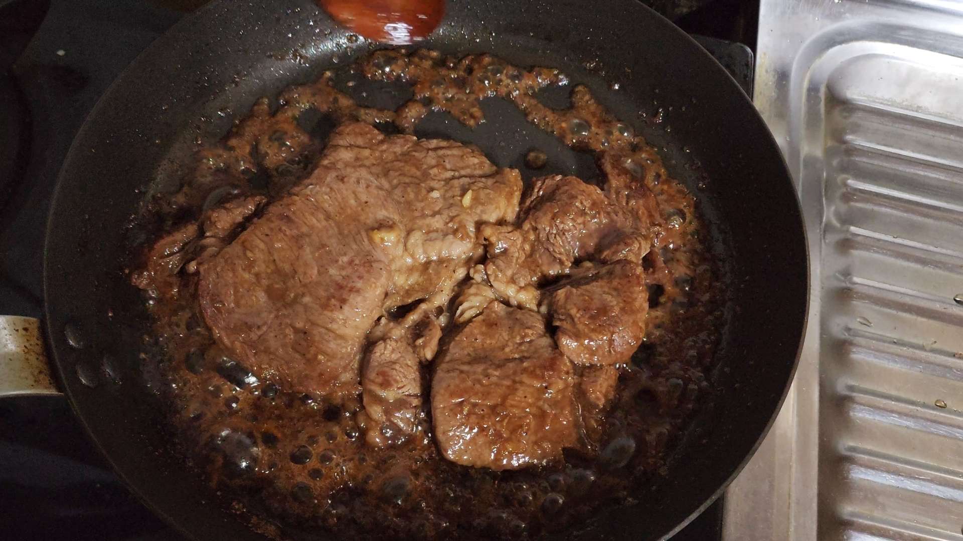 중불로 달군팬에 양념한 고기를 올리고 중약불에서 익혀줍니다.