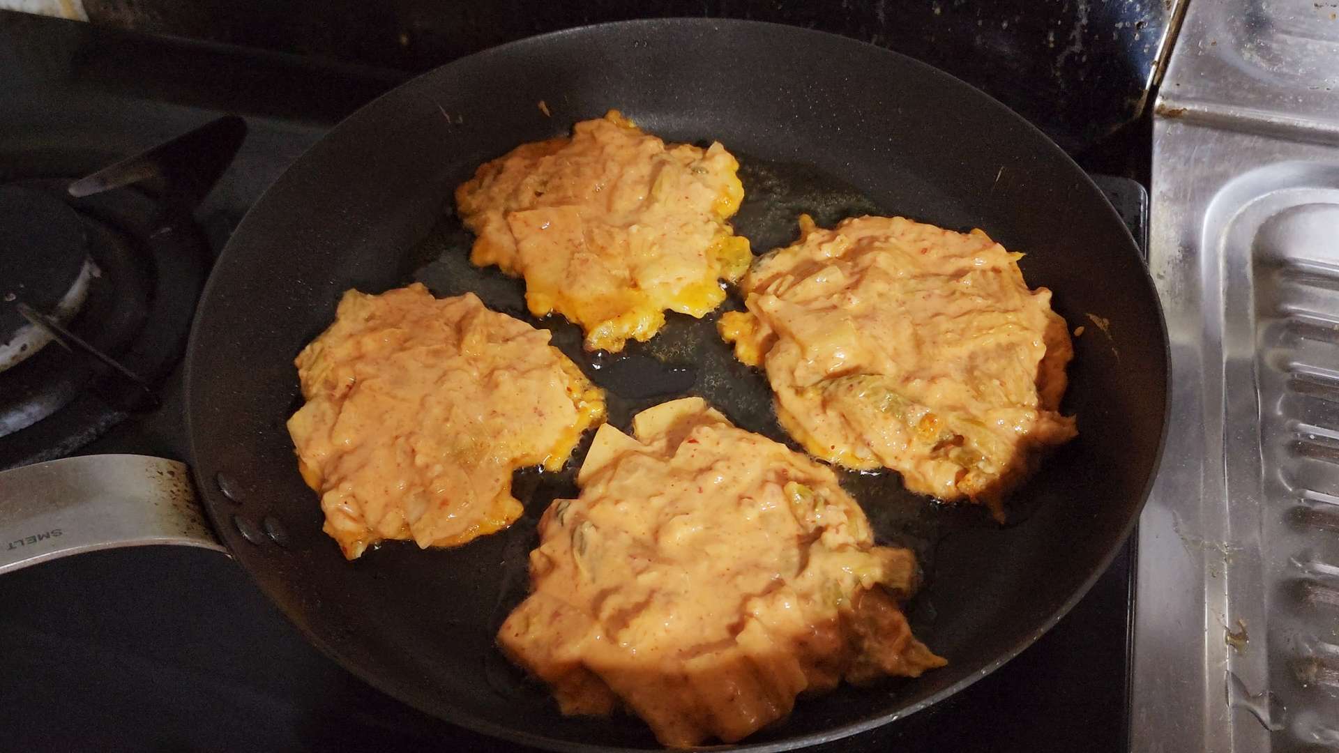 반죽을 올려 앞뒤로 노릇하게 구워줍니다.