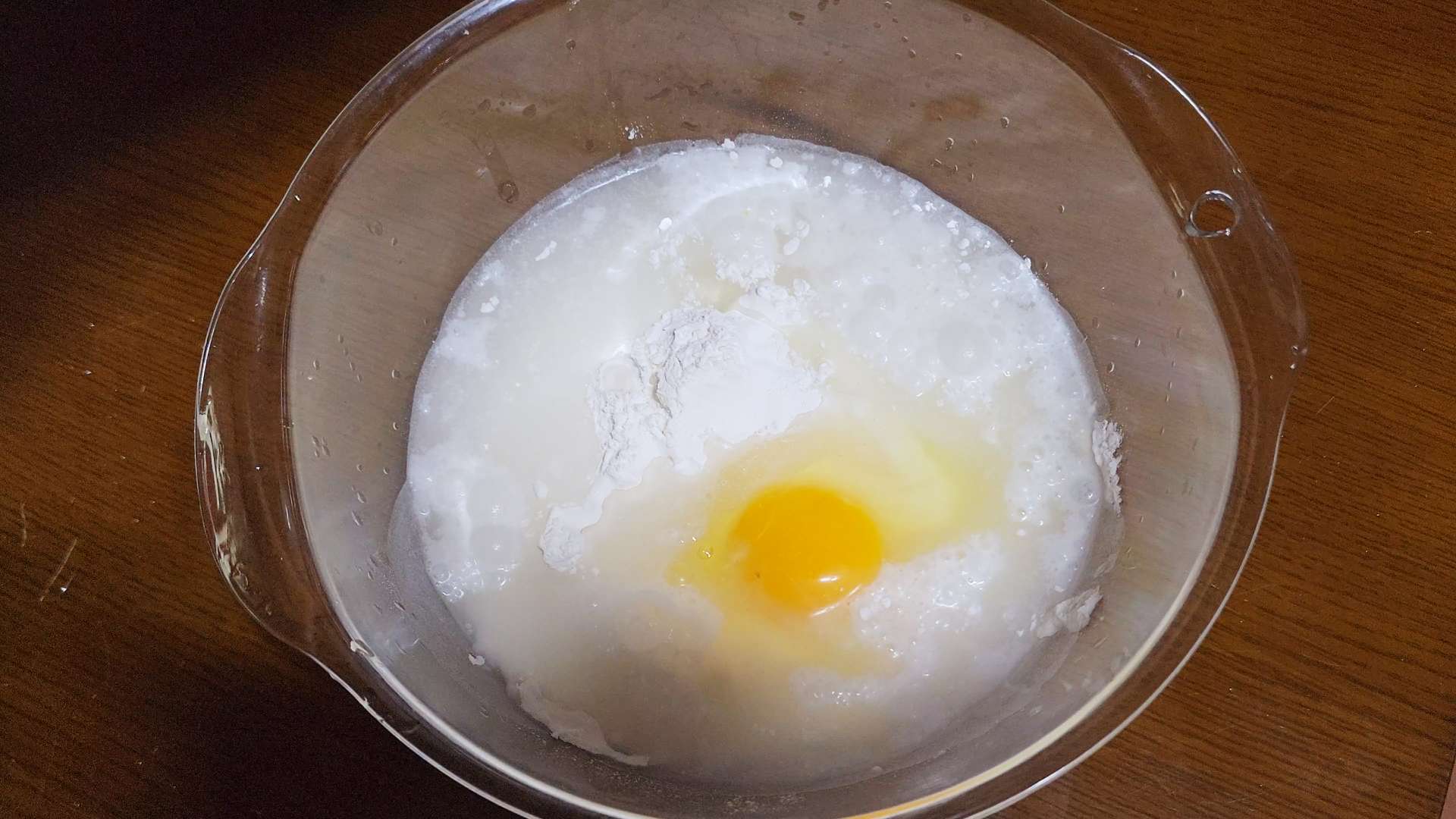 볼에 부침가루 1컵, 물, 달걀 1개를 섞어줍니다.