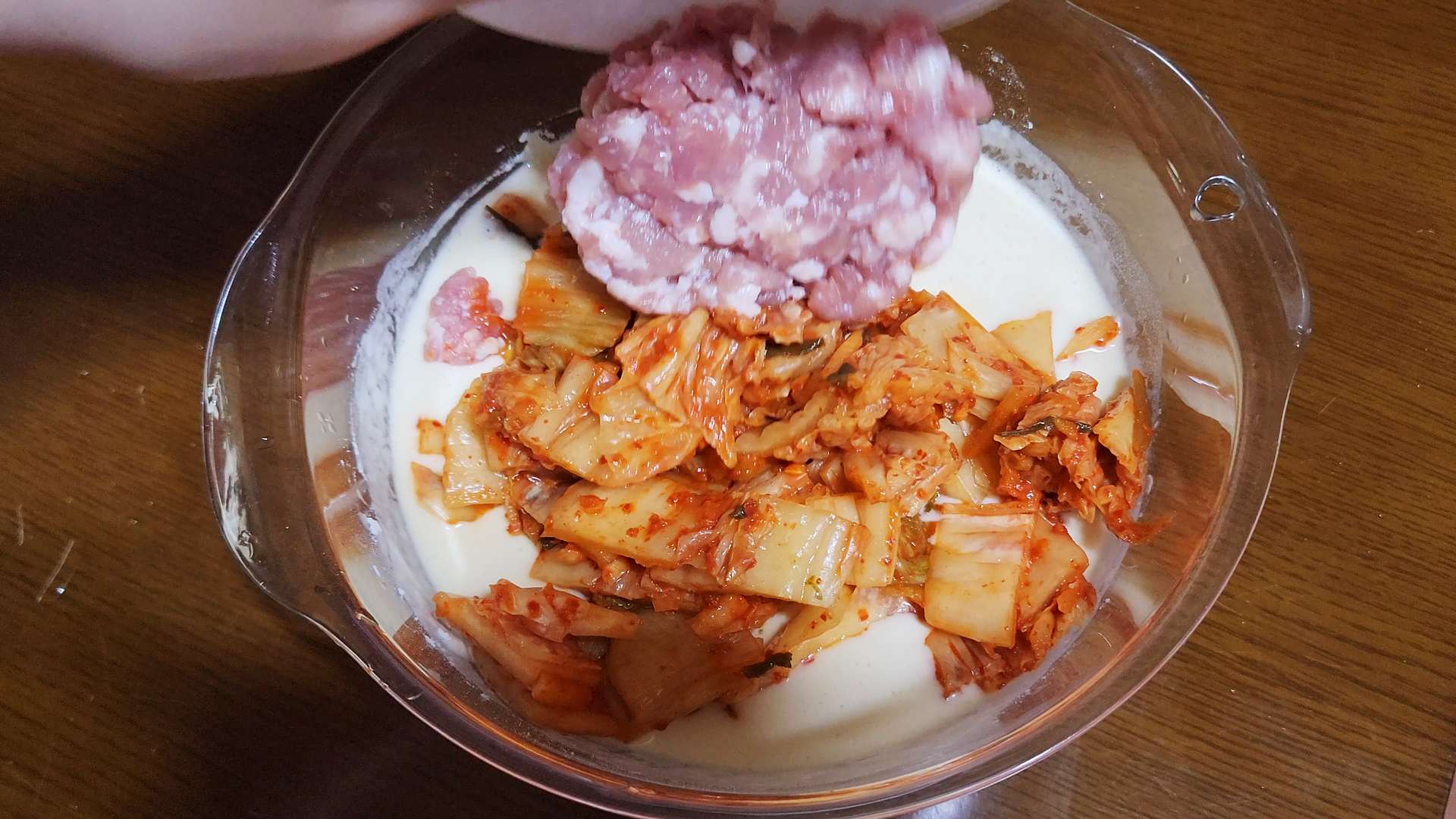 재료: 배추김치 1/4포기, 김칫국물 3T, 다진돼지고기 100g, 부침가루 1컵, 달걀 1개, 물, 식용유
