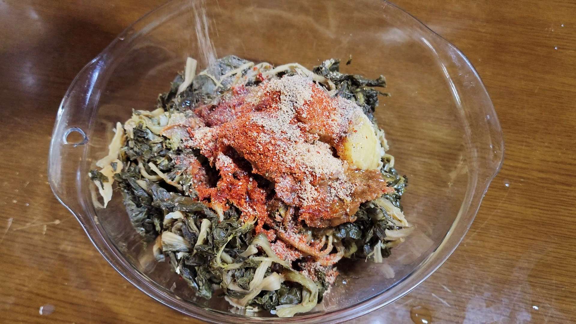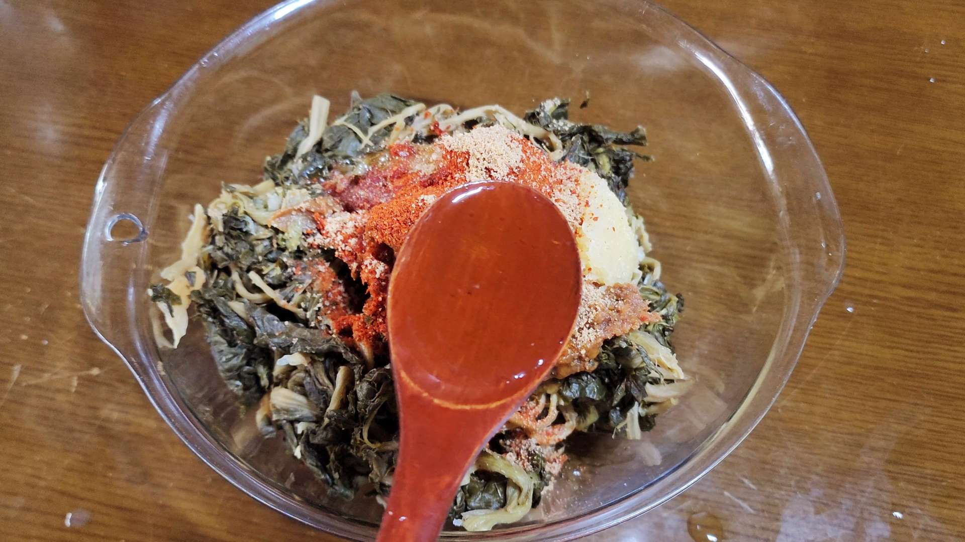 시래기, 된장 2T, 다진마늘 2T, 고춧가루 1T, 소고기 다시다 1T, 들기름 2T, 후추 1t를 넣고 무쳐 20분 재워줍니다.
