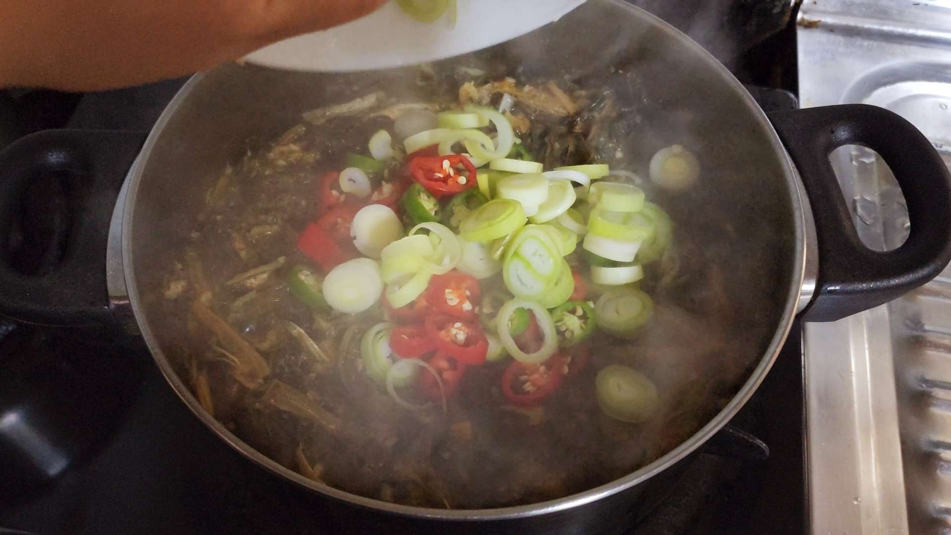 물이 끓으면 시래기를 넣고 강불에서 바글바글 끓여줍니다. 중불로 줄인 후 뚜껑 닫고 10분 동안 뭉근하게 끓여줍니다.