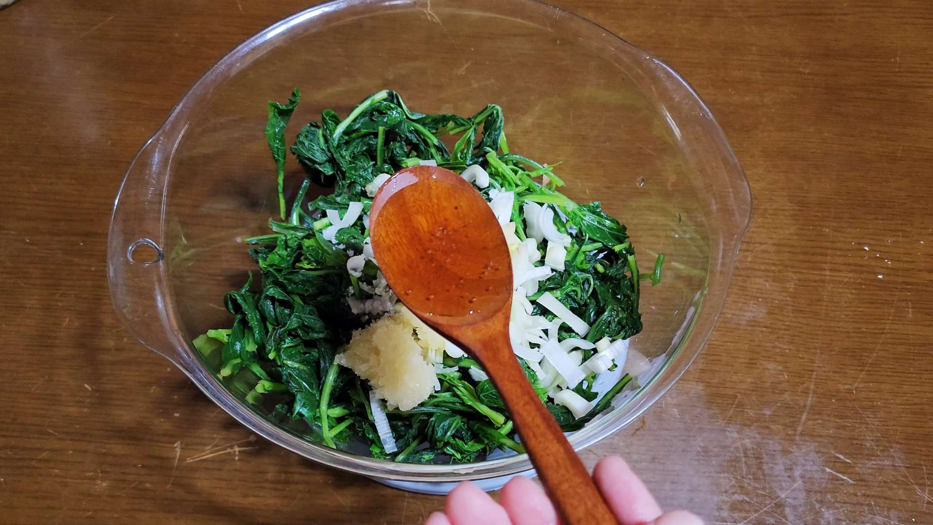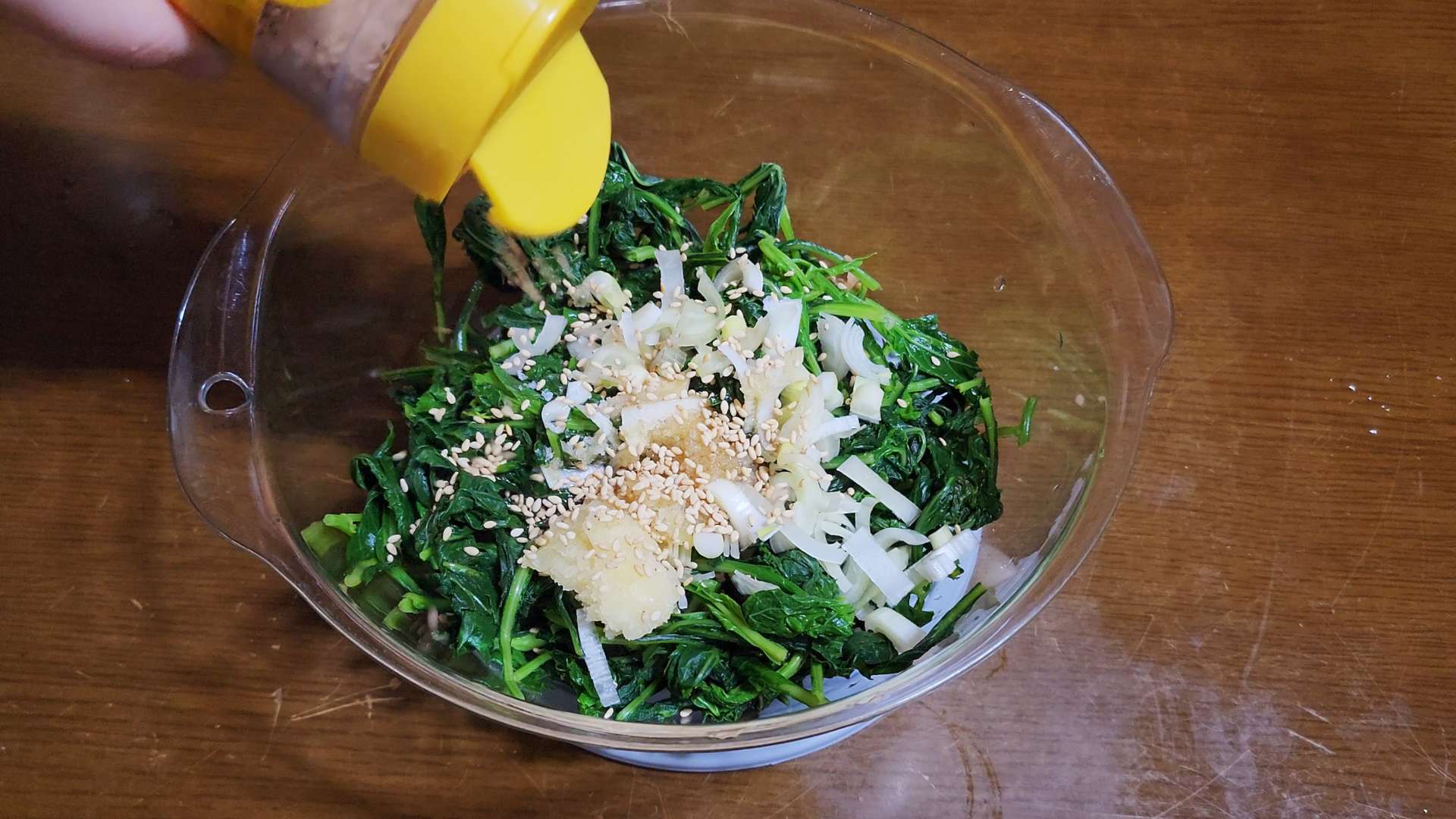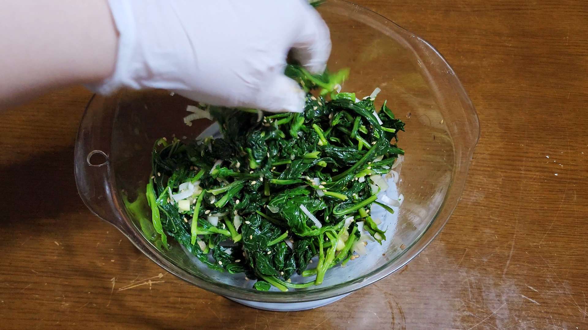 다진 대파 1T, 국간장 1T, 참치액젓 1T, 다진마늘 1T, 참기름 1T, 통깨를 넣고 조물조물 무쳐줍니다.
