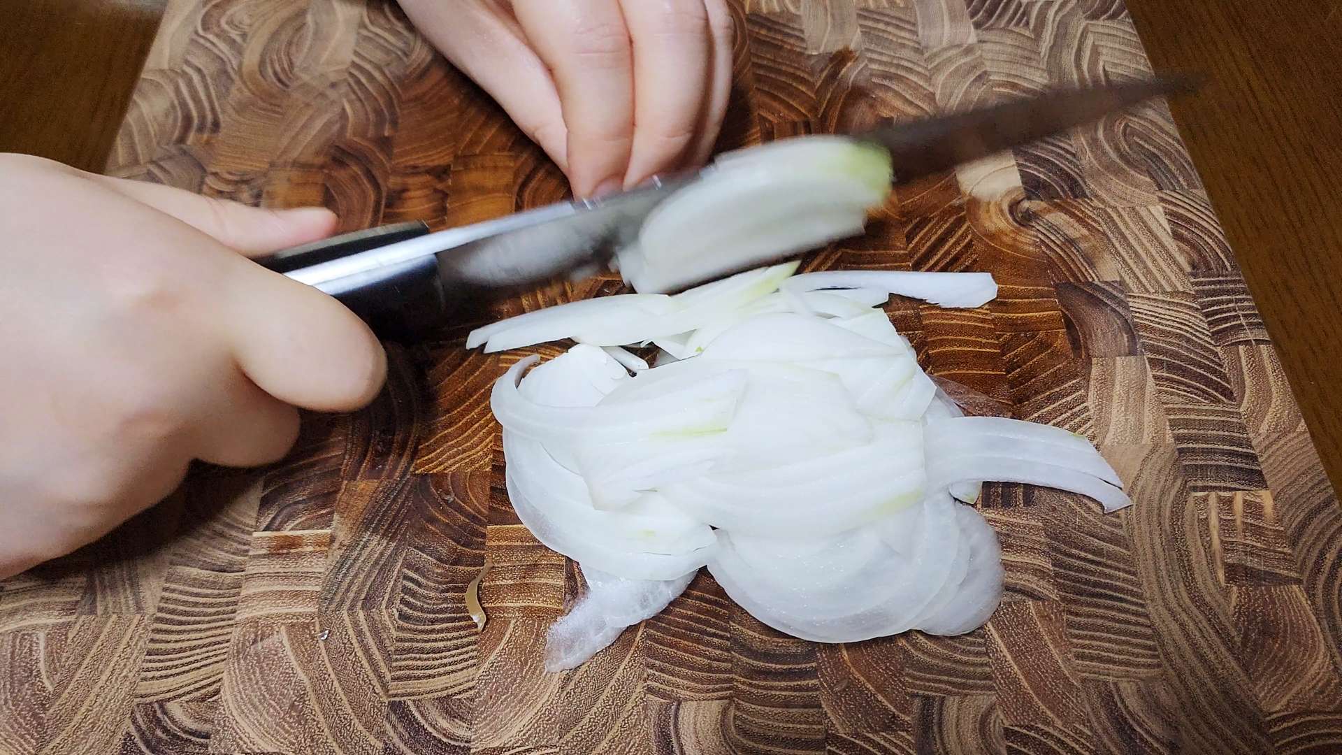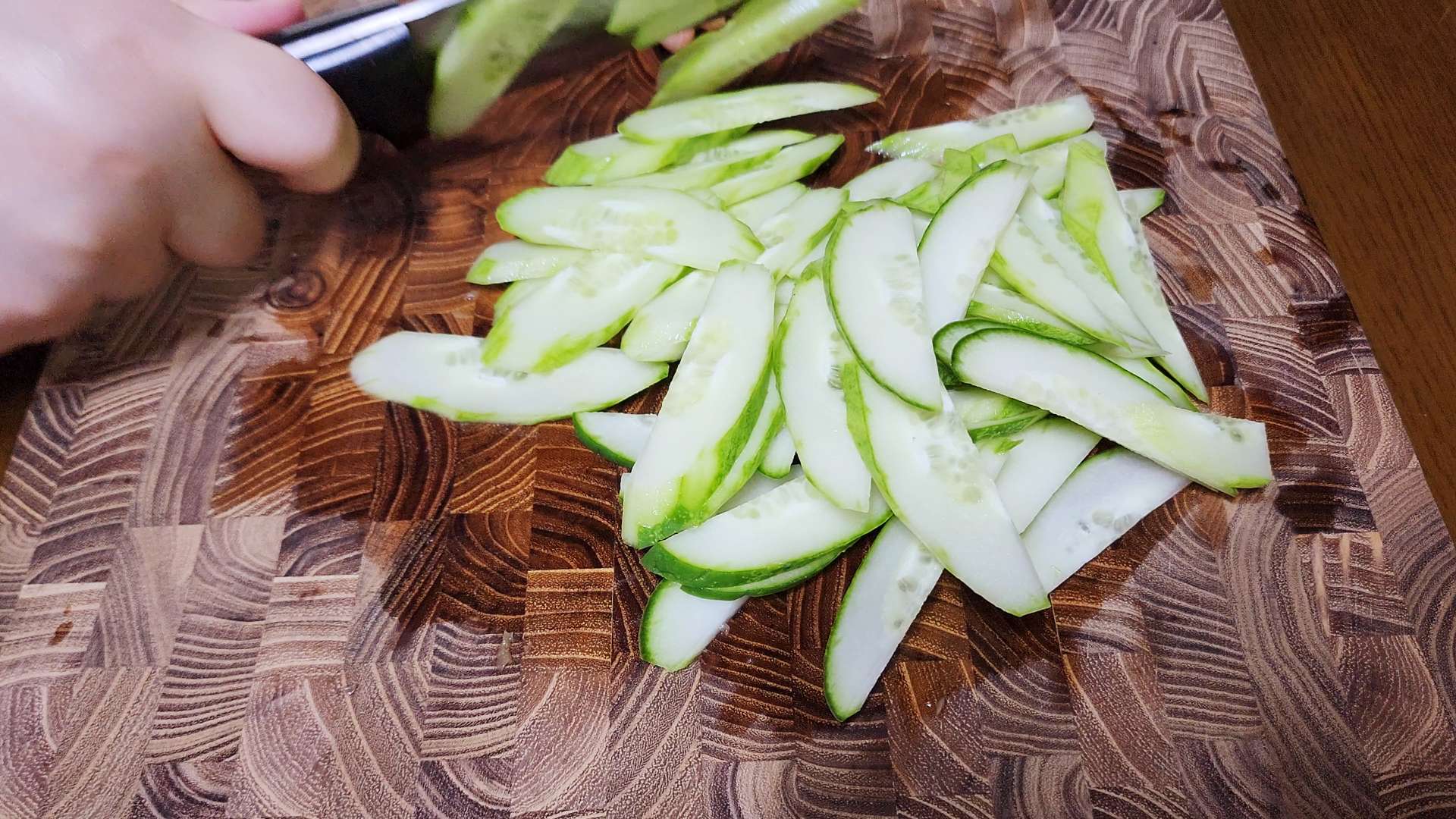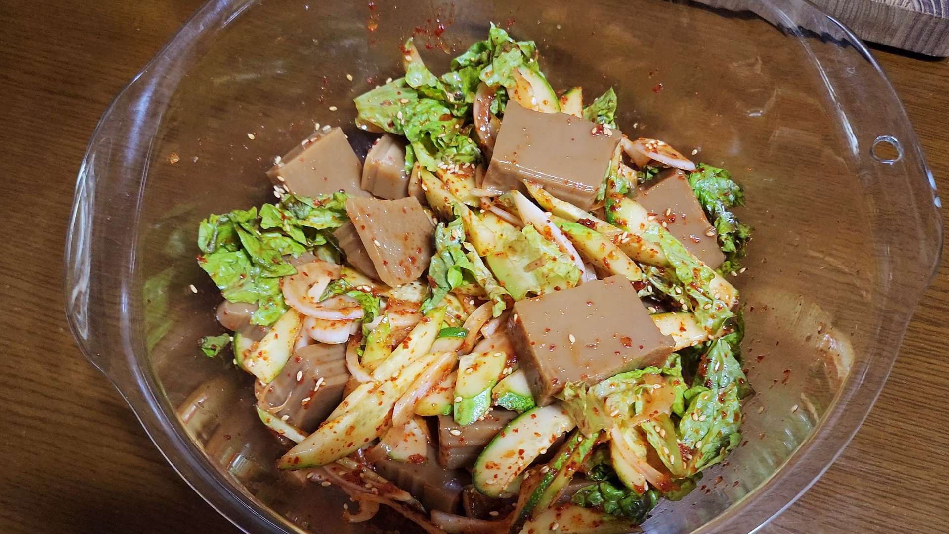 재료: 도토리묵 1모 (400g), 상추 5장, 양파 1/2개, 오이 1개, 통깨
